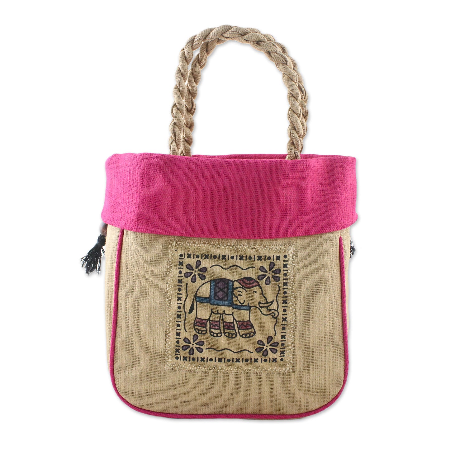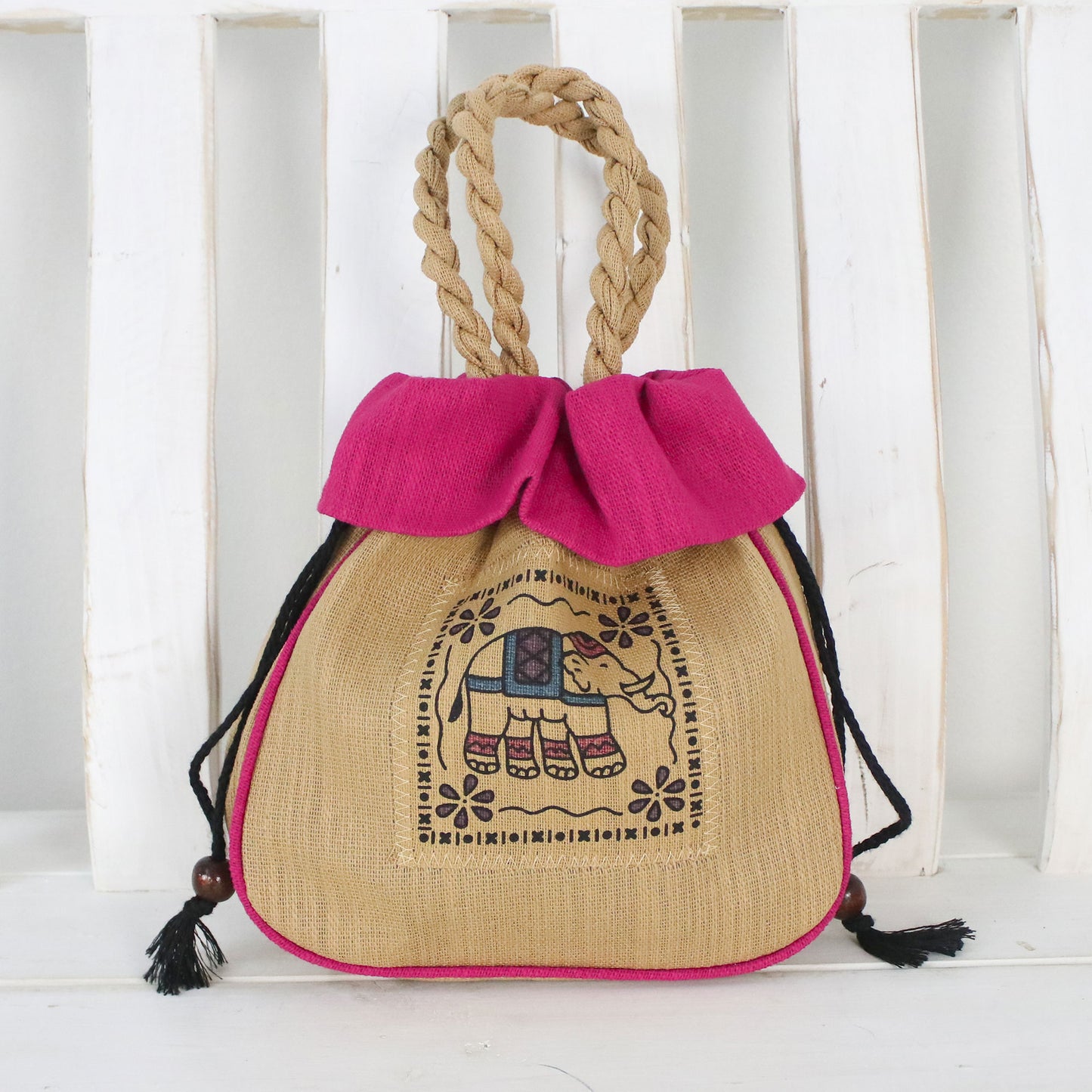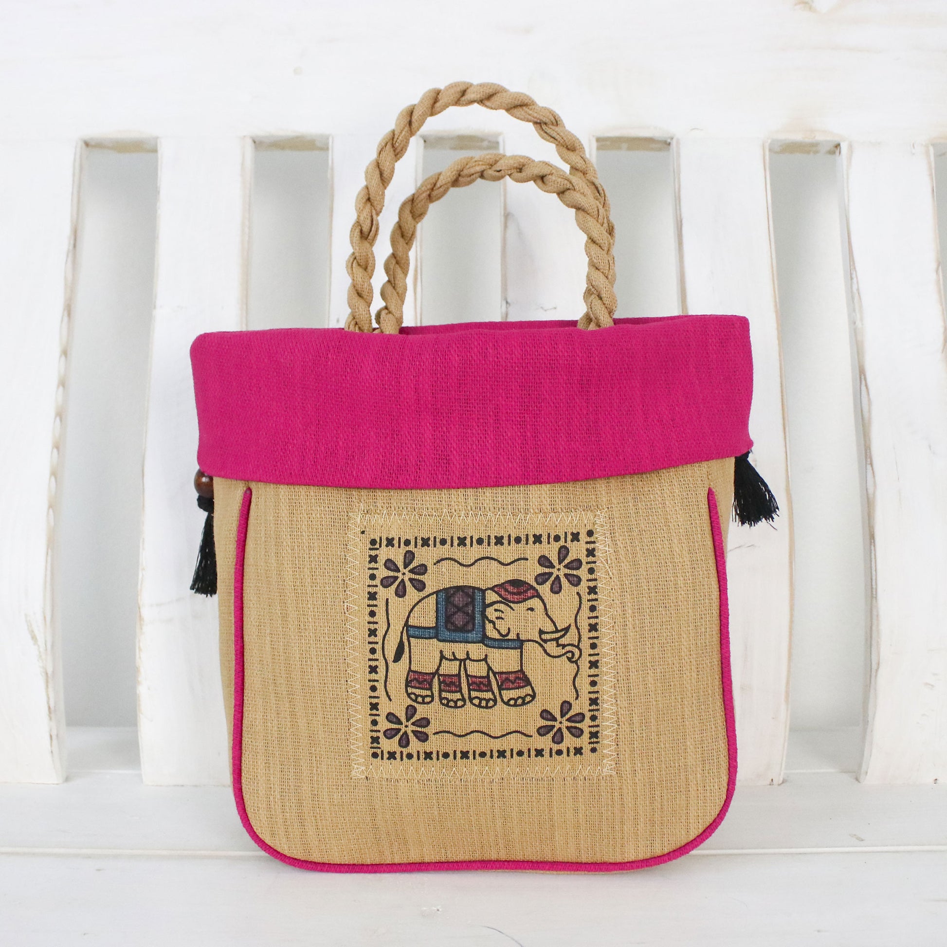 This original handbag design by Boonju Odton, featuring two braided handles, draws inspiration from the incredible grace and dexterity of elephants. She handcrafts the bag of cotton, featuring a caramel-colored body with an elephant print on the front. The fuchsia top opens with a drawstring, revealing a cotton lining with a single zipper pocket on the inside.