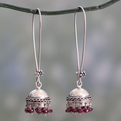 Alok Jain in India presents this pretty pair of sterling silver dangle earrings, crafted in the traditional jhumki style of the India of yesteryear. Dainty garnet rondels are suspended from sterling domes with a combination of oxidized and polished finishes.