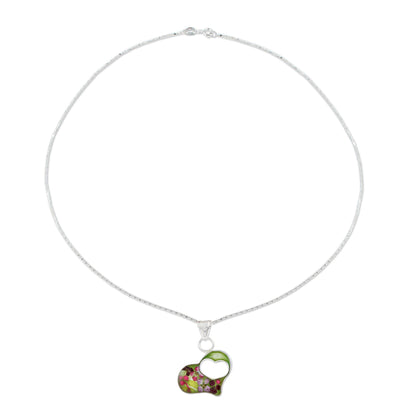Green Flowered Heart Double Heart Sterling Silver and Resin Pendant Necklace
