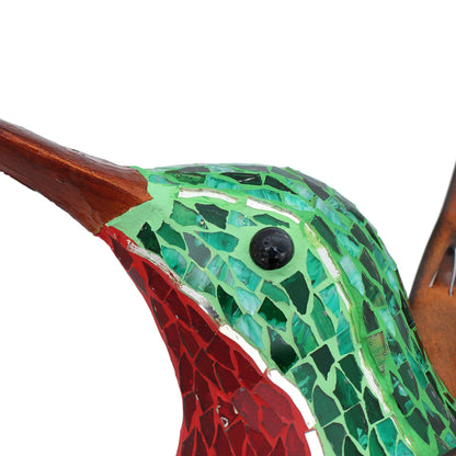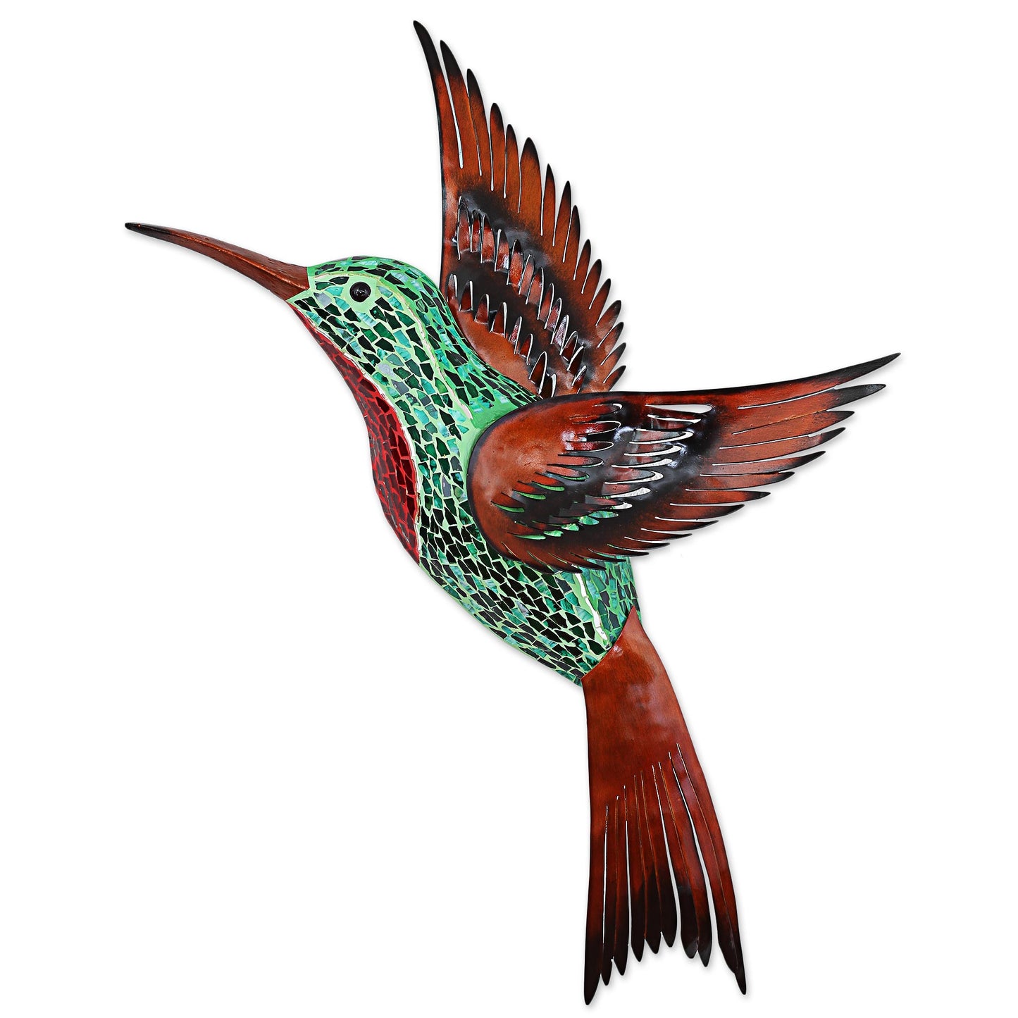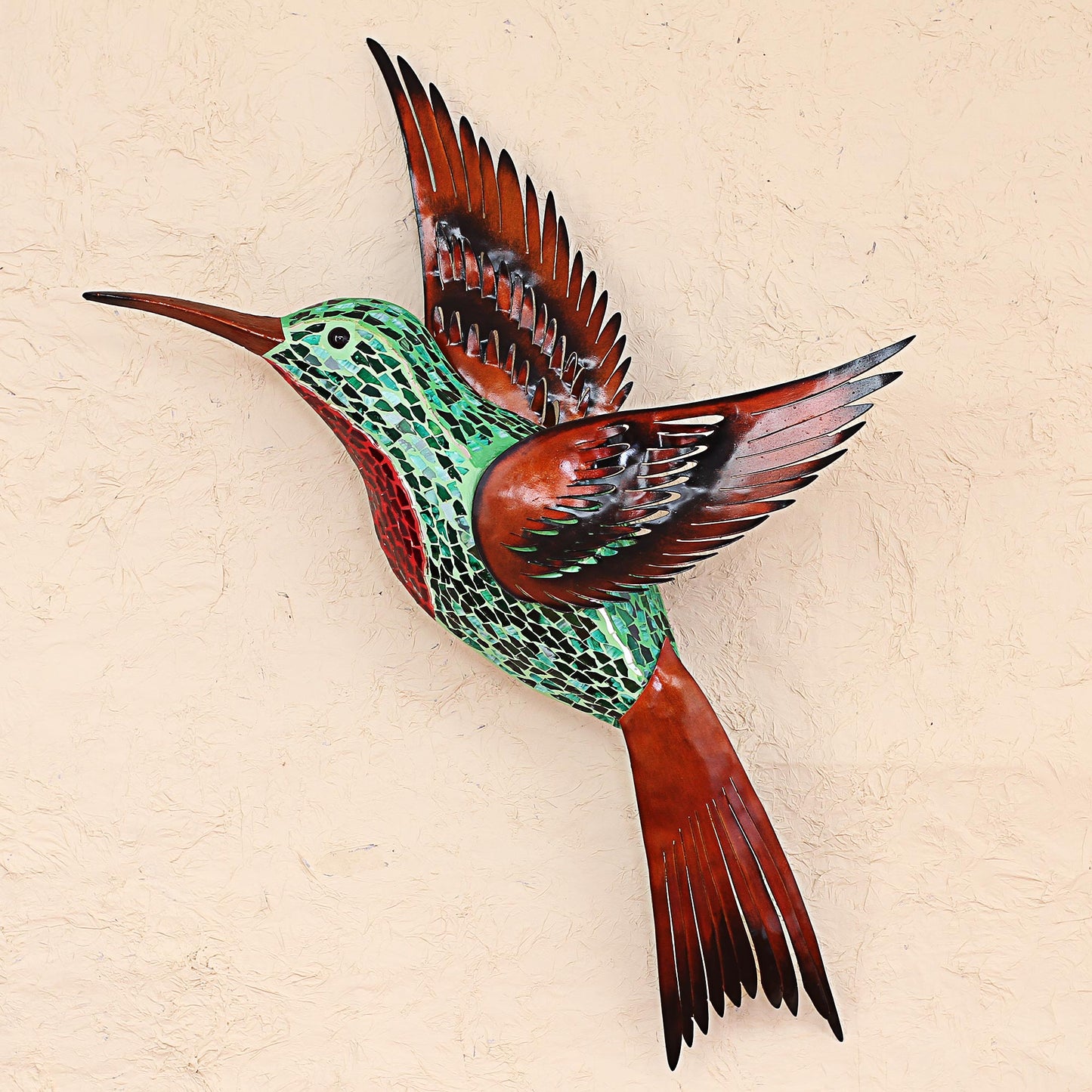 A green hummingbird hovers on whirring wings in a handcrafted wall sculpture by J. Blas. With wings, tail, and beak made from specially cut and painted steel, the handcrafted image features a glass mosaic body and a glass bead for the eye.