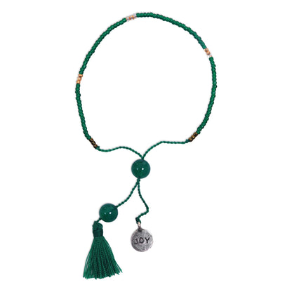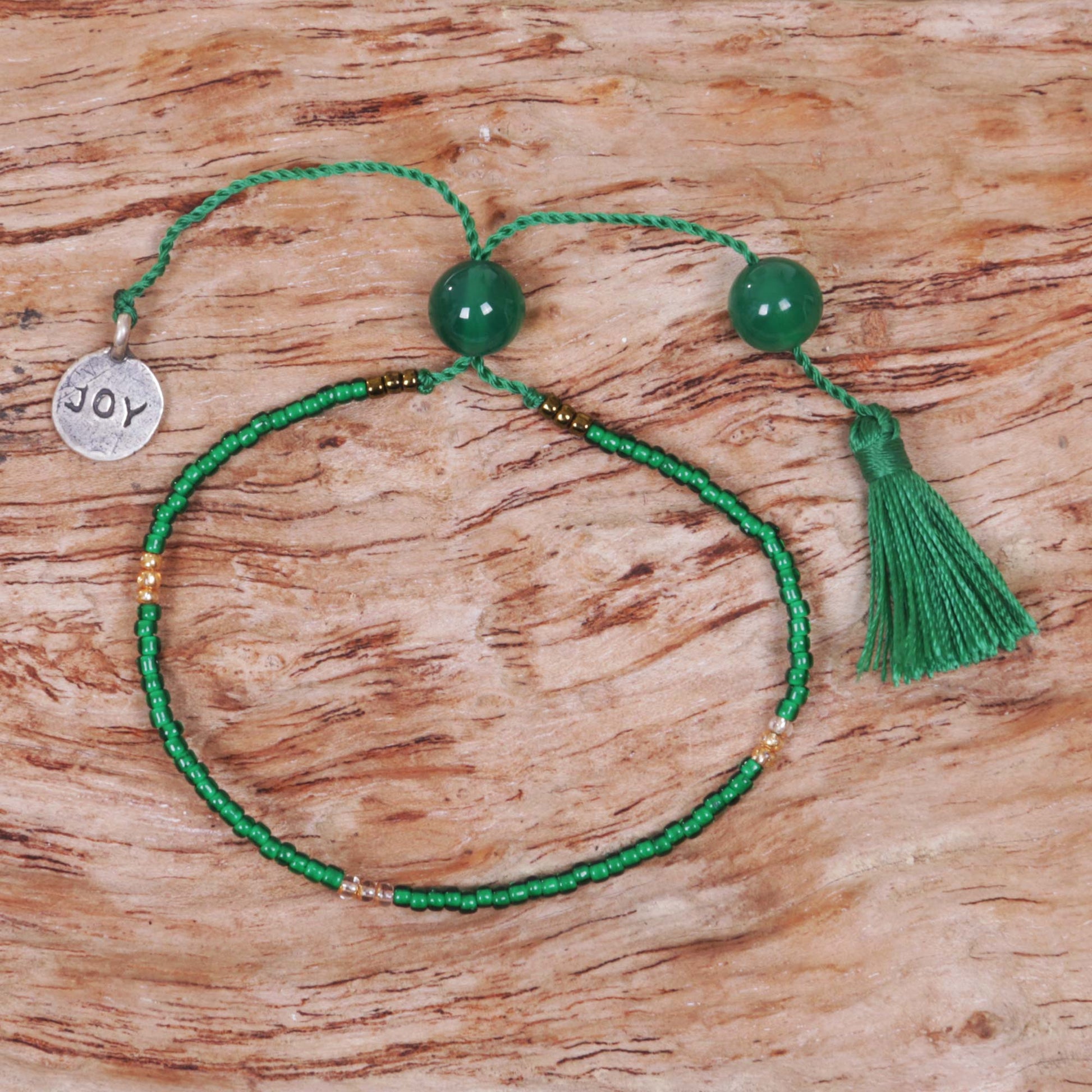 Surround yourself with joy while wearing this delicate handmade bead bracelet. Green glass beads are strung together to form this minimalist design, while a sterling silver charm inscribed with the word 'Joy', green quartz beads and a tassel add a touch of whimsy. Indonesian artisan Ketut Sulastri designs jewelry by drawing inspiration from traditional Balinese arts and crafts, which she combines with current trends.