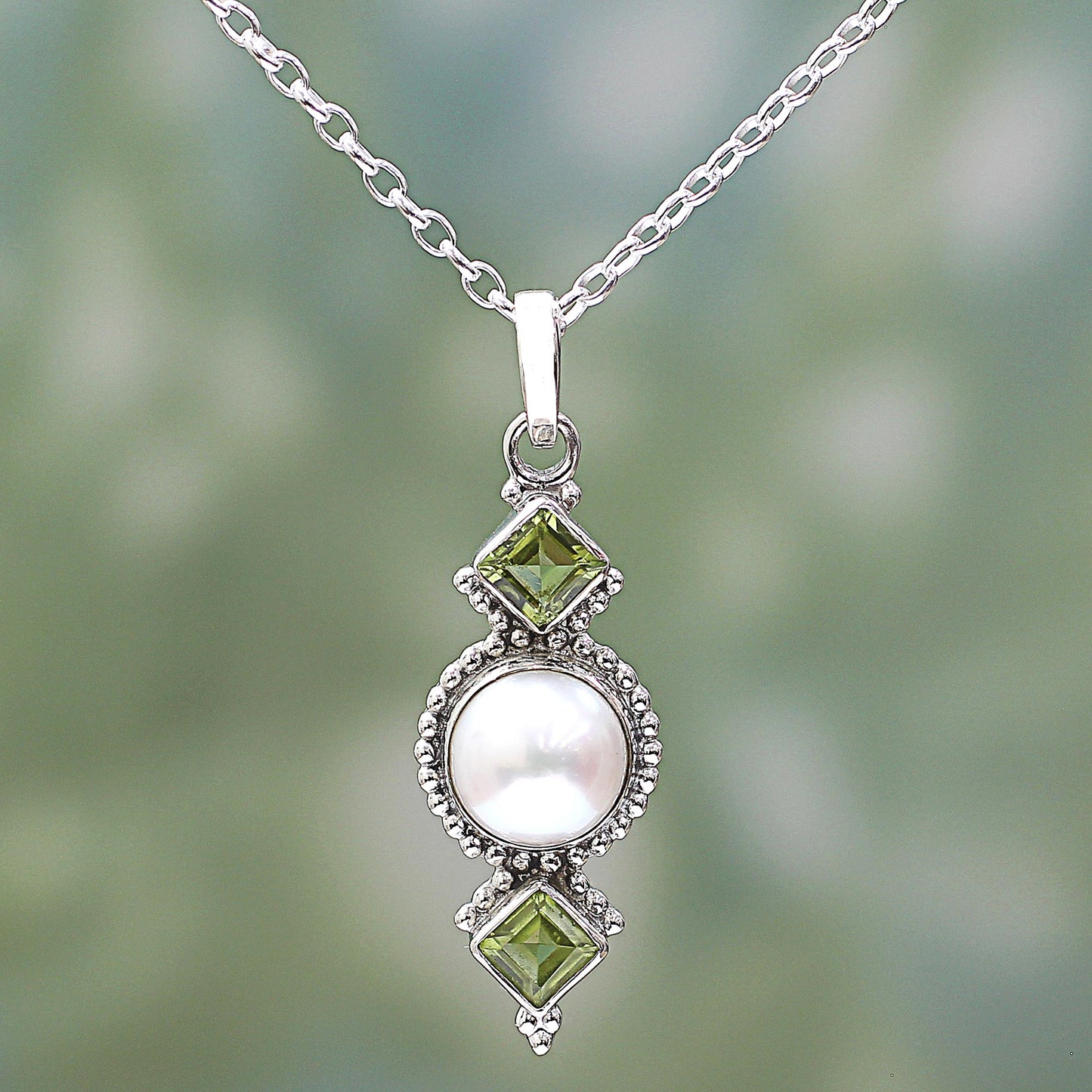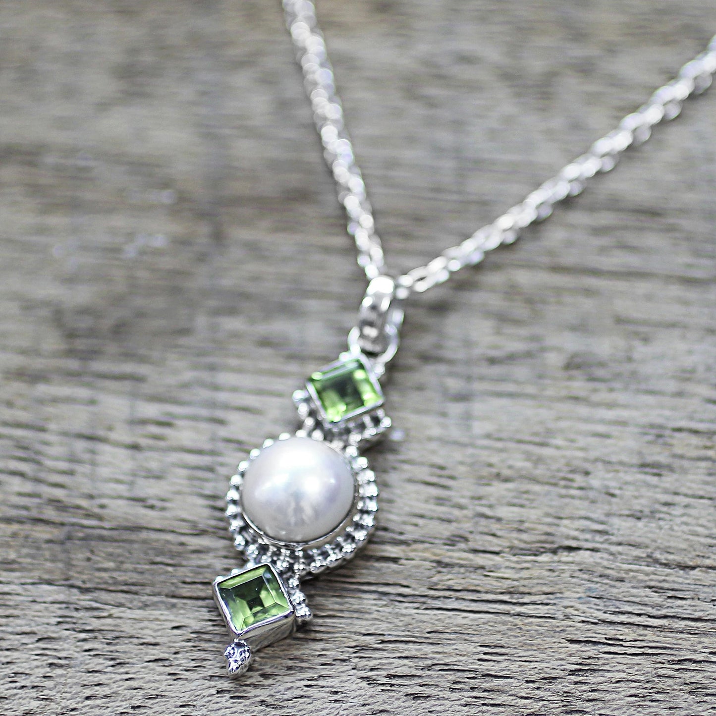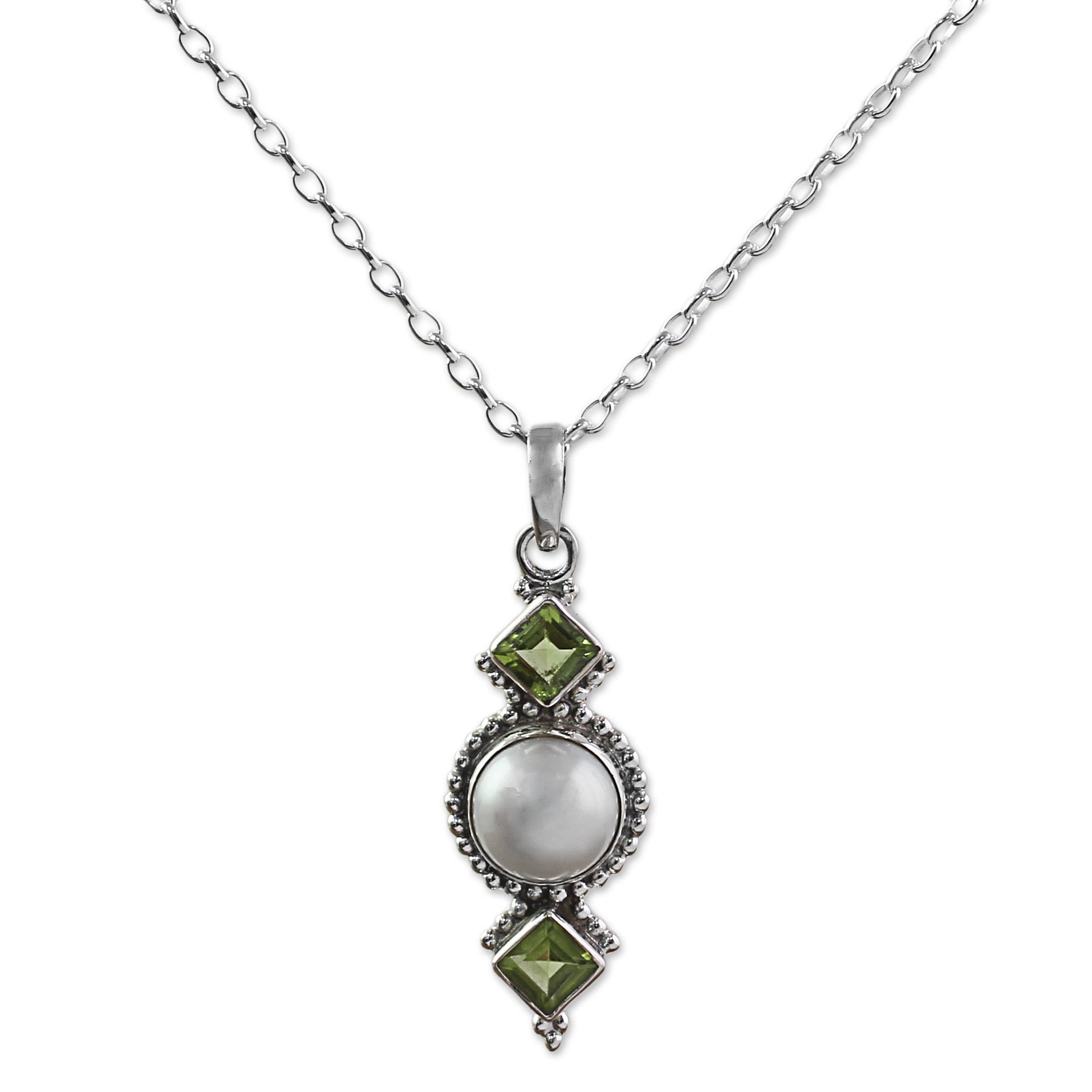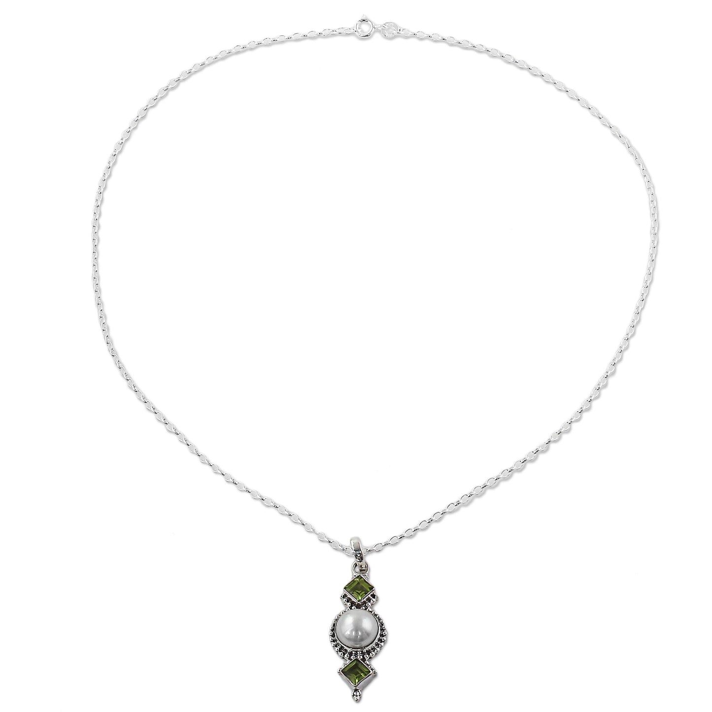 With a passion for the jewelry of her country, India's Neeru Goel presents this necklace. A single cultured pearl glows brilliantly white between two stones of green peridot totaling one carat. With handcrafted dot motifs in sterling silver surrounding the stones.