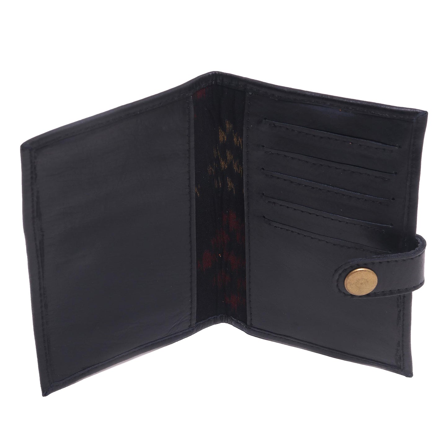 Cloaked in the forever classic of black, this handsome passport wallet is crafted by Bagus Ardhana. The rich brown leather opens to reveal an ikat-print lining. Five convenient slots hold bank cards and business cards an an inner pocket keeps your passport in place. It closes with a snap.
