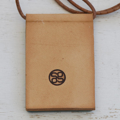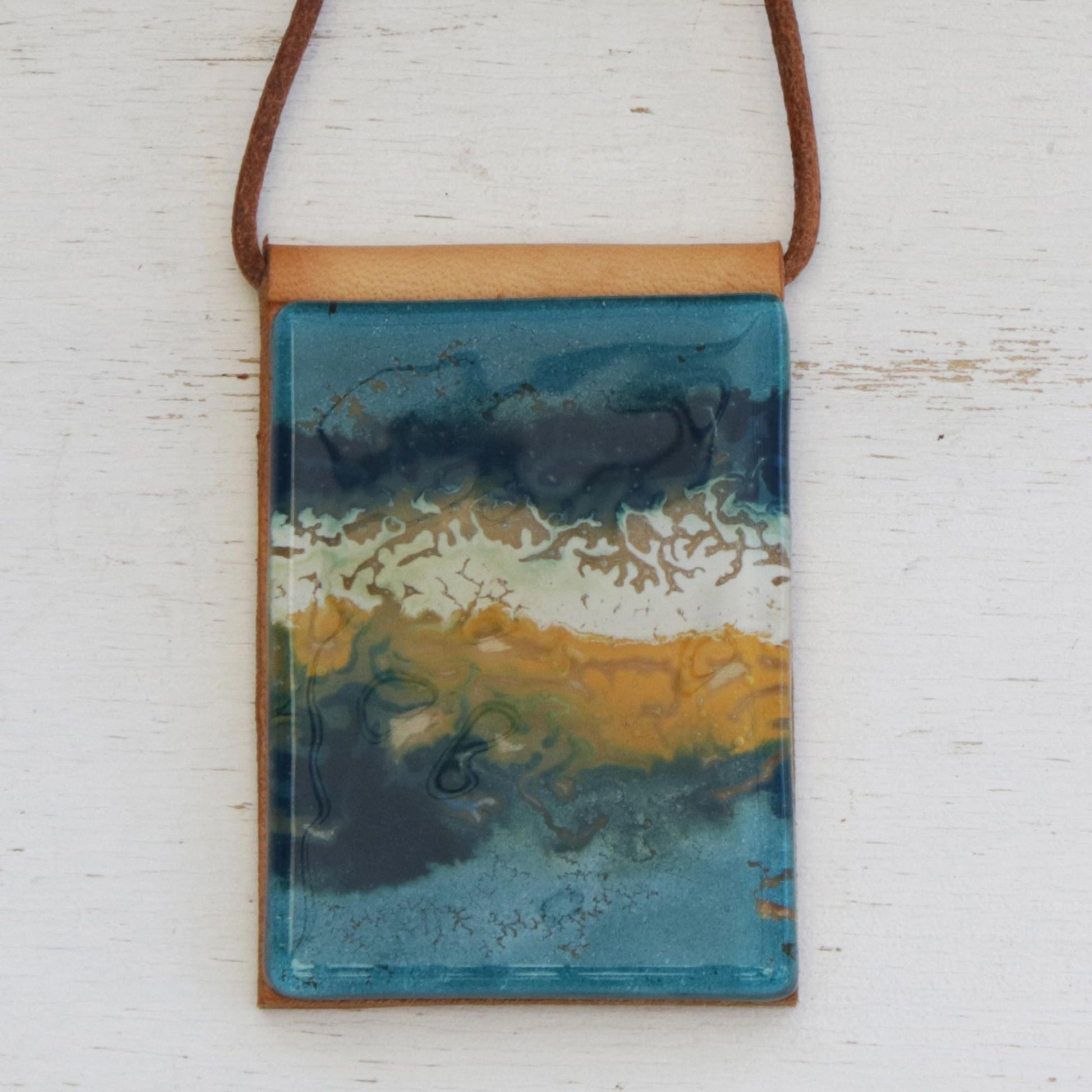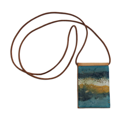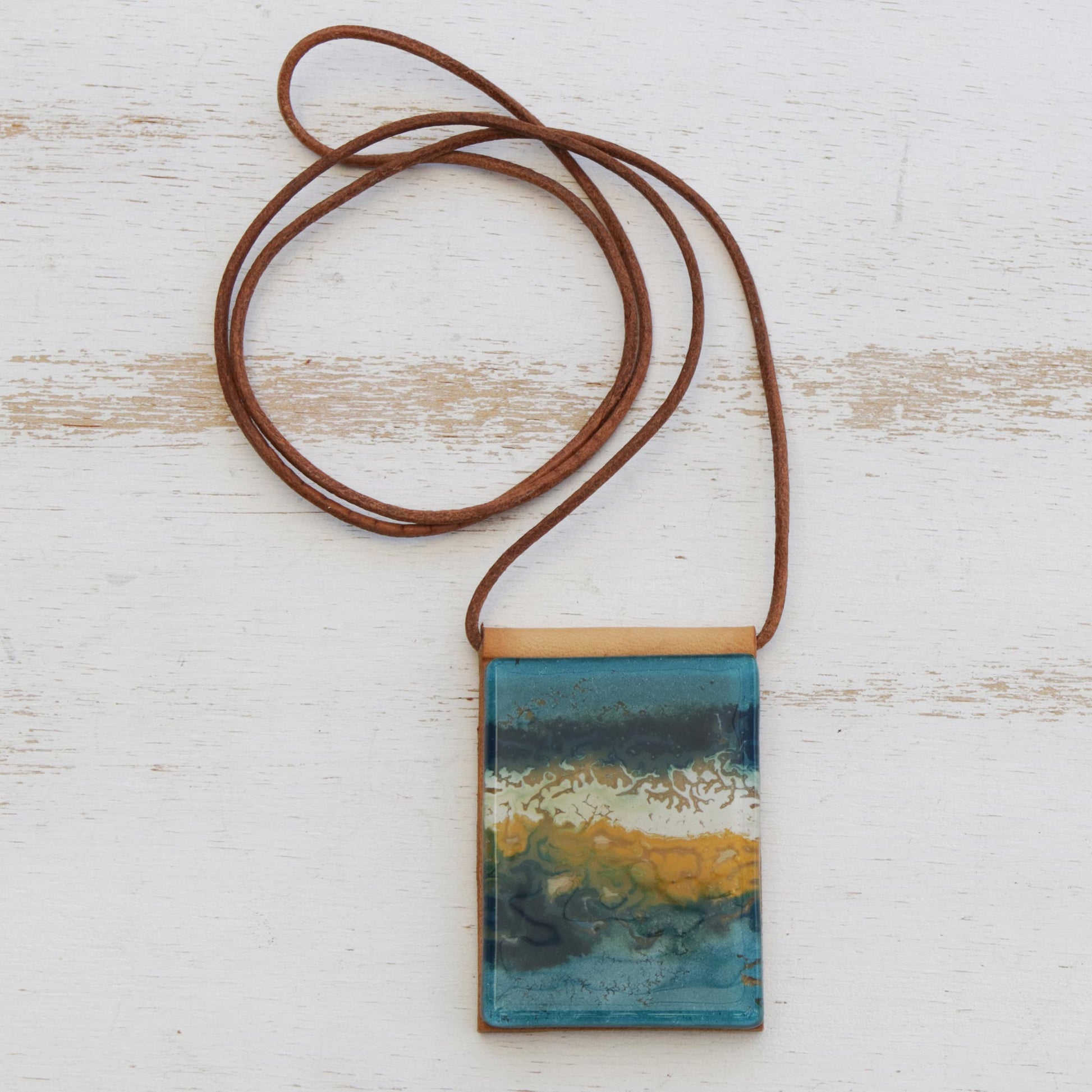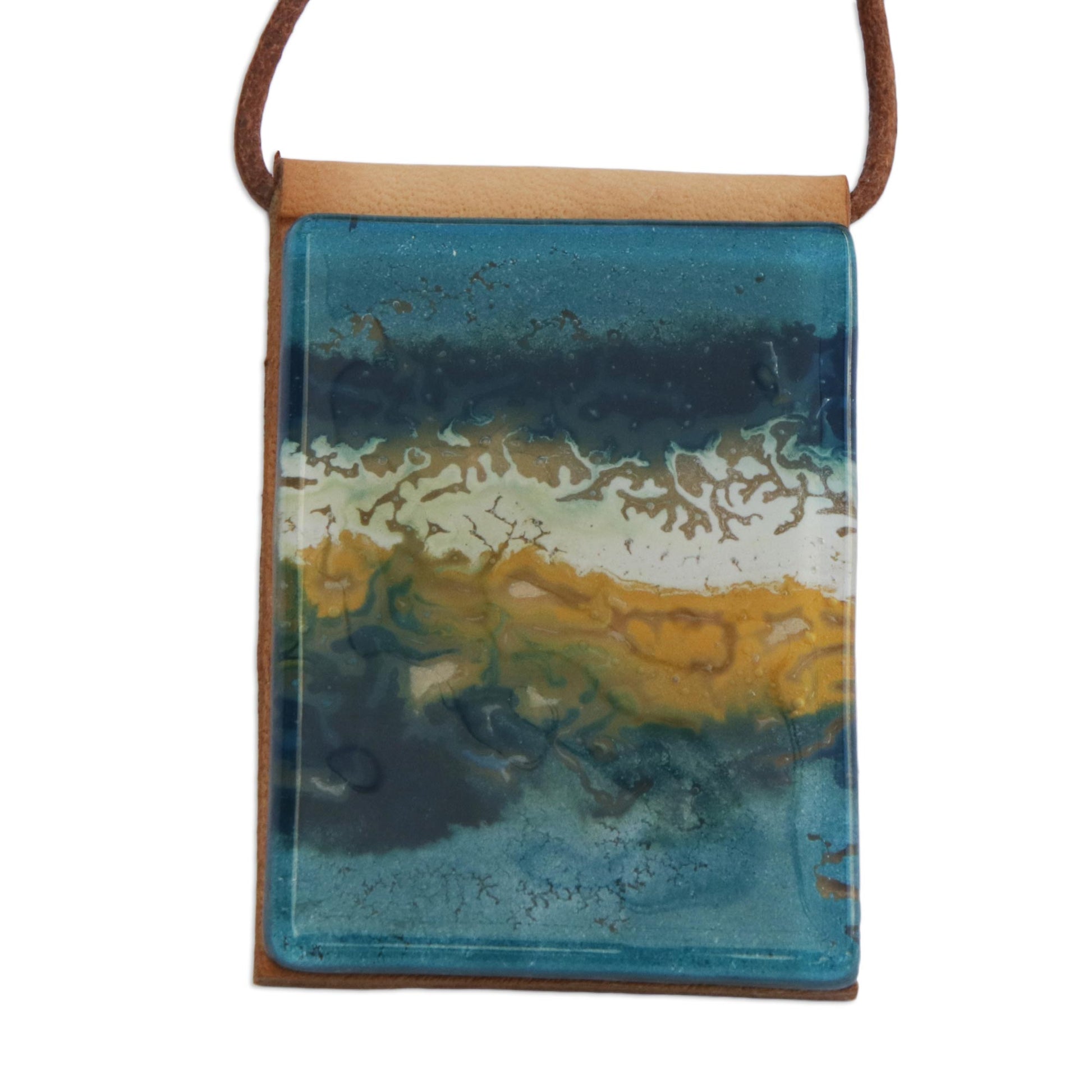 Capturing the beauty of the ocean, hues of blue, yellow, and white are displayed in layers. Brazilian artisan Silvana and João Alexandre design this statement necklace, which features a pendant that is crafted from melted glass. The pigments are added by hand, resulting in a unique composition each time. The glass is displayed on a leather panel, which centers a long leather cord.