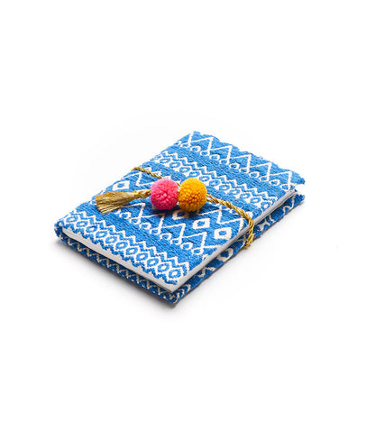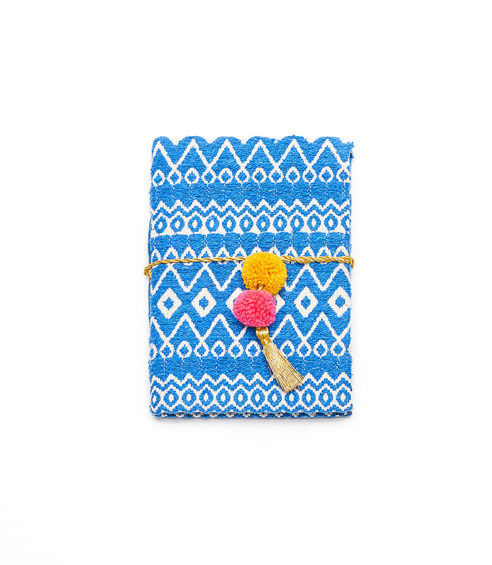 This journal features assorted blue wave motif textile, unlined pages and a colorful pom pom tie closure.