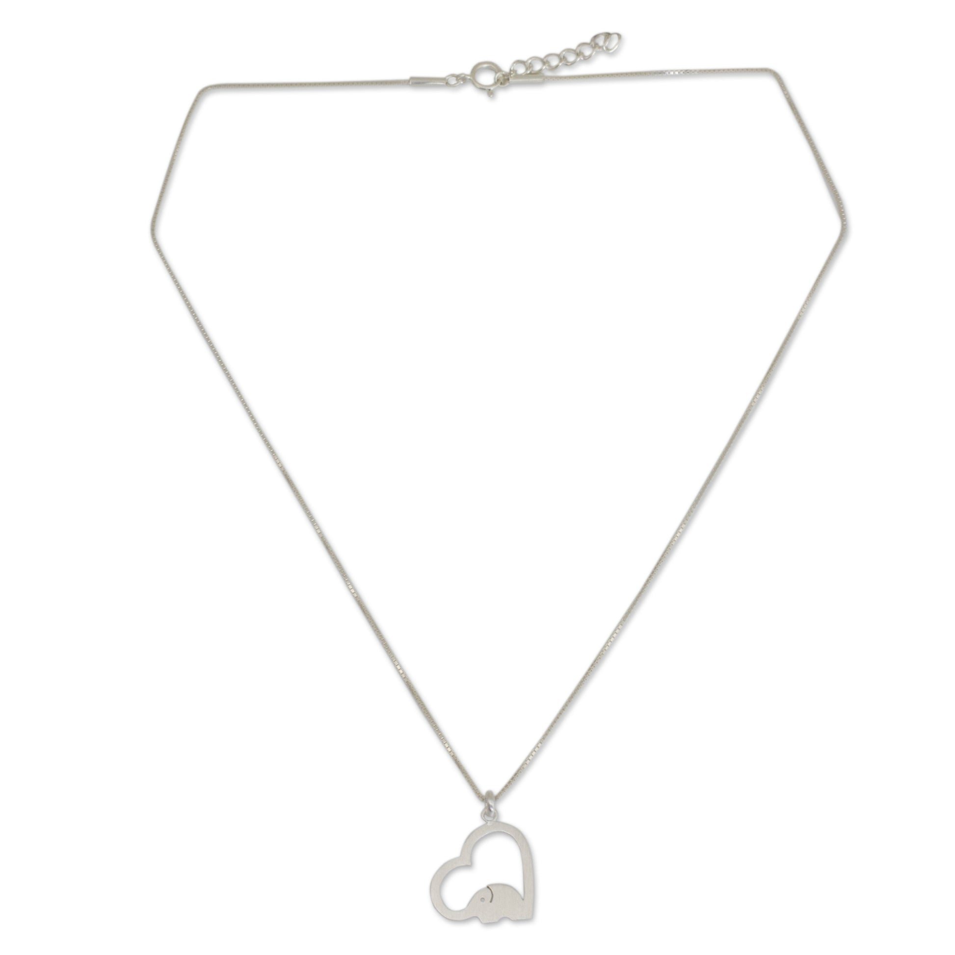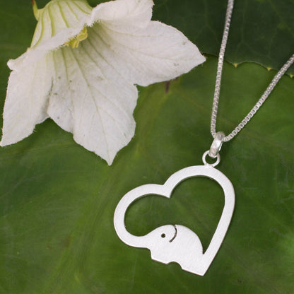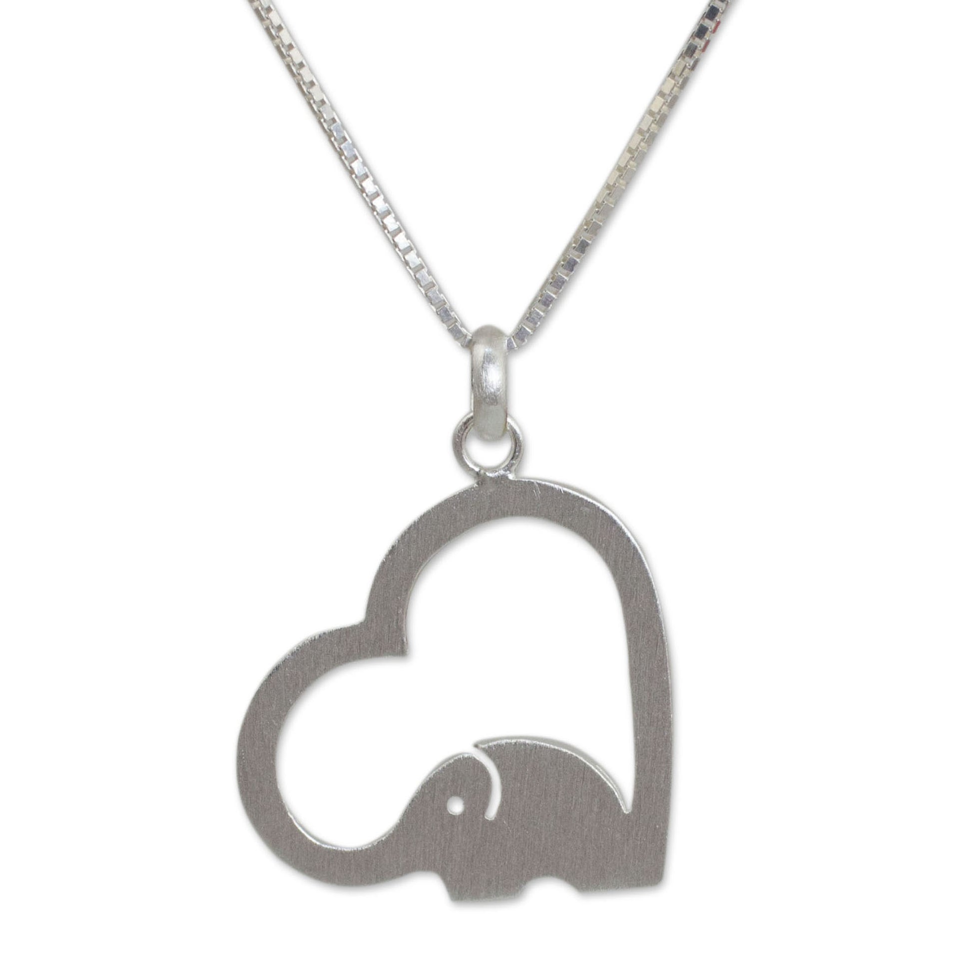An elephant is caught within a heart shaped by its own trunk in the modern design of this necklace. Resplendent with a brushed satin finish, the sterling silver necklace is crafted by Jantana in Thailand.