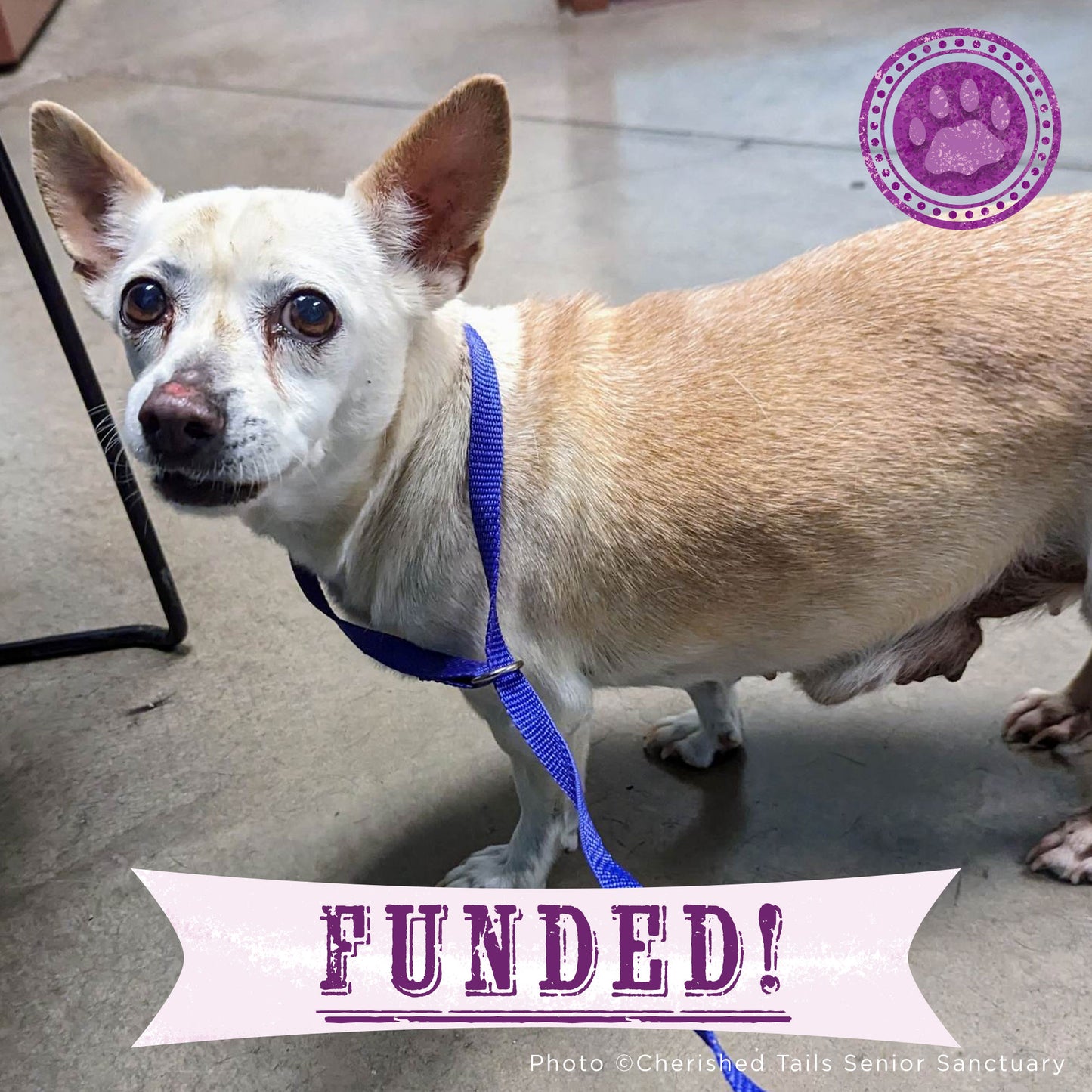 Lacey came to Cherished Tails Senior Sanctuary with a large ulcerated mammary mass. It spanned almost the full length of her belly. If she had stayed with Animal Control, she likely would have been euthanized because it would be too expensive to have the ulcer removed.