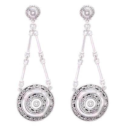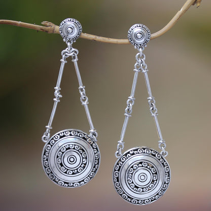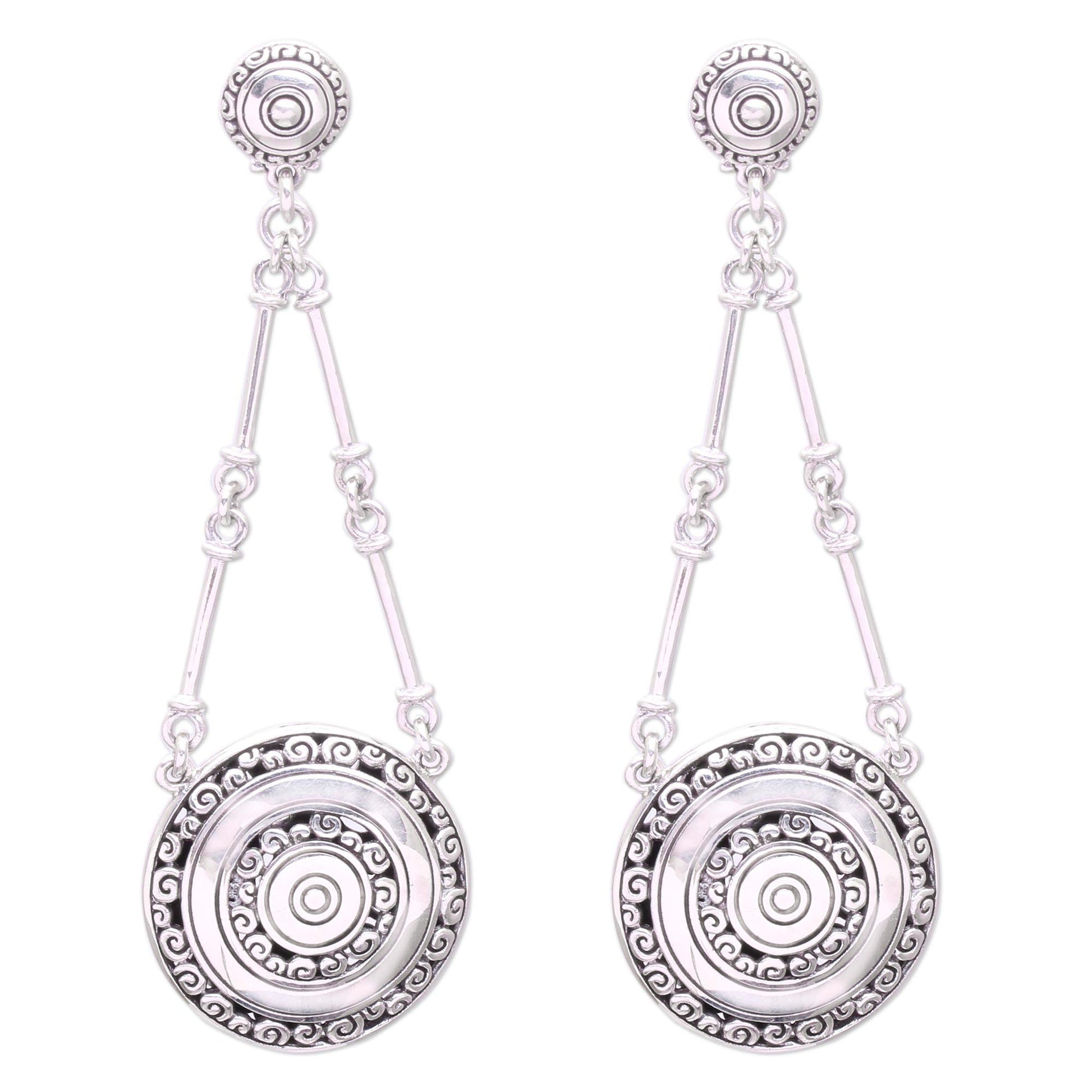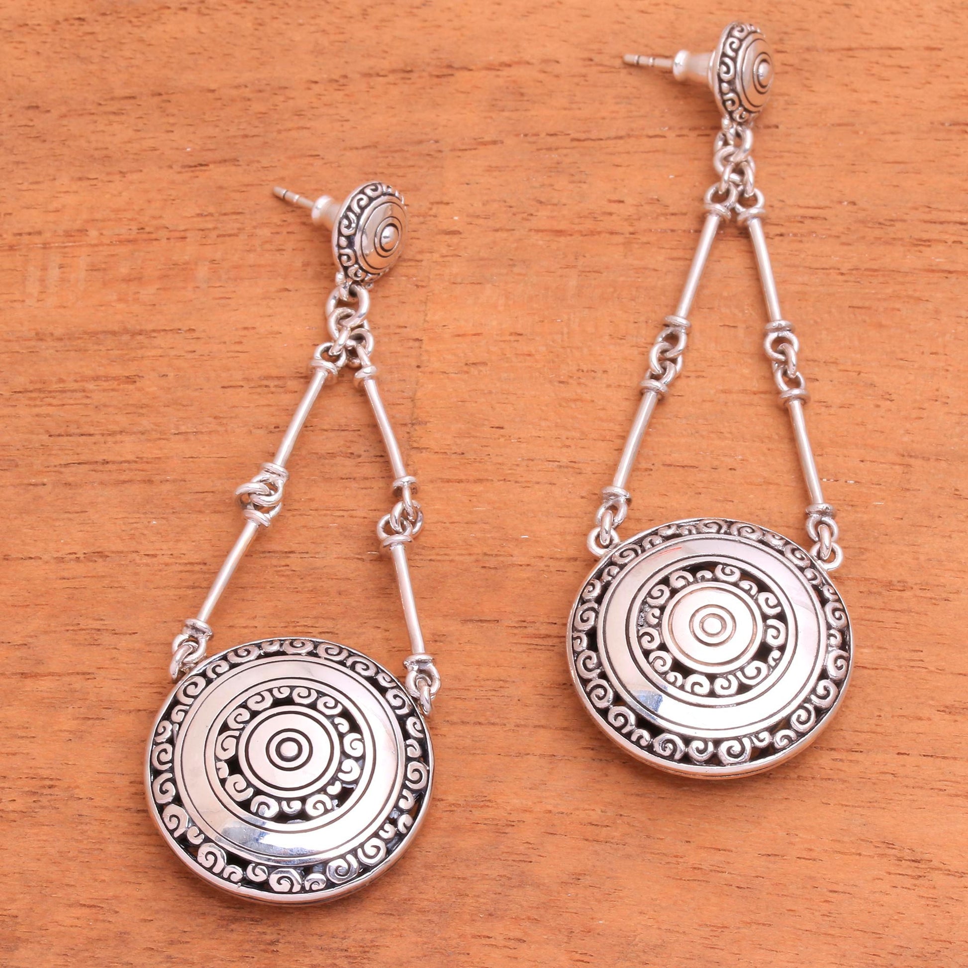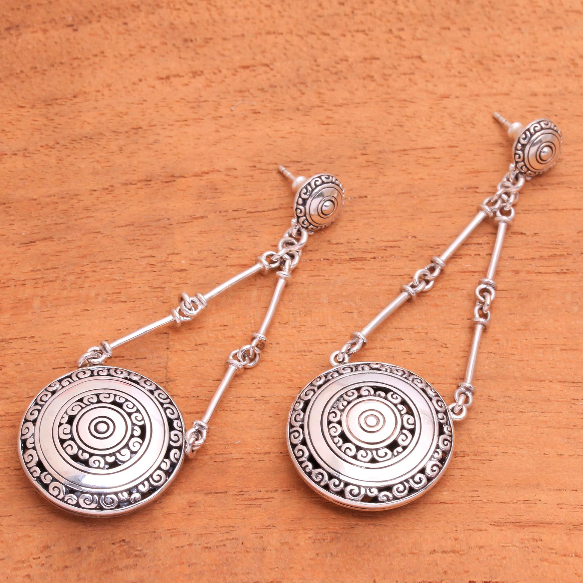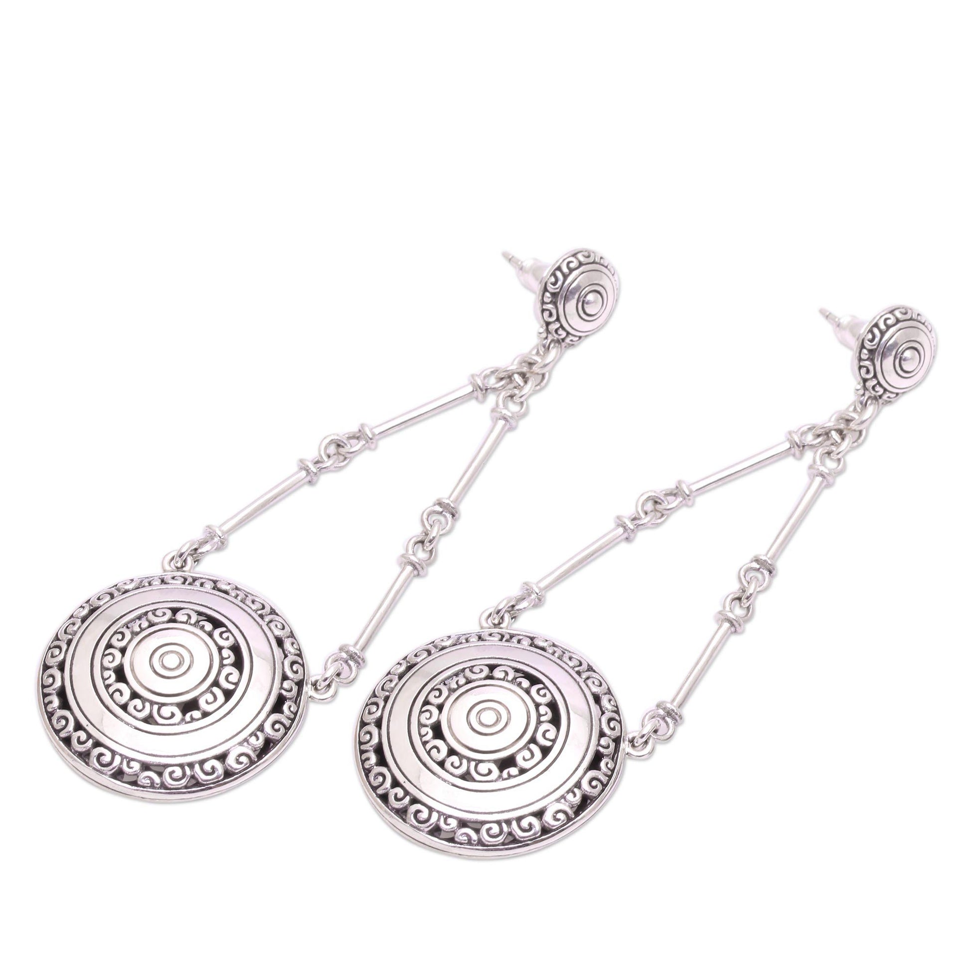 Zayd Makarim designs a heavenly pair of dangle earrings from Bali. Descending from links, two discs are crafted of sterling silver, elaborated with concentric 'Buddha's curl' motifs. Zayd creatively adds a hidden floral garden located at the back of each earring, realized with beautiful openwork.
