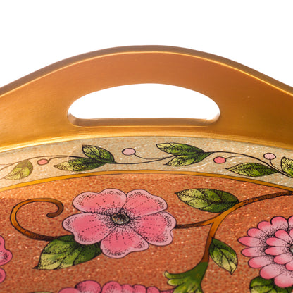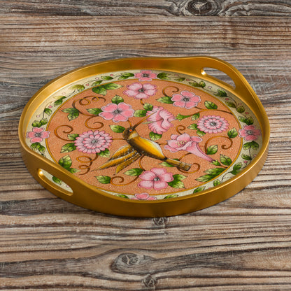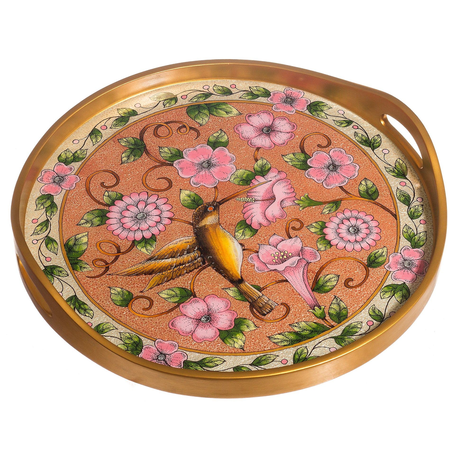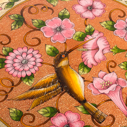 A beautiful golden hummingbird enjoys some pretty pink blossoms on this tray from Peru's Felipe Giron. The tray is crafted in the time-honored method of reverse-painted glass, accented with platinum foil. The painted motifs are so lovely that you may find yourself reluctant to put anything on the tray.