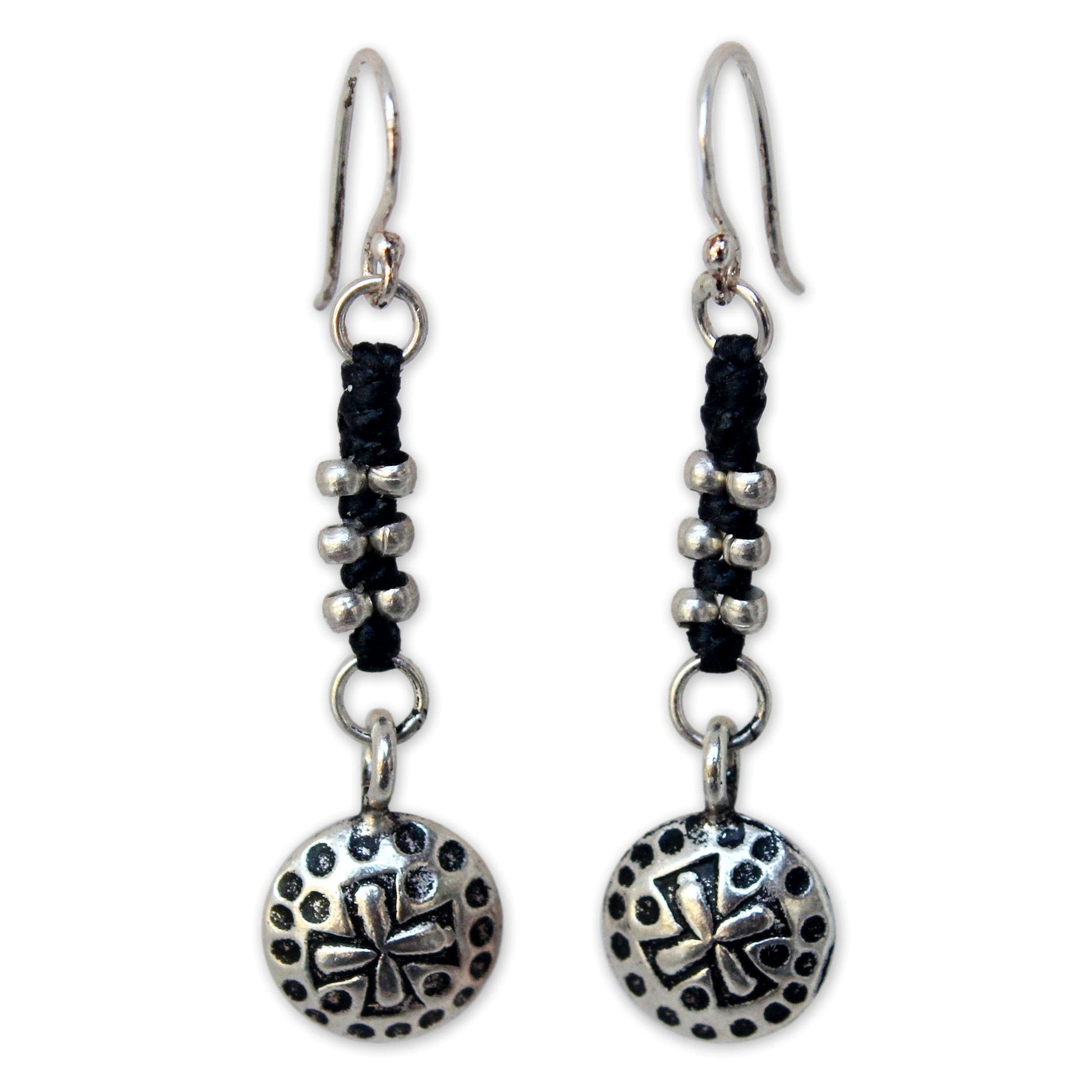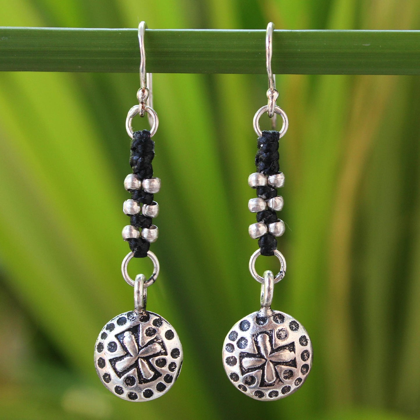 Crafted of silver, a rustic cross is engraved upon handcrafted earrings. Beads from Thailand's Karen hill tribe grace the hand-knotted cords. Napapat creates this original design.