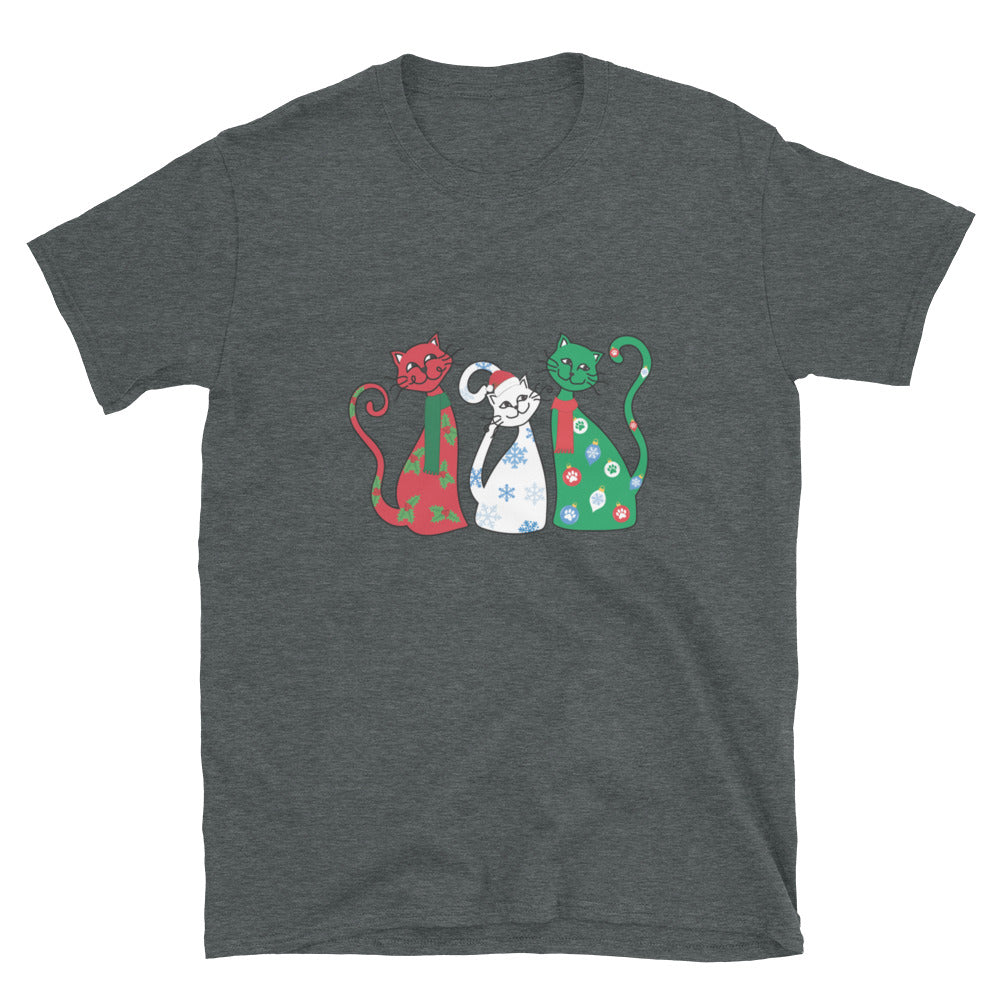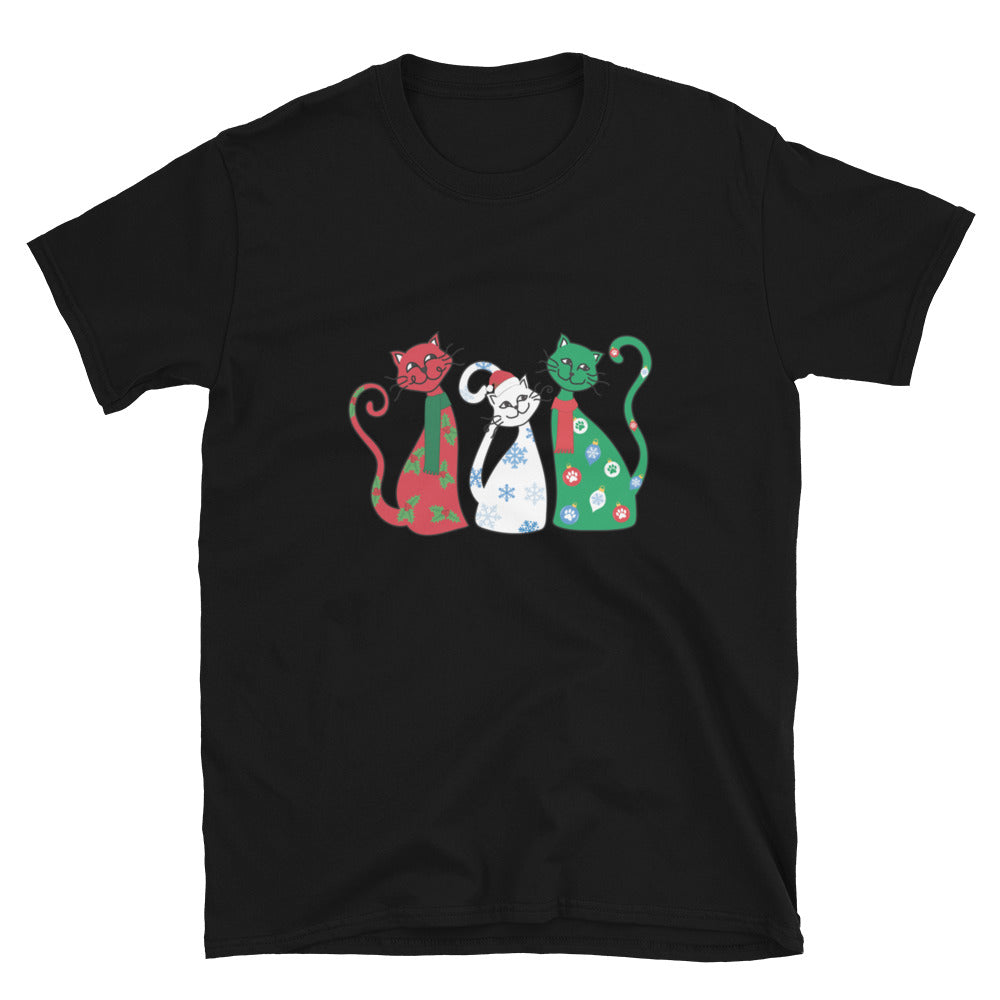 These three feline friends show off their festive spirit with holly, snowflakes and ornaments on this 100% cotton short sleeve tee. • 100% ring-spun cotton