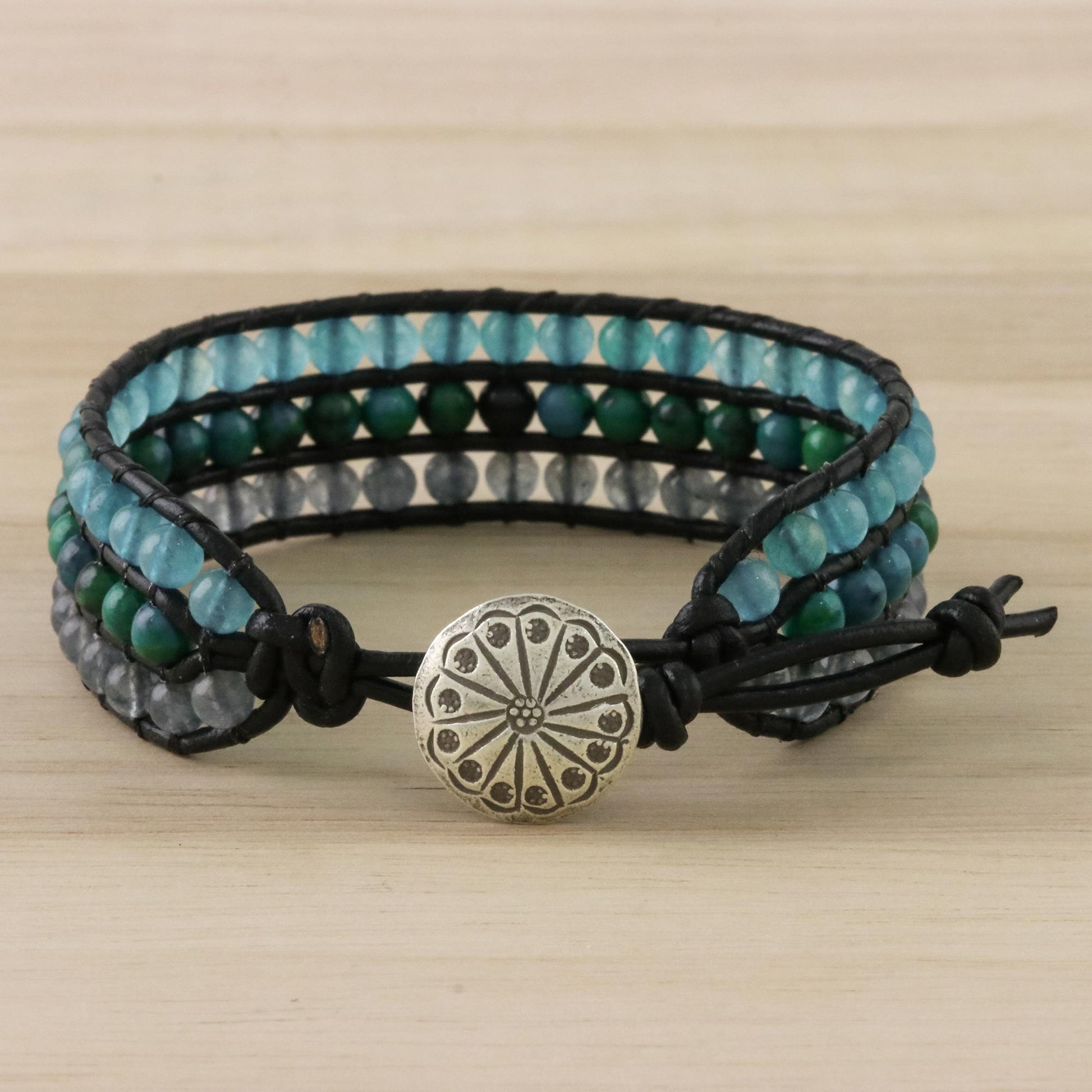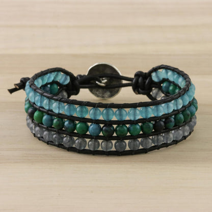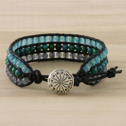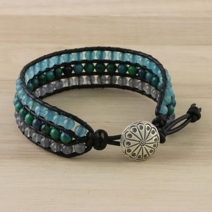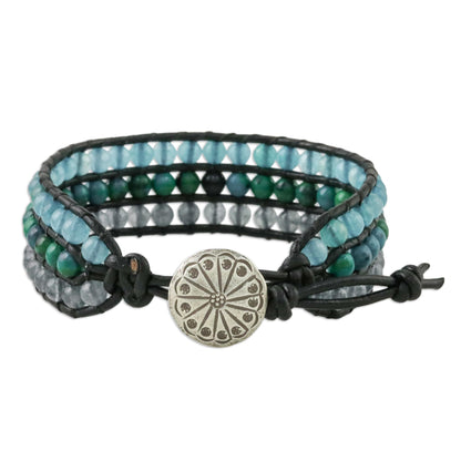 Layers of color like a bright sky over a turbulent sea are the highlight of this handcrafted wristband bracelet designed by Siriporn of Thailand. Three rows of beads--smokey grey quartz, blue-green serpentine, and light blue quartz--are wrapped to black leather cords knotted at the ends. The bracelet fastens with a silver button stamped with a flower from the Karen hill tribe of Thailand. The bracelet has two loops for securing the silver button for an adjustable fit.