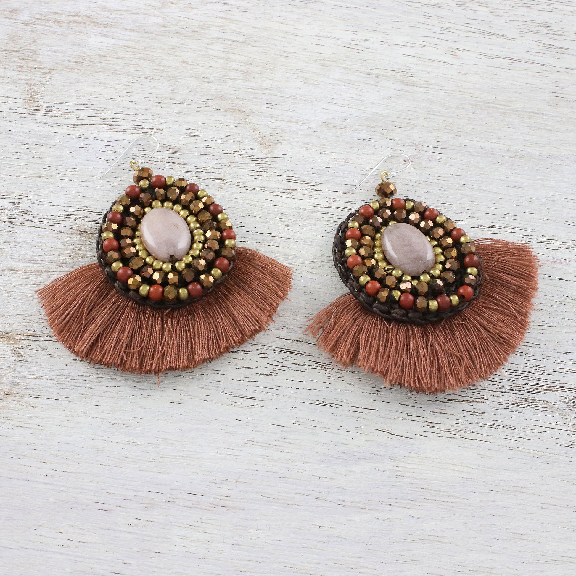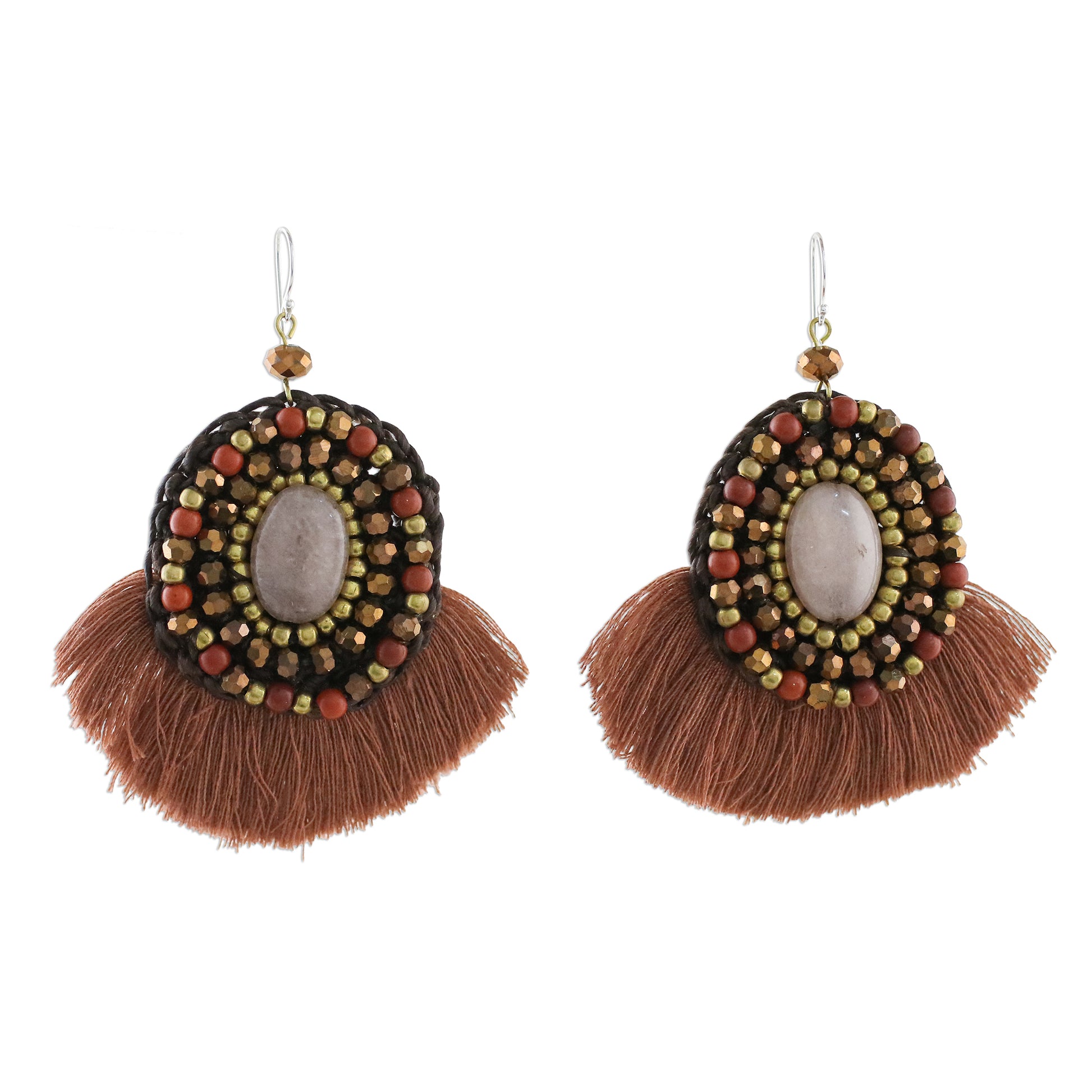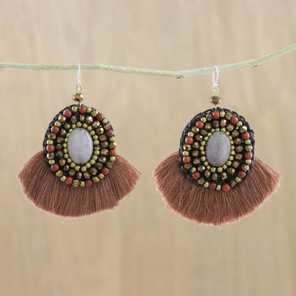 These dangle earrings handcrafted by artisan Nareerat of Thailand have a playful sense of fun. An oval of quartz is ringed with rows of brass, jasper, and glass beads connected with polyester cord. Cinnamon brown cotton fringe fans out from the bottom like a dancer's skirt.