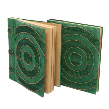 Tinted a deep turquoise, concentric circles take shape in natural fibers. Komang Sulaksana selects the textures of banana bark and agel grass cord for these beautiful notebooks. Each one has 50 pages of rice straw paper.