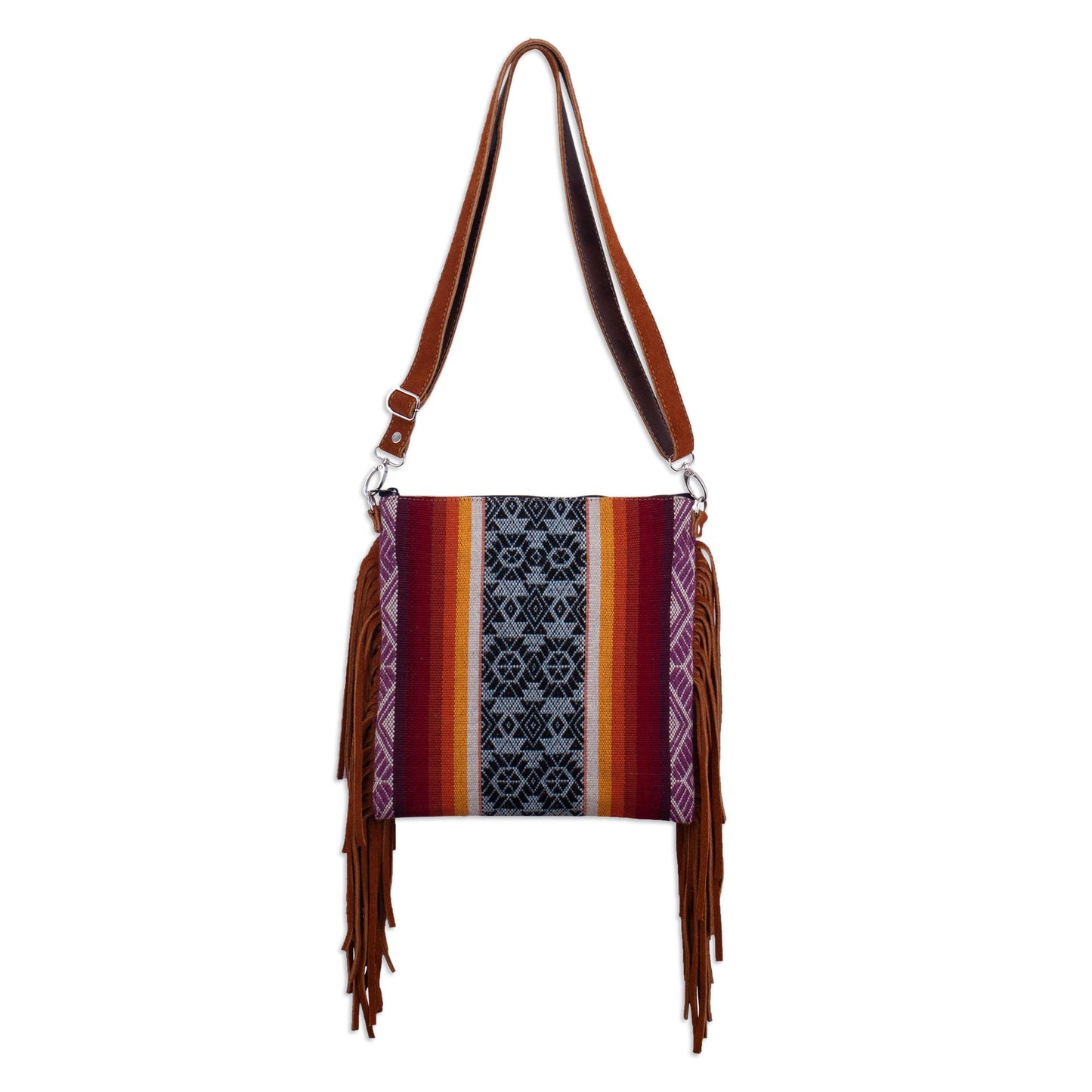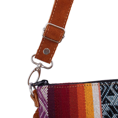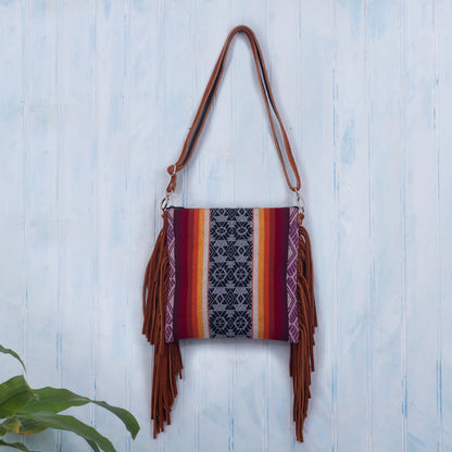 Patterns inspired by ancient Inca textiles adorn this beautiful shoulder bag from Kathiana Quispe in Peru. The handloomed wool bag is complemented by long saddle brown suede fringe on both sides. The fully lined bag features a removable, adjustable suede shoulder strap.