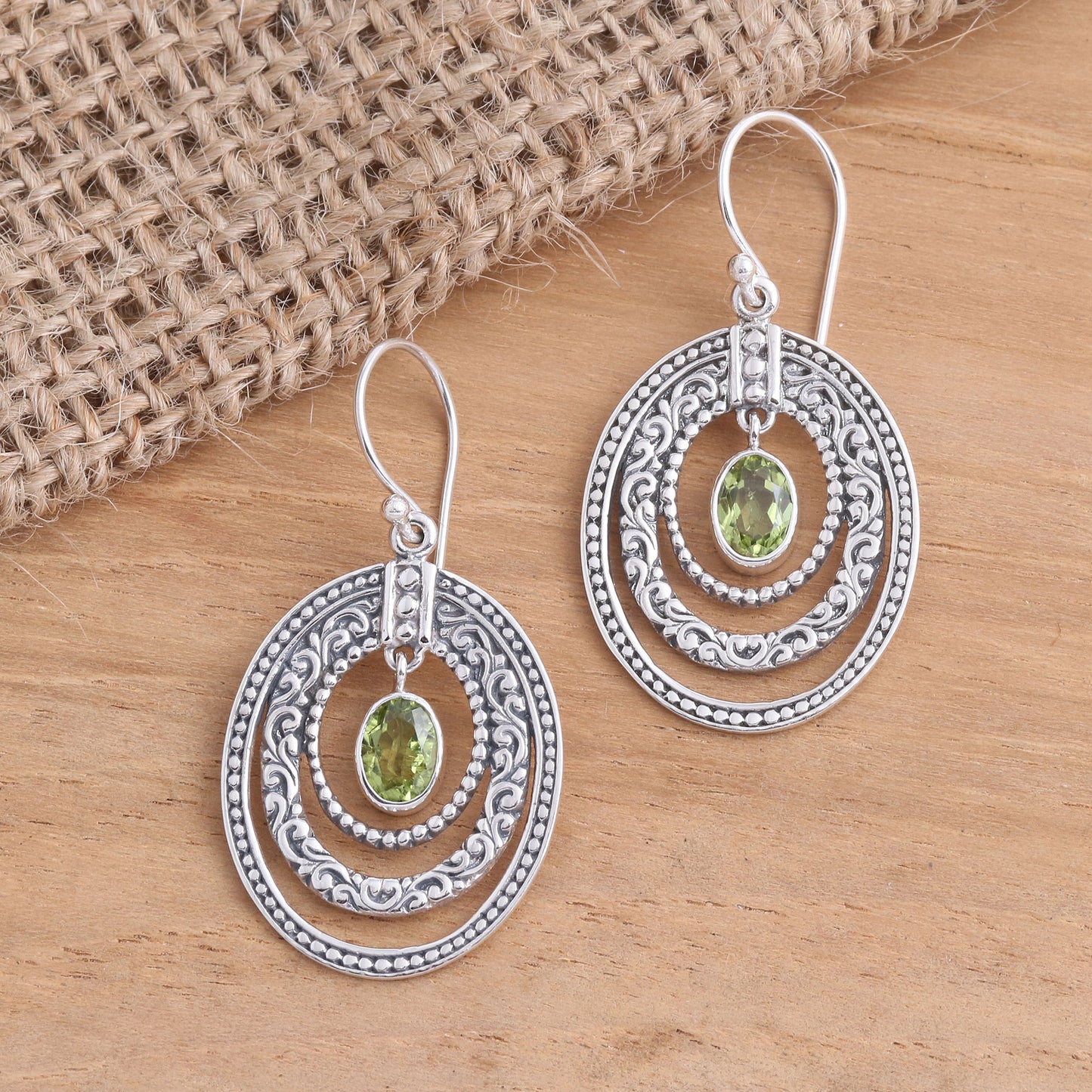 Three concentric ovals with distinctive oxidized patterns are joined at the top in these dangle earrings by Bali's Ari Gunawan. Titled 'Inner Circles,' the trio of rings is enhanced by a natural, bezel-set, faceted peridot at the center. The artisan crafts these earrings using a combination of handwork and casting.