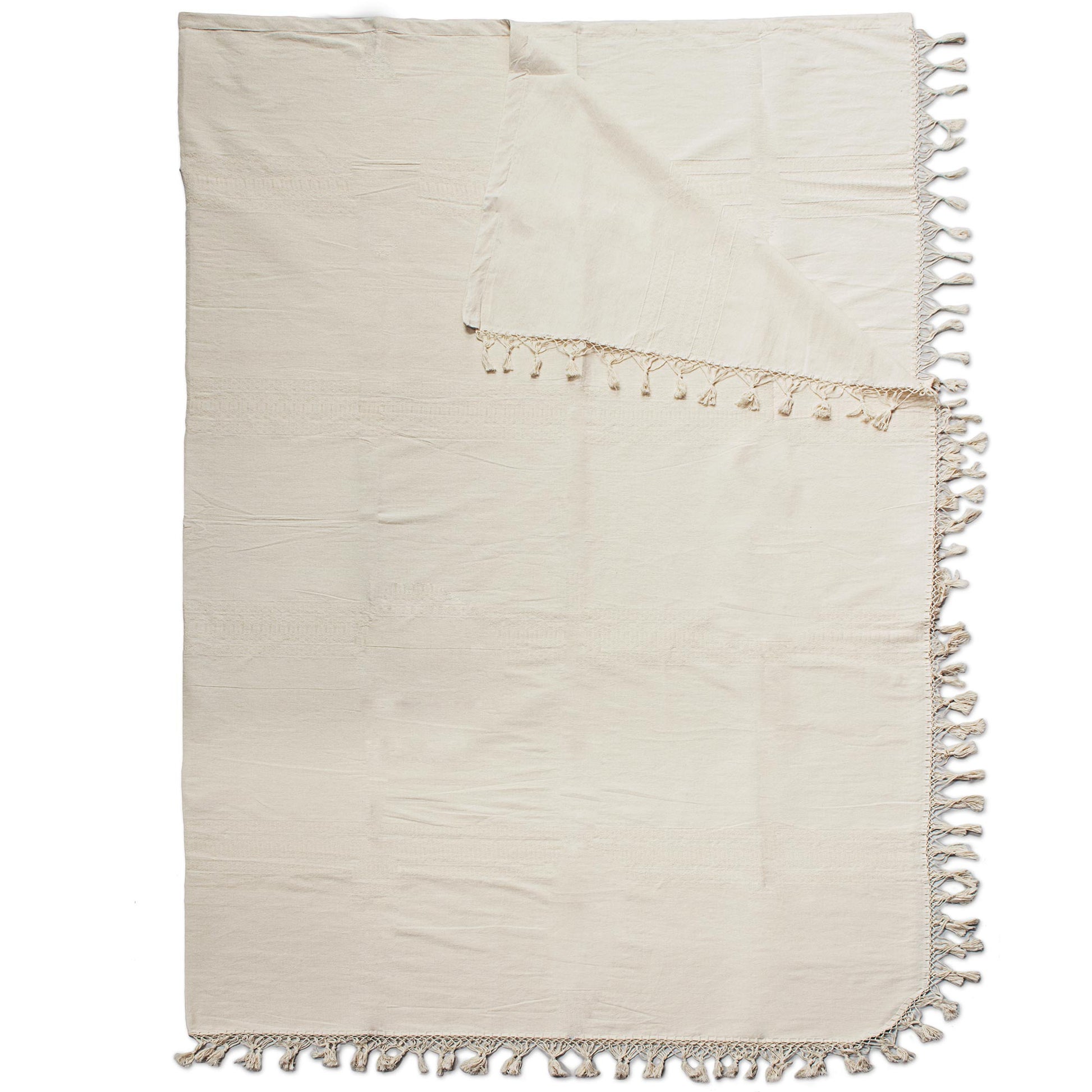 Carmen Ruiz presents this large hand woven blanket featuring a delicate ivory fringe. Radiating pure elegance, this king sized blanket in an ivory hue is sure to add a charming touch to your room. Working with naturally dyed cotton on a traditional Zapotec loom.