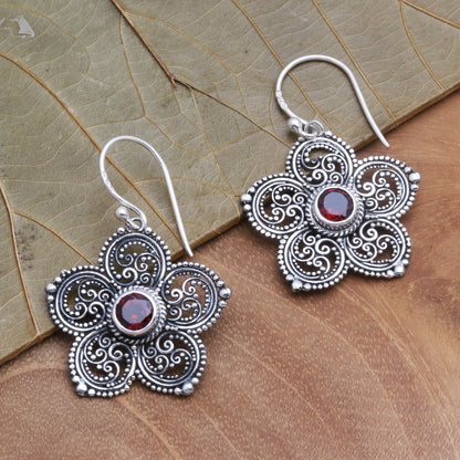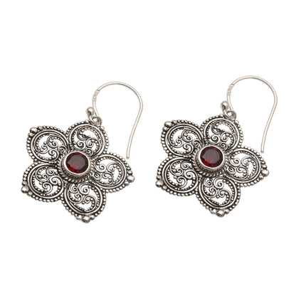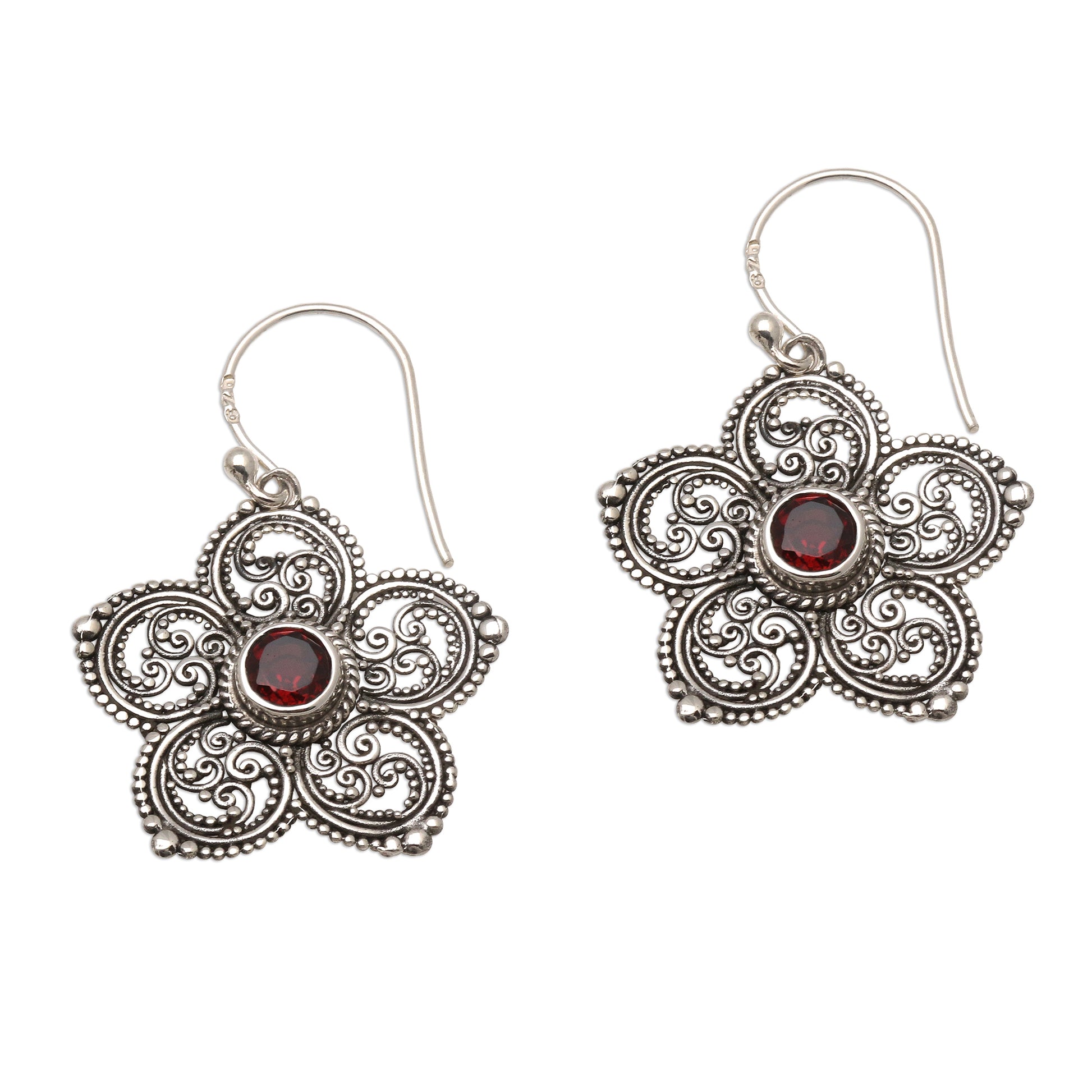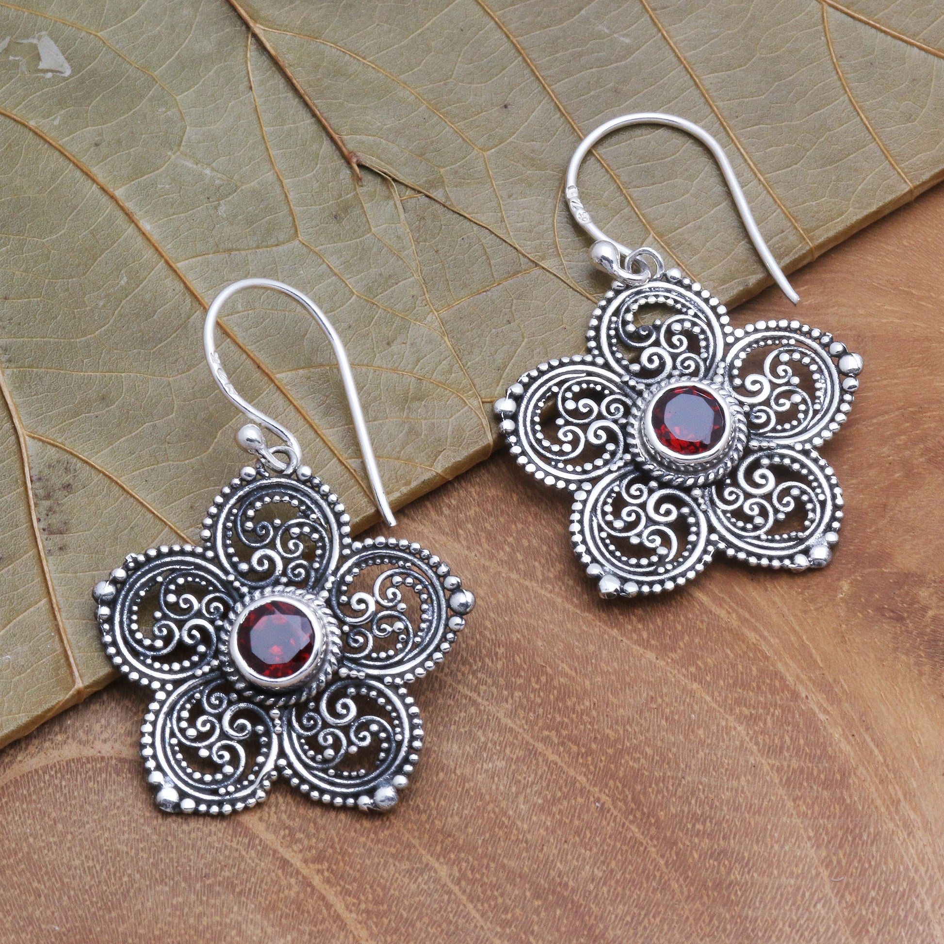 Eka Devi in Bali creates memorable earrings set with January's birthstone. The sterling silver earrings feature lavishly detailed flowers, their centers set with faceted garnets totaling one carat. The earrings swing from sterling hooks.