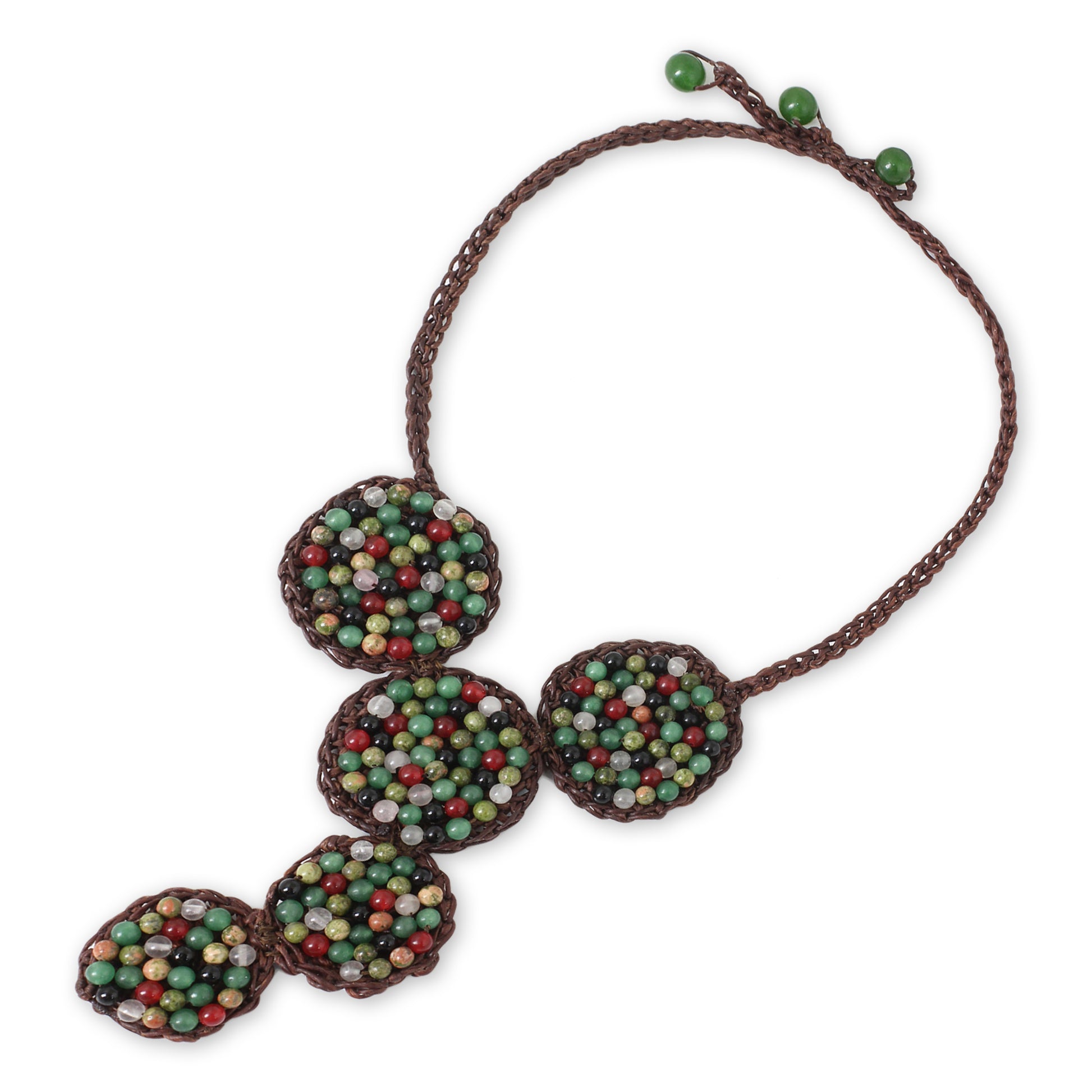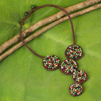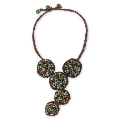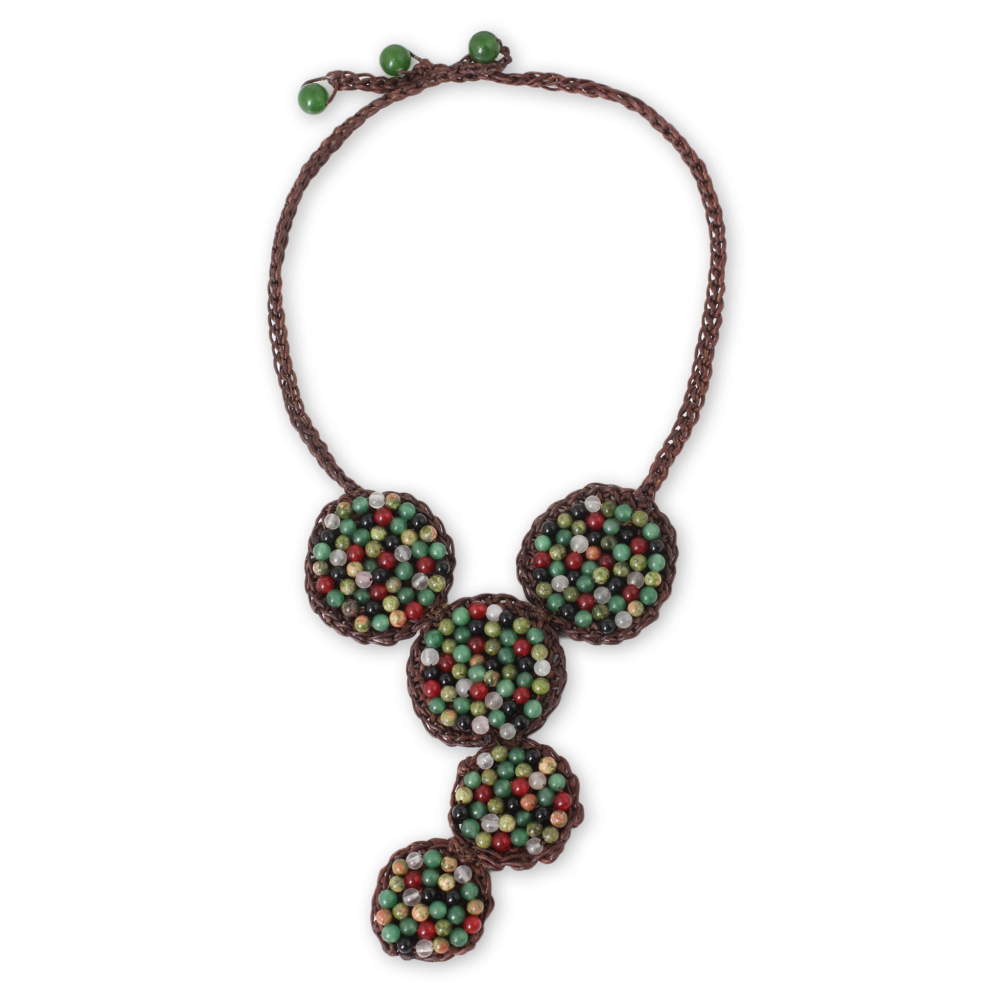 With a medley of colorful gemstones, this necklace is crocheted by hand of waxed brown cords. Anusara in Thailand selects unakite, dyed quartz and glass beads for her original design.