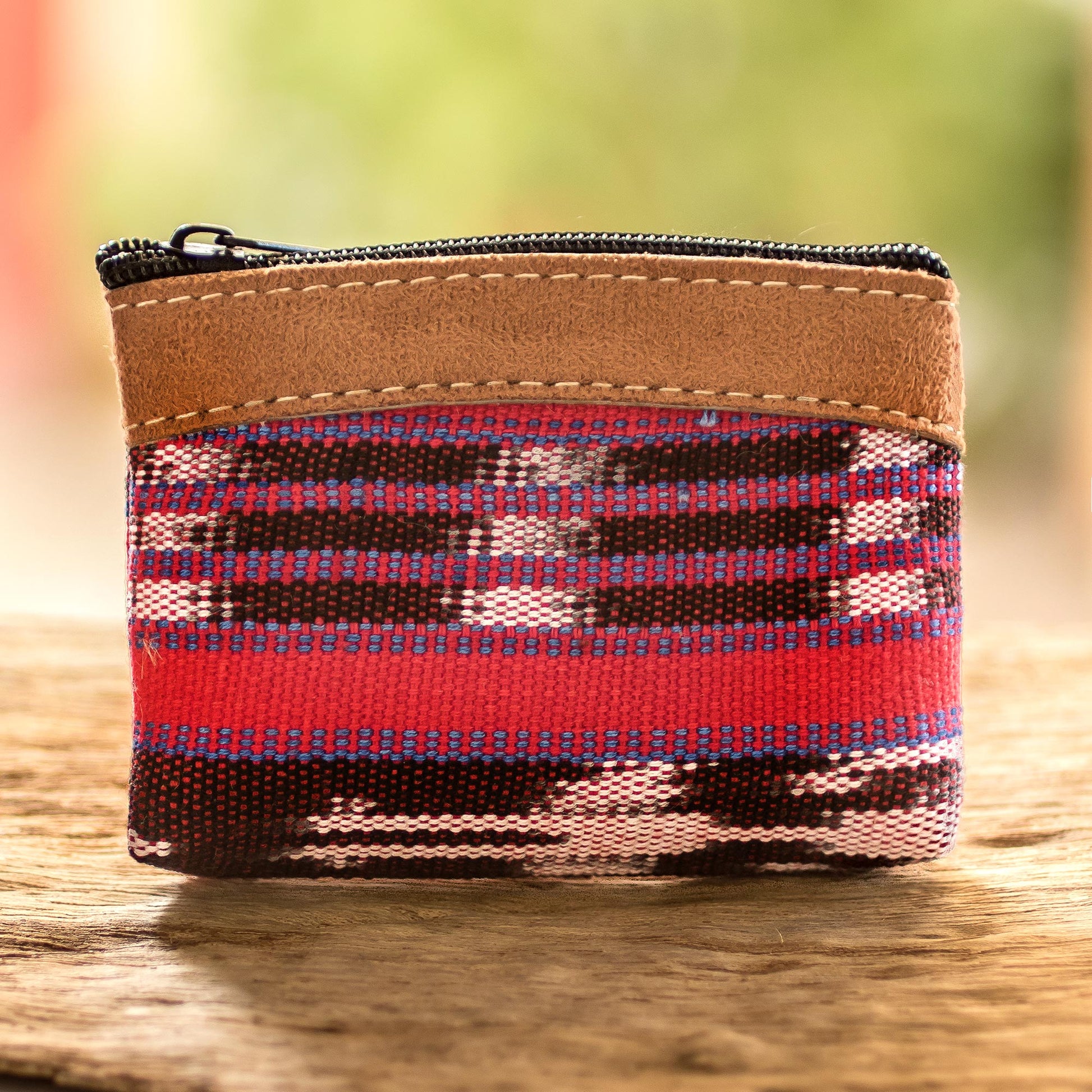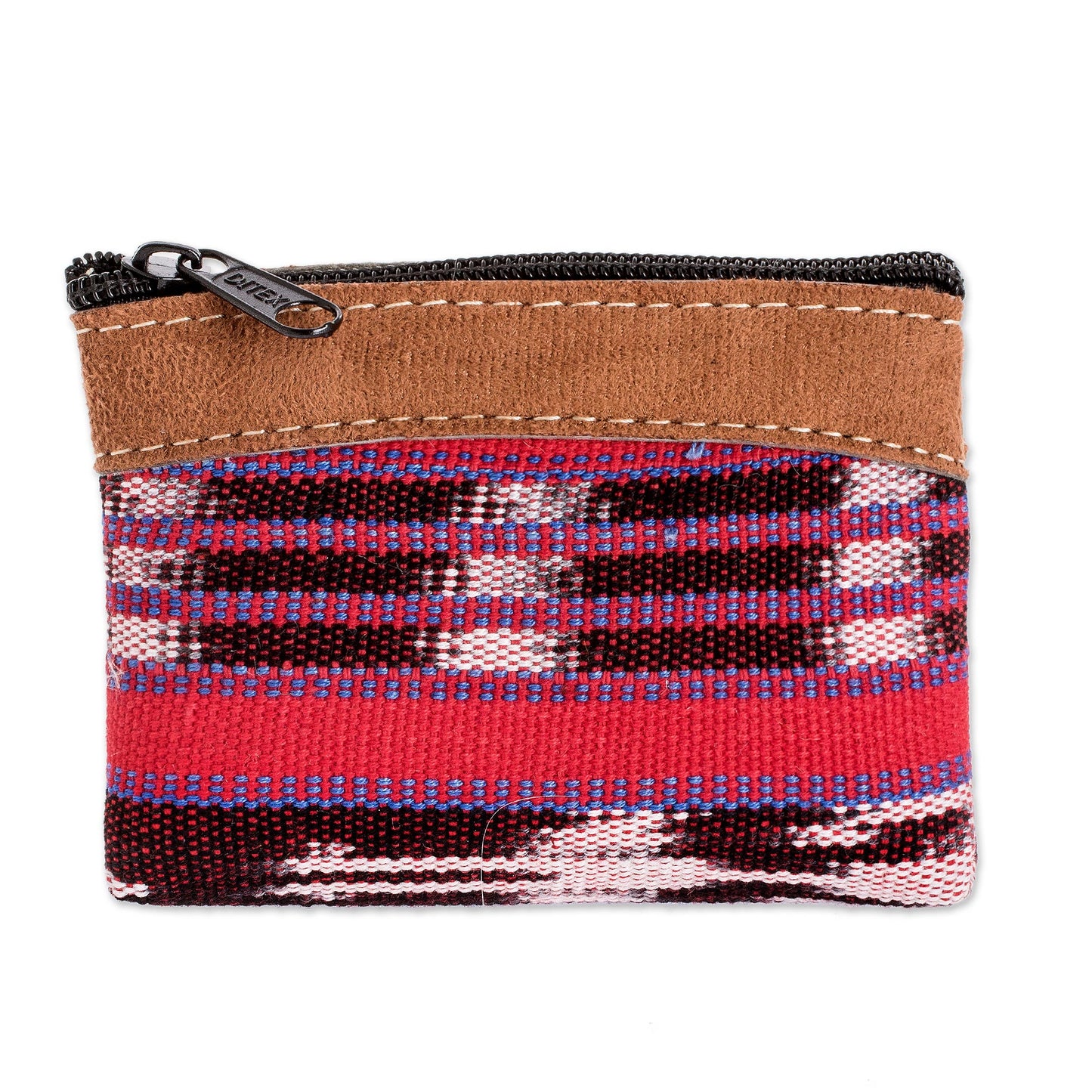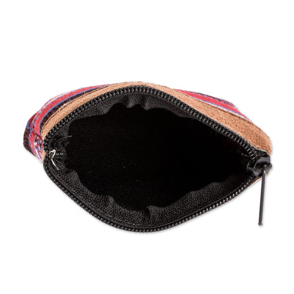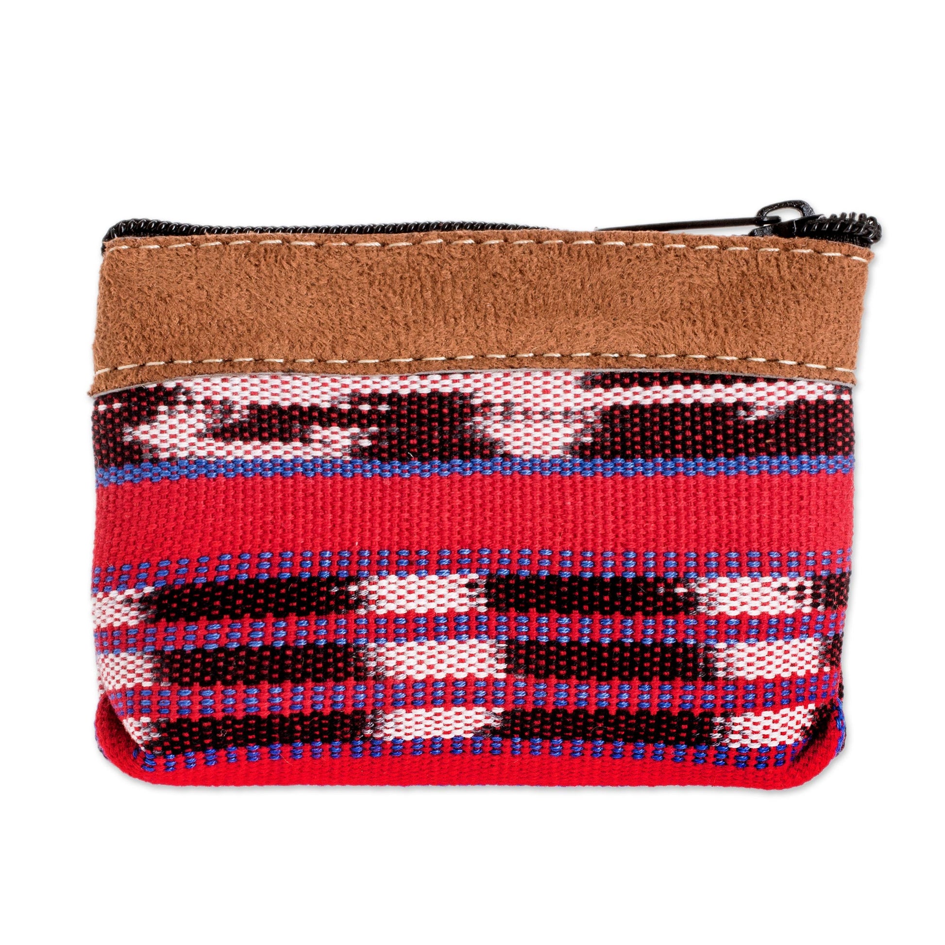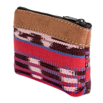Keep your coins safe and separate while you're on the go with this handwoven cotton change purse. It is created by the House of Antigua Artisans of Guatemala, which is dedicated to keeping this country's ancient textile traditions alive. The petite red bag features brown faux suede leather trim, a black lining and a zippered closure.