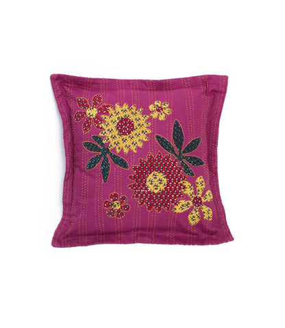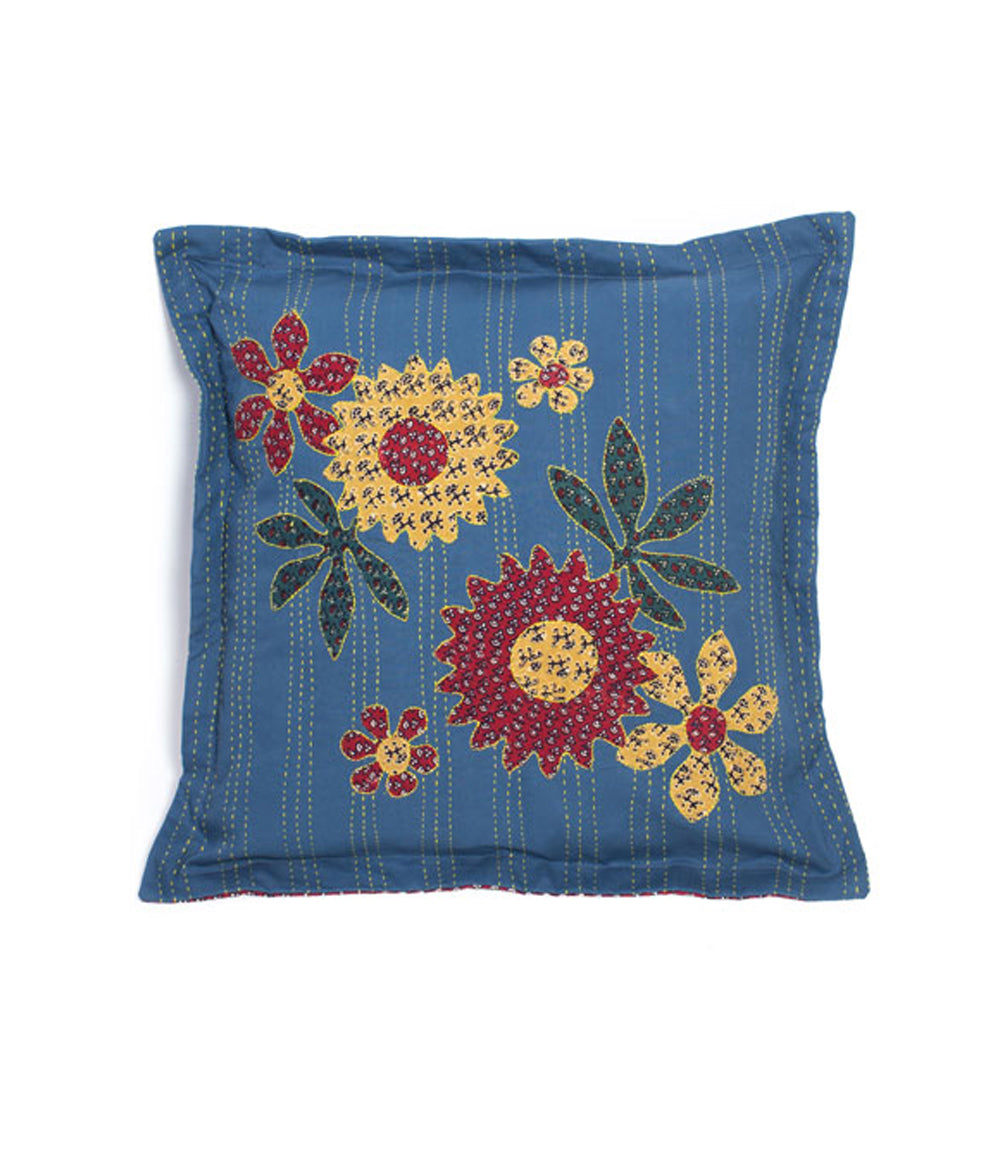 Naturally dyed, assorted block-print fabrics form the floral designs, which are sewn onto row-stitched material (aka kantha quilting). Artisans use appliqué and cutwork techniques to create this fresh, unique look for pillows. . An added and unexpected design element is the cute ruffle on the back of each pillow.