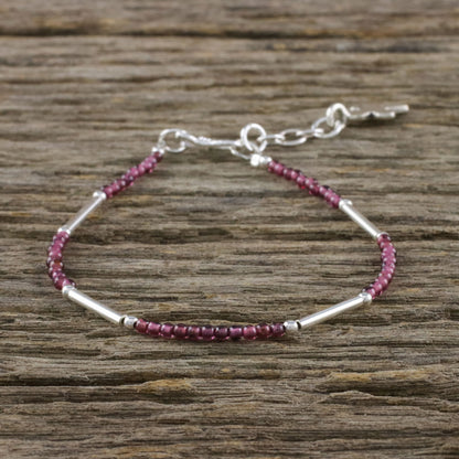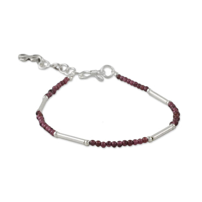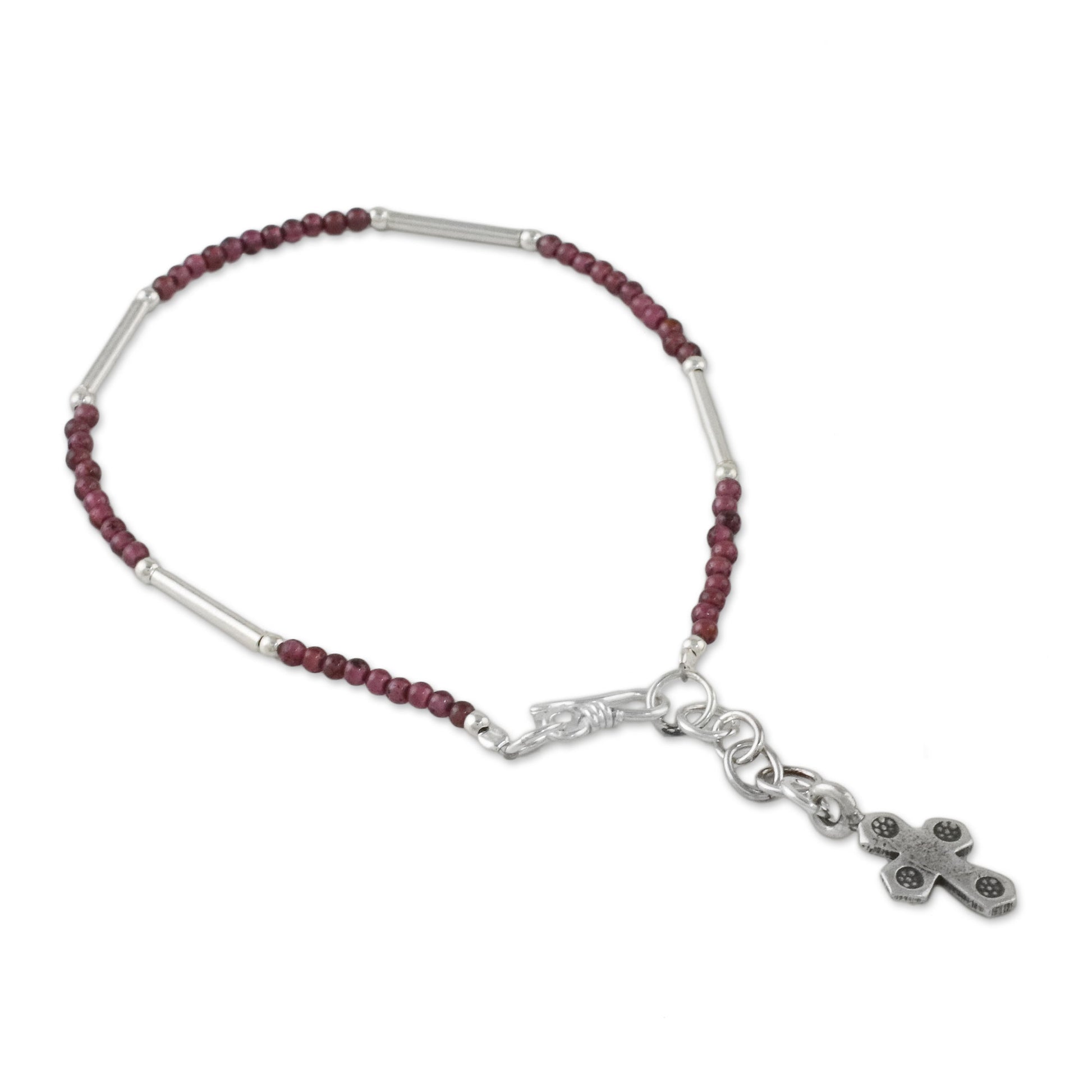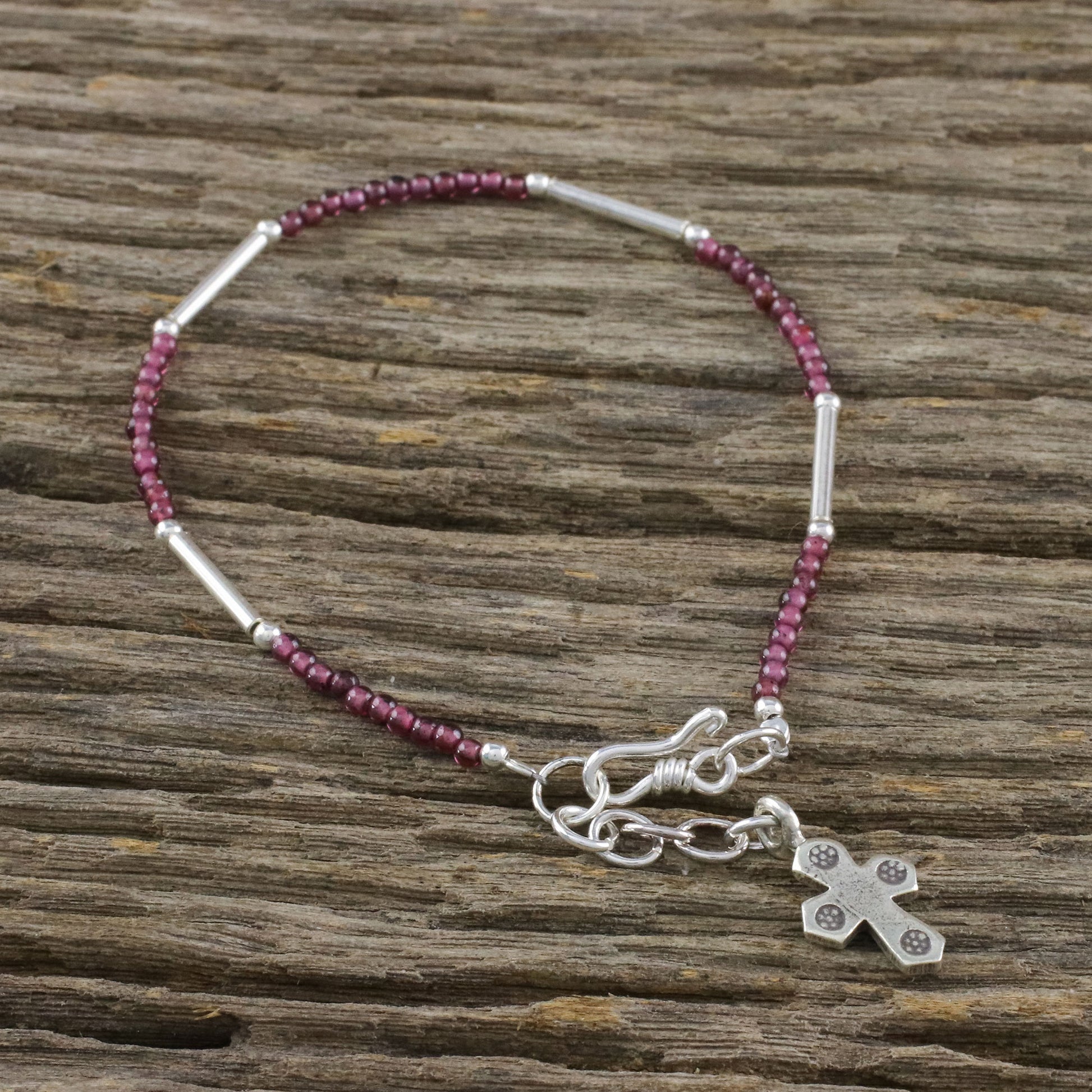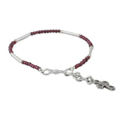This elegant bracelet from Thailand makes for a faithful companion wherever it goes. Siranya designs the bracelet, circling the wrist with beads of natural garnet and sterling silver. A cross charm of Karen hill tribe 950 silver dangles from the extender chain.