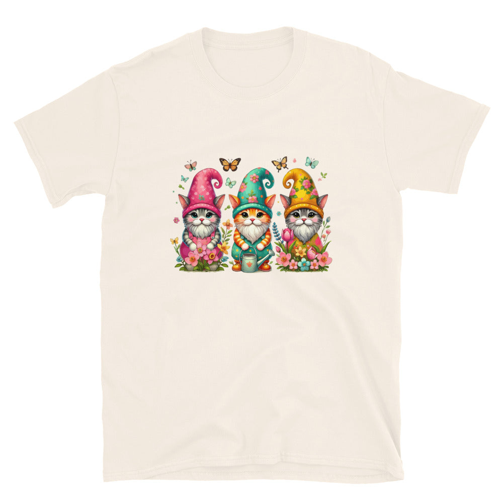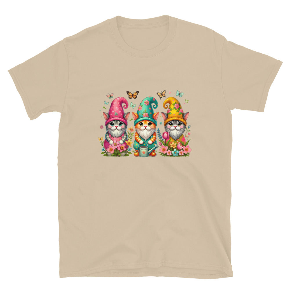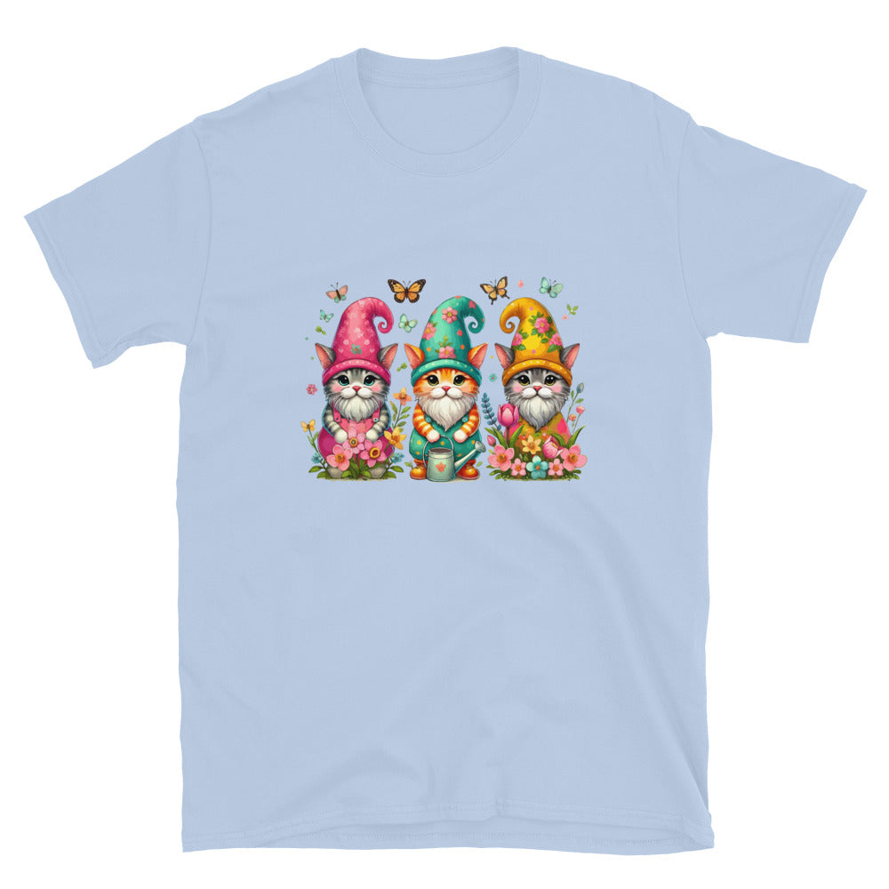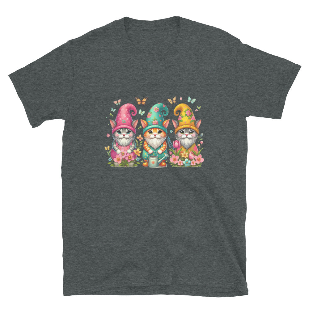Three fun cats, dressed up as gnomes, are ready for spring on this super soft short sleeve tee. Made from ultra-soft fabric, this shirt is perfect for cat lovers and anyone who enjoys a touch of fun and charm in their wardrobe!