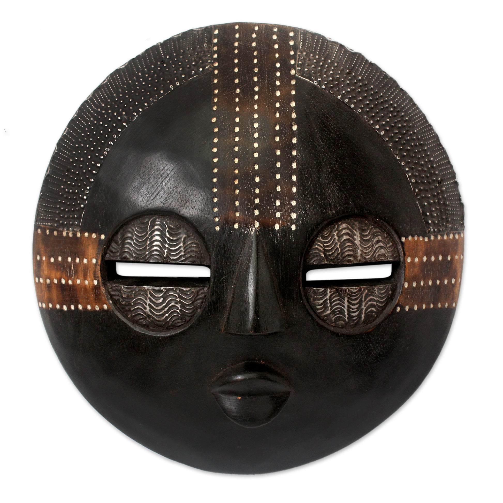Adorned with richly embossed aluminum, this elegant African mask is designed by Rita Addo Zakour. 'The people of Kokobene in the central region of Ghana believe that if a man goes to the farm continuously during the week and meets a woman on his fourth day, this brings them luck. It its also a sign they will have a good harvest,' she says. The rich beauty of aluminum repoussé enhances the mask.