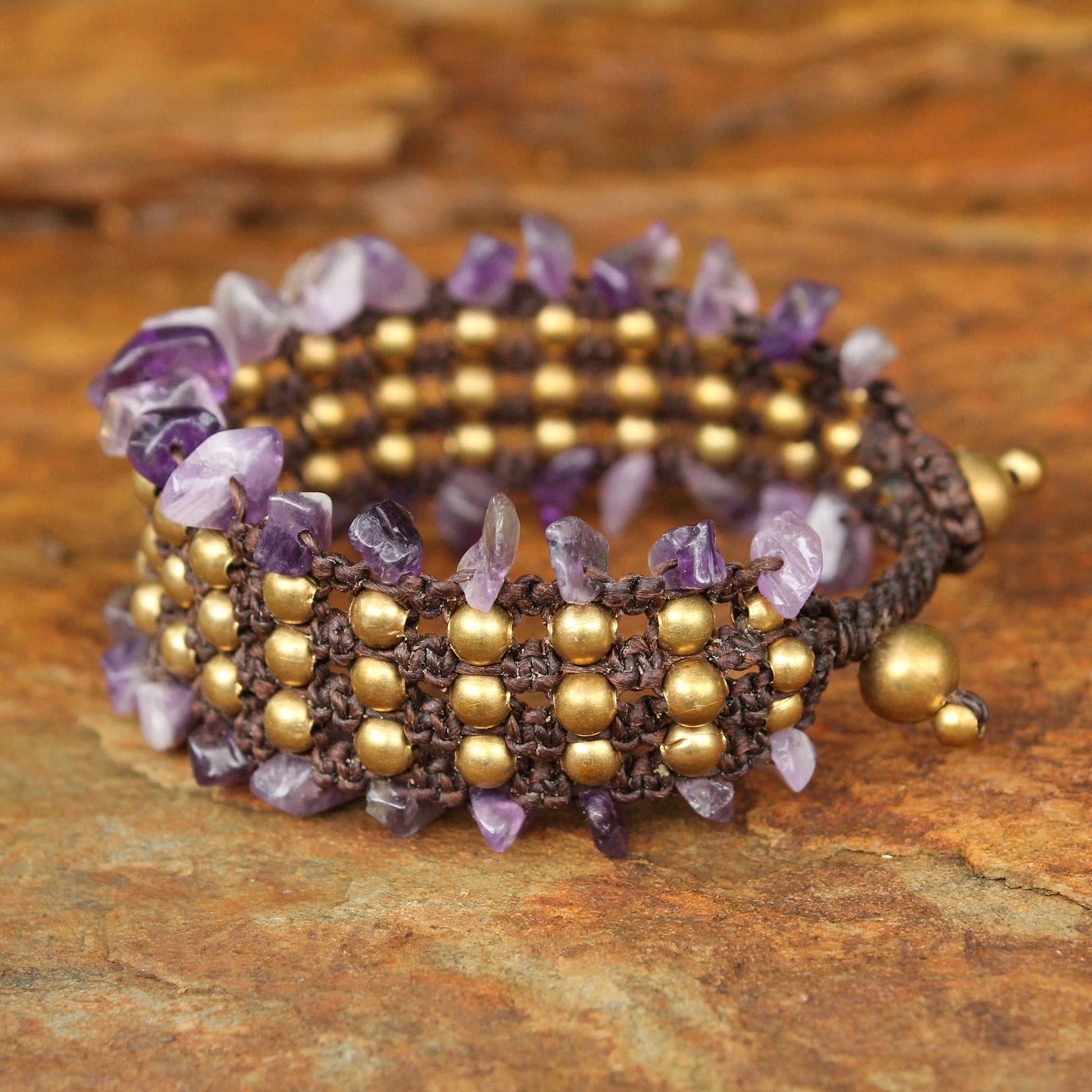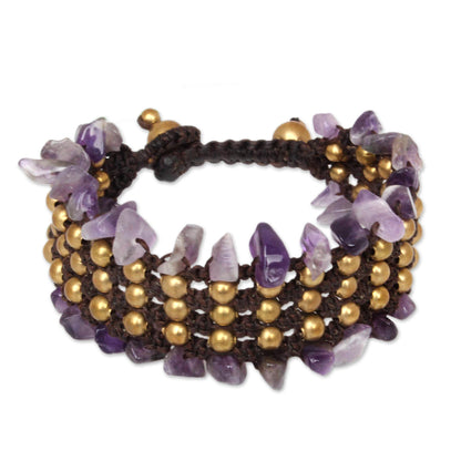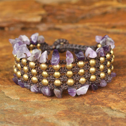 This wristband bracelet is destined to become a favorite accessory. Thai designer Tiraphan Hasub crafts it by hand with chip cut amethysts on the borders and brass beads at the center. The bracelet's adjustable length fastens with brass beads.