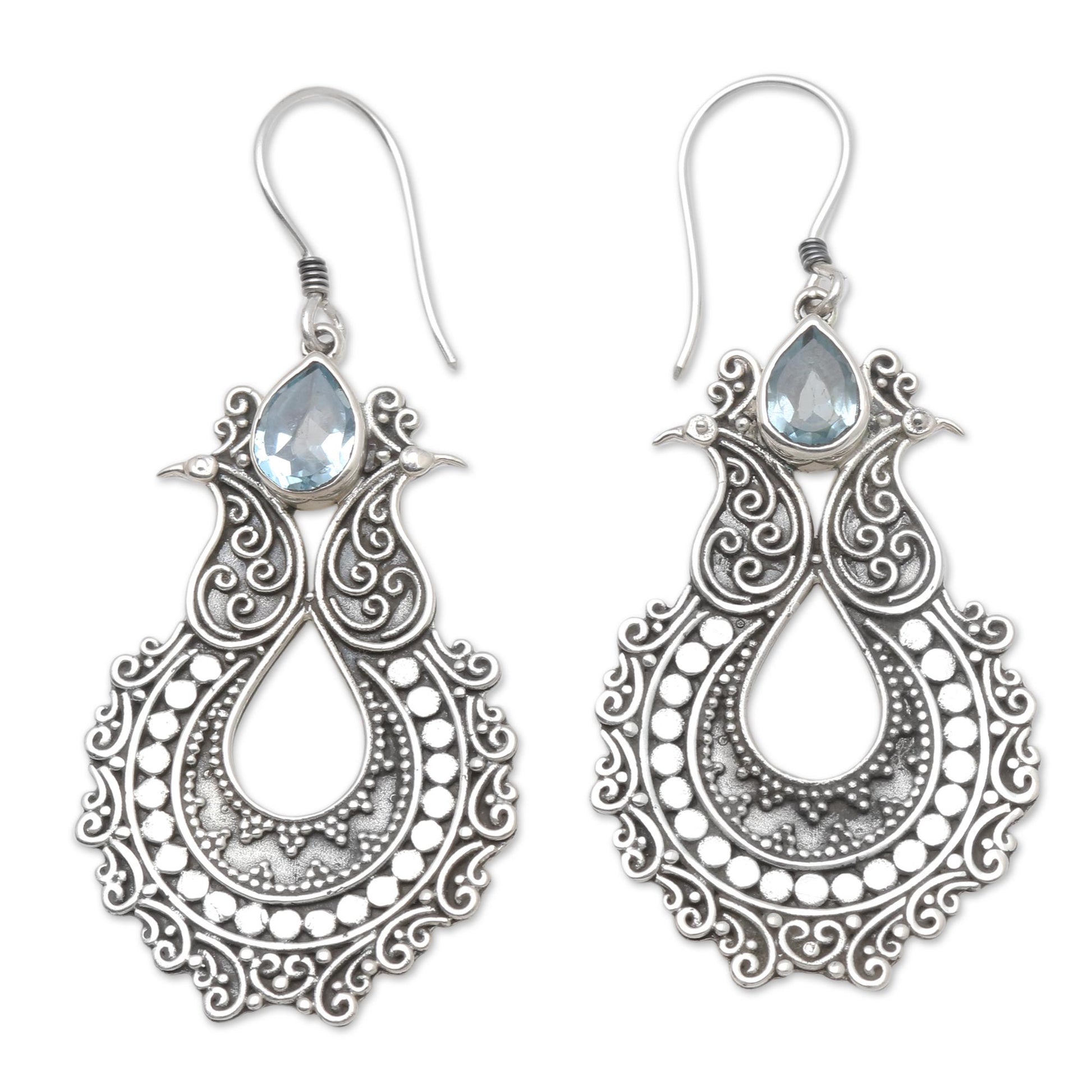 Replete with those details so characteristic of Balinese jewelry, these earrings are a standout. Eka Devi designs the earrings, which are crafted from sterling silver to showcase two carats of sparkling blue topaz.