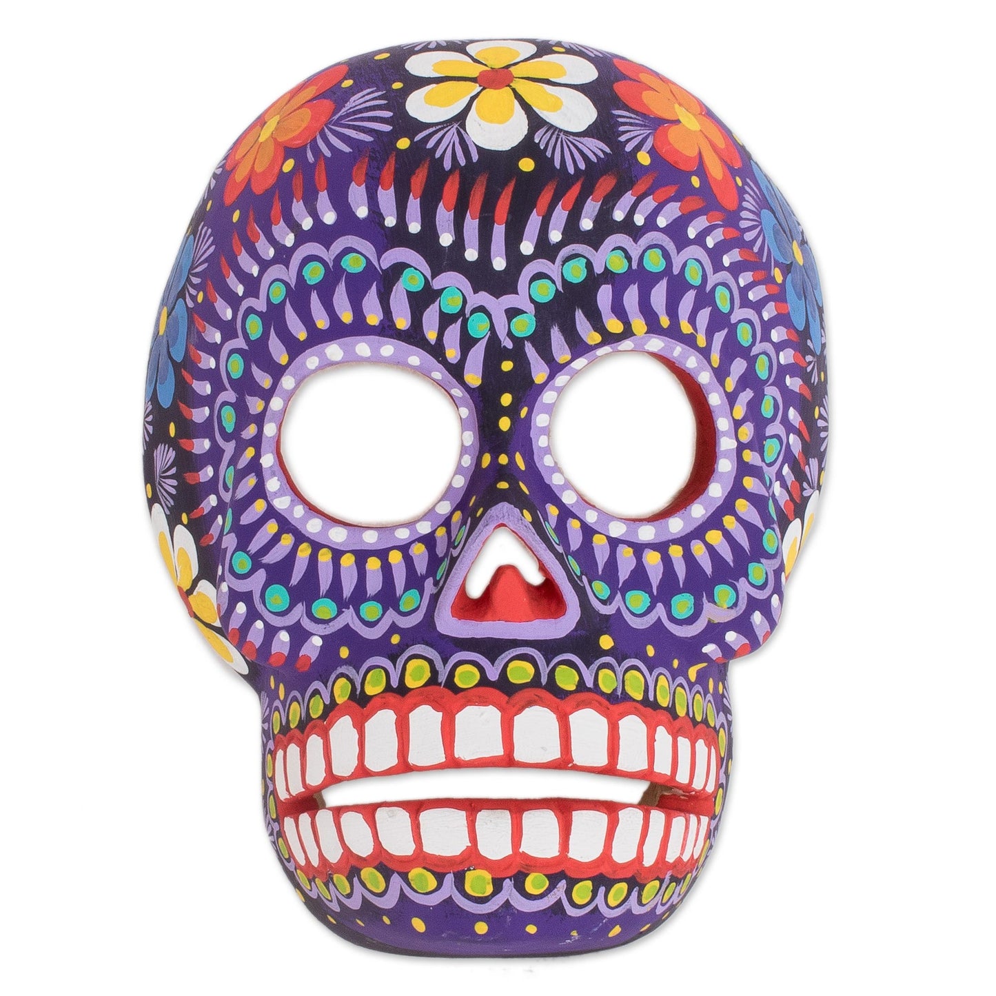 Perfect for celebrating Halloween or Day of the Dead, this wall mask is created by Guatemalan duo Juan and Carolina. They carve a grinning skull from pinewood. Its purple body is painted by hand with vibrant and colorful floral motifs. This mask adorns any wall on agave fiber cord.