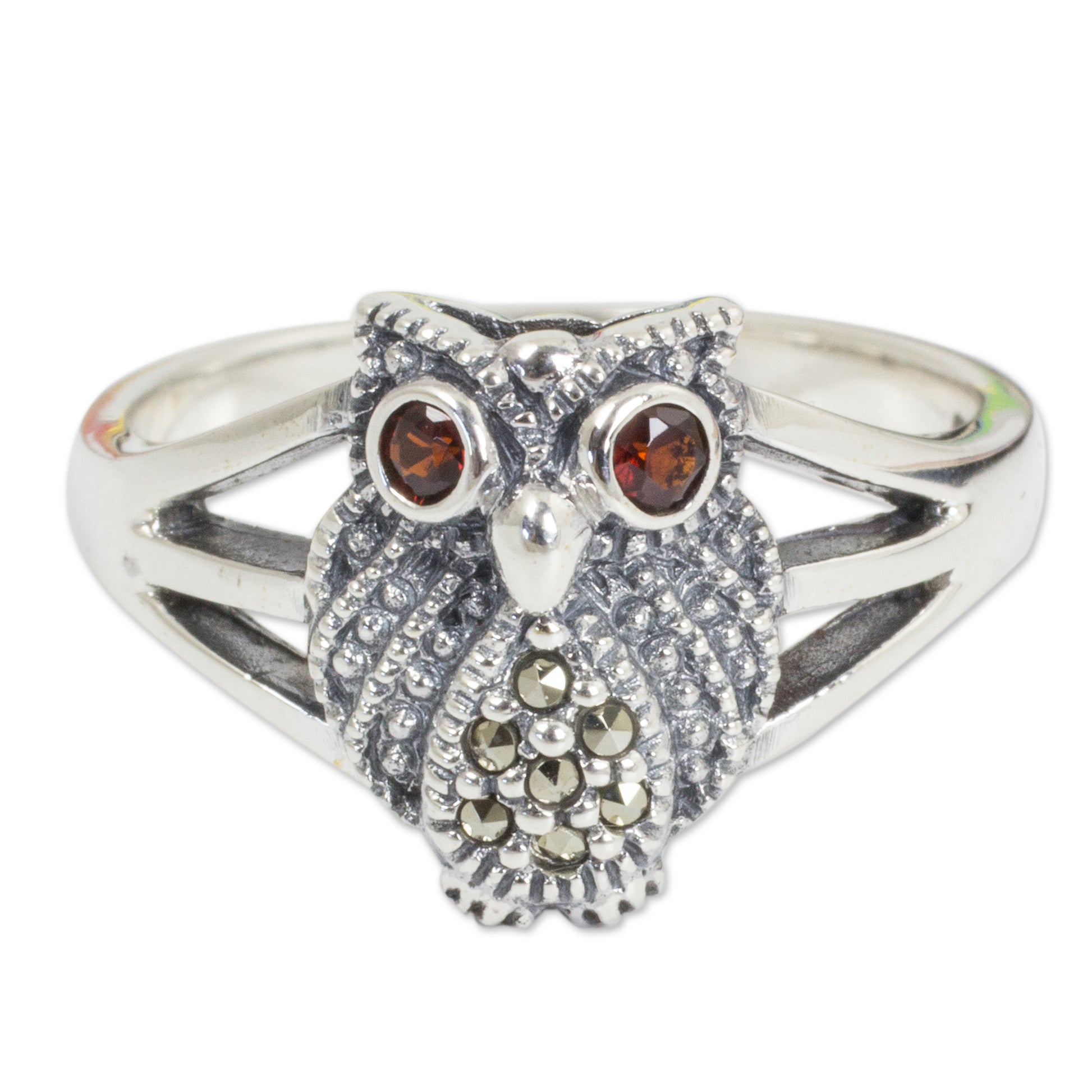 An owl with bright garnet eyes comes to life in sterling silver. Set with faceted marcasite, the wise little bird adorns a cocktail ring by Narinee in Thailand.