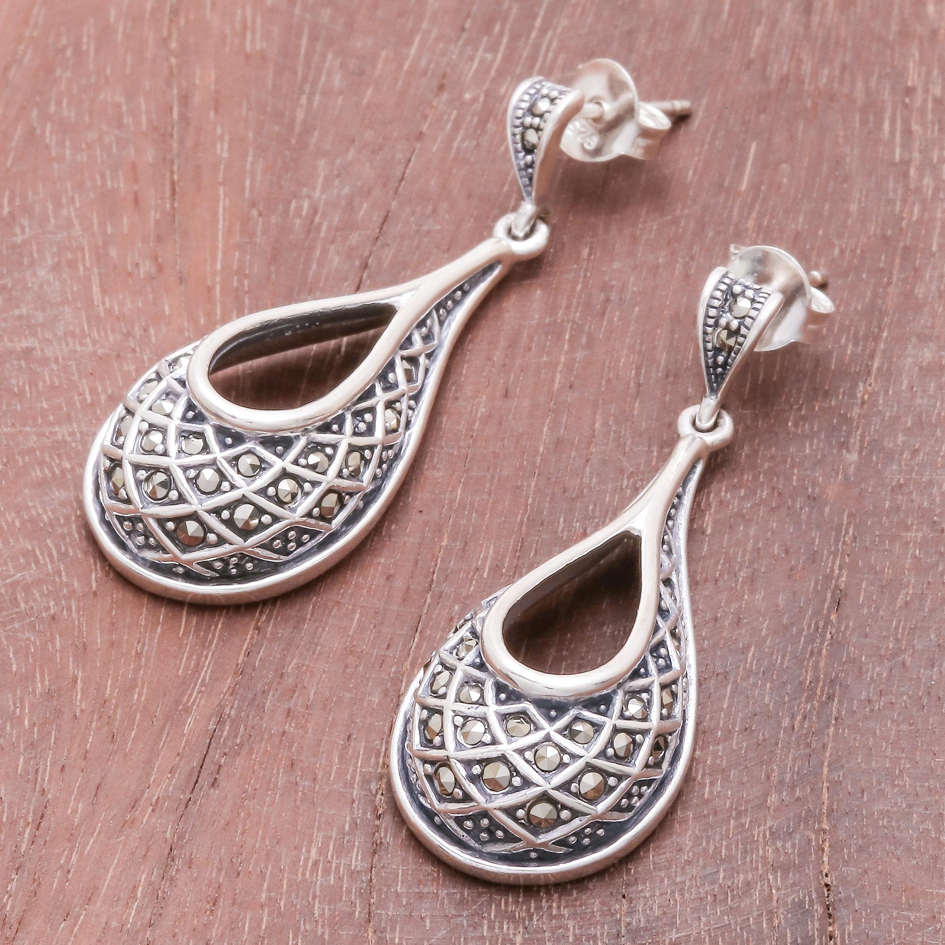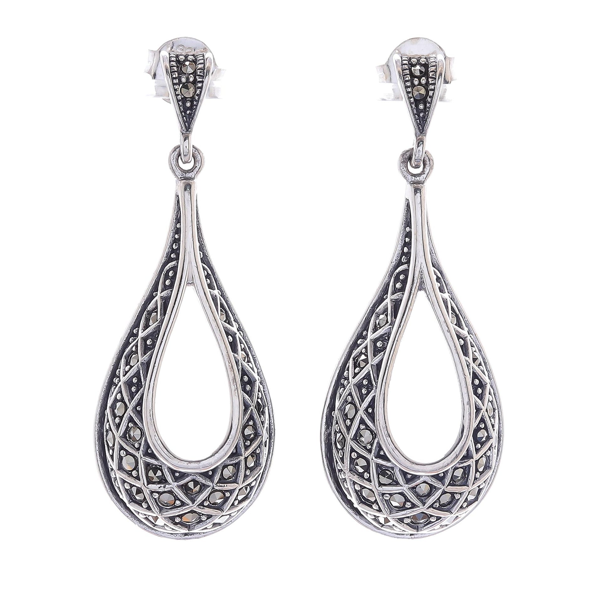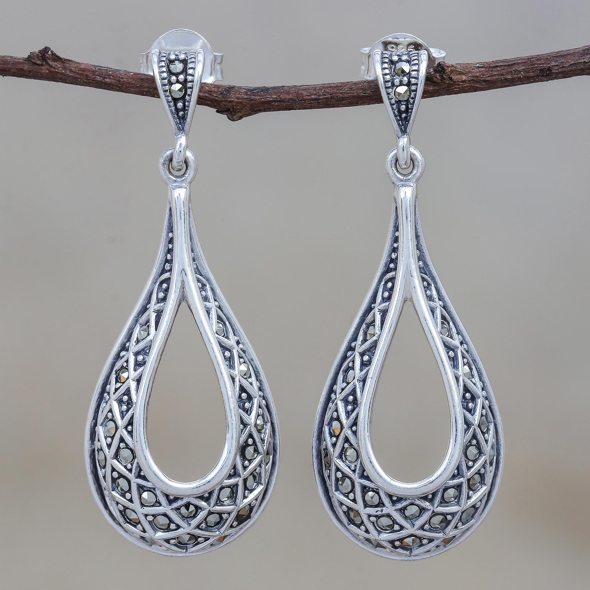 Featuring intricate patterns, two open teardrops are crafted from sterling silver and given a combination of finishes. Thai artisan Narinee creates these earrings, paved with glittering marcasite stones that total 3.5 carats.