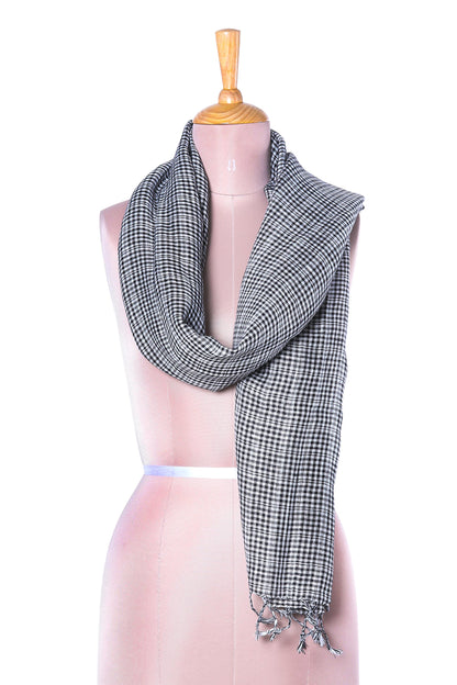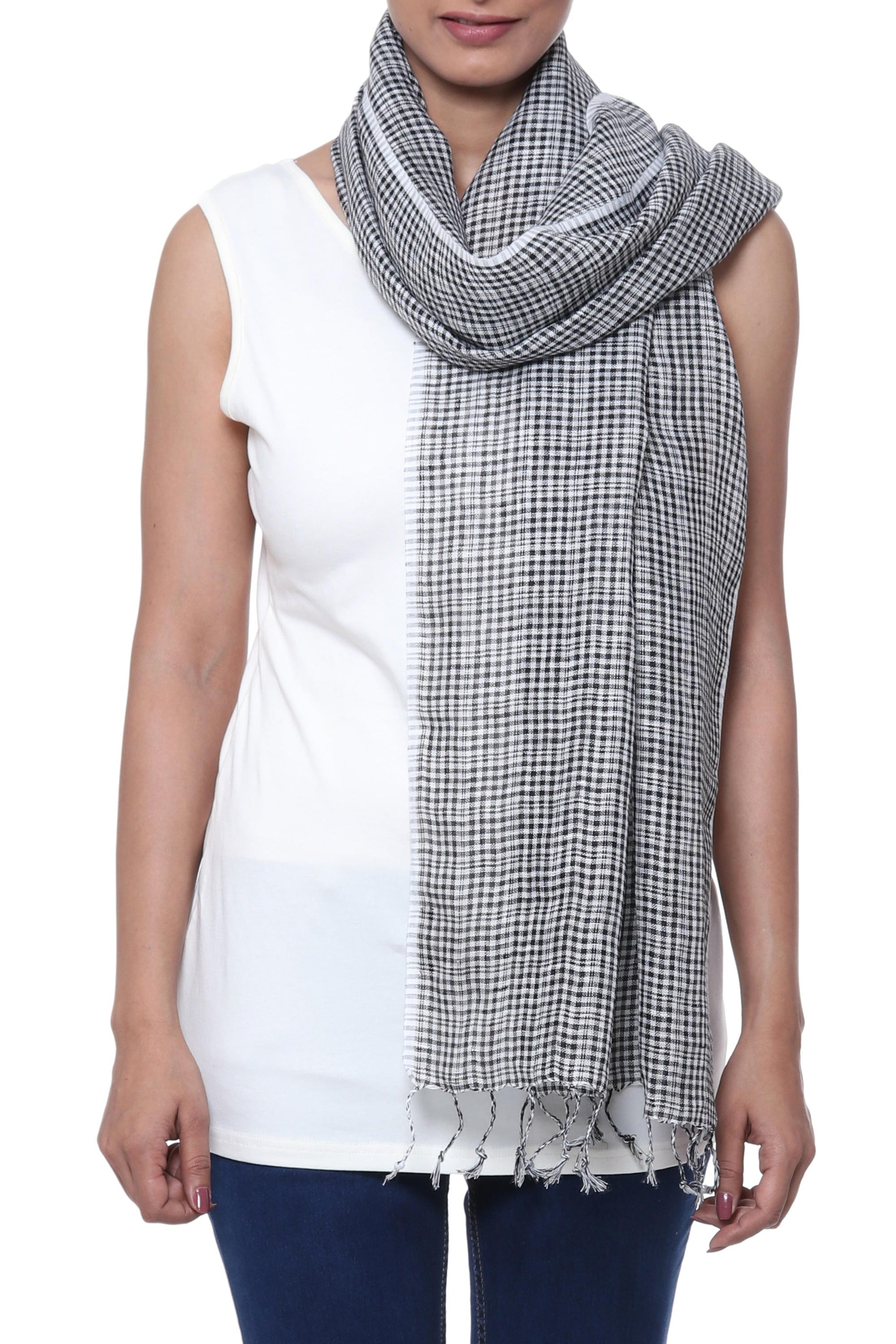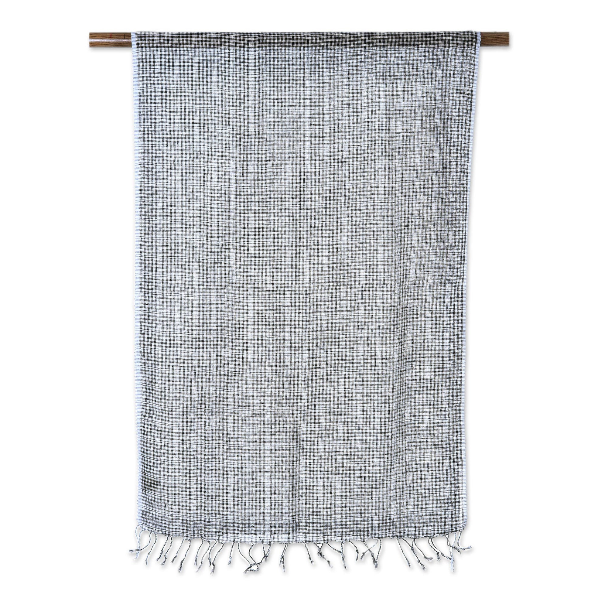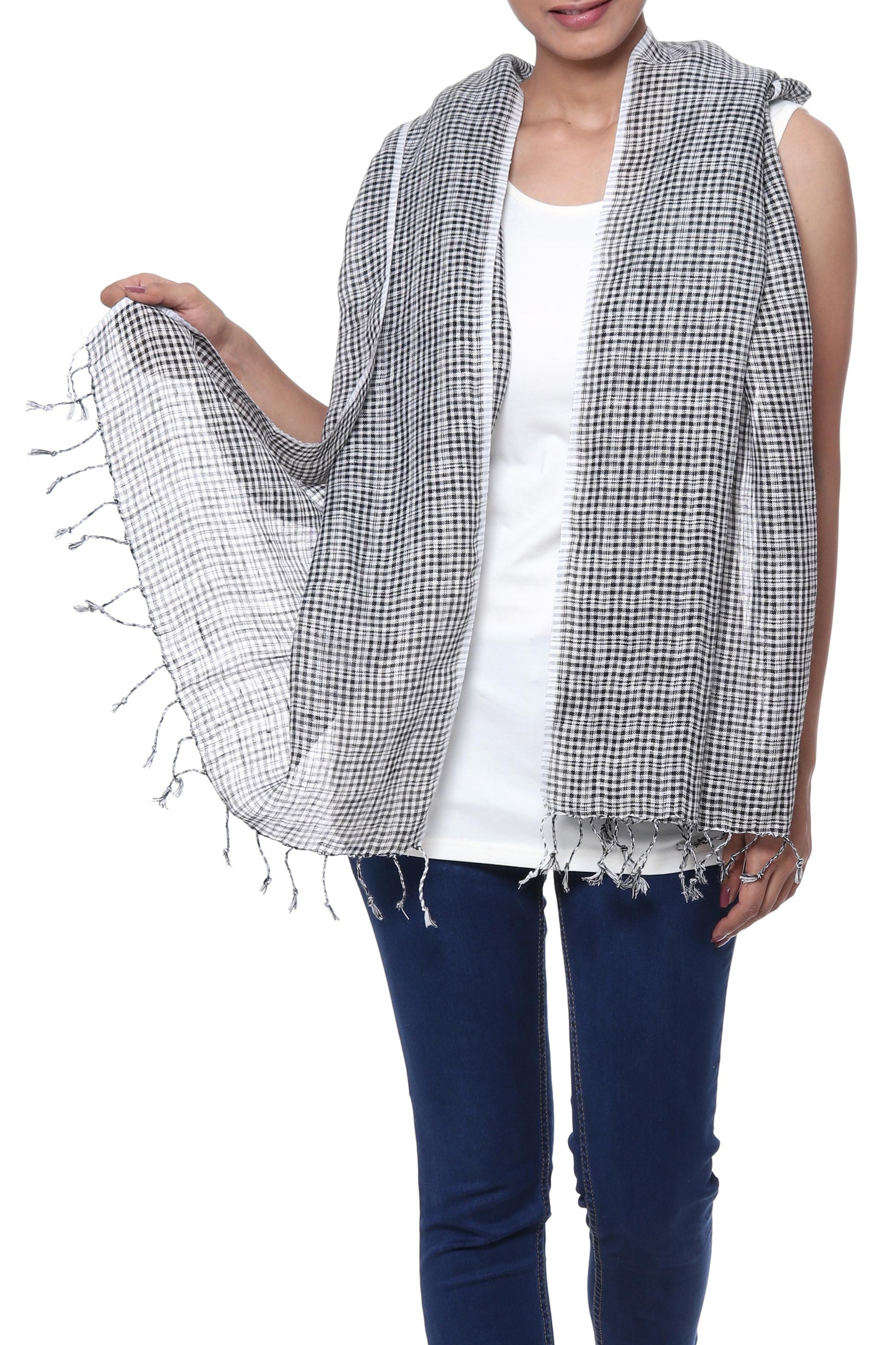 For a delightfully magical addition to your wardrobe, this wrap scarf is designed by India's Gautam Saraf. He works with local artisans, weaving the scarf by hand of linen. Black and white combine to create elegant check motifs along the scarf's length, completed at the ends with elegant fringes. The scarf's width allows it to double as a shawl.