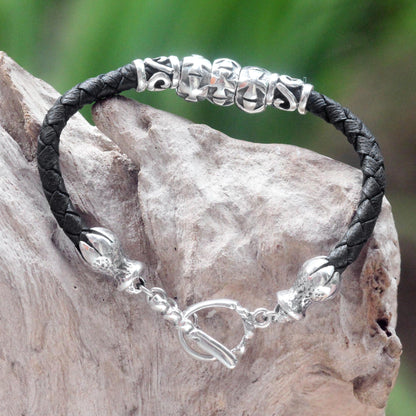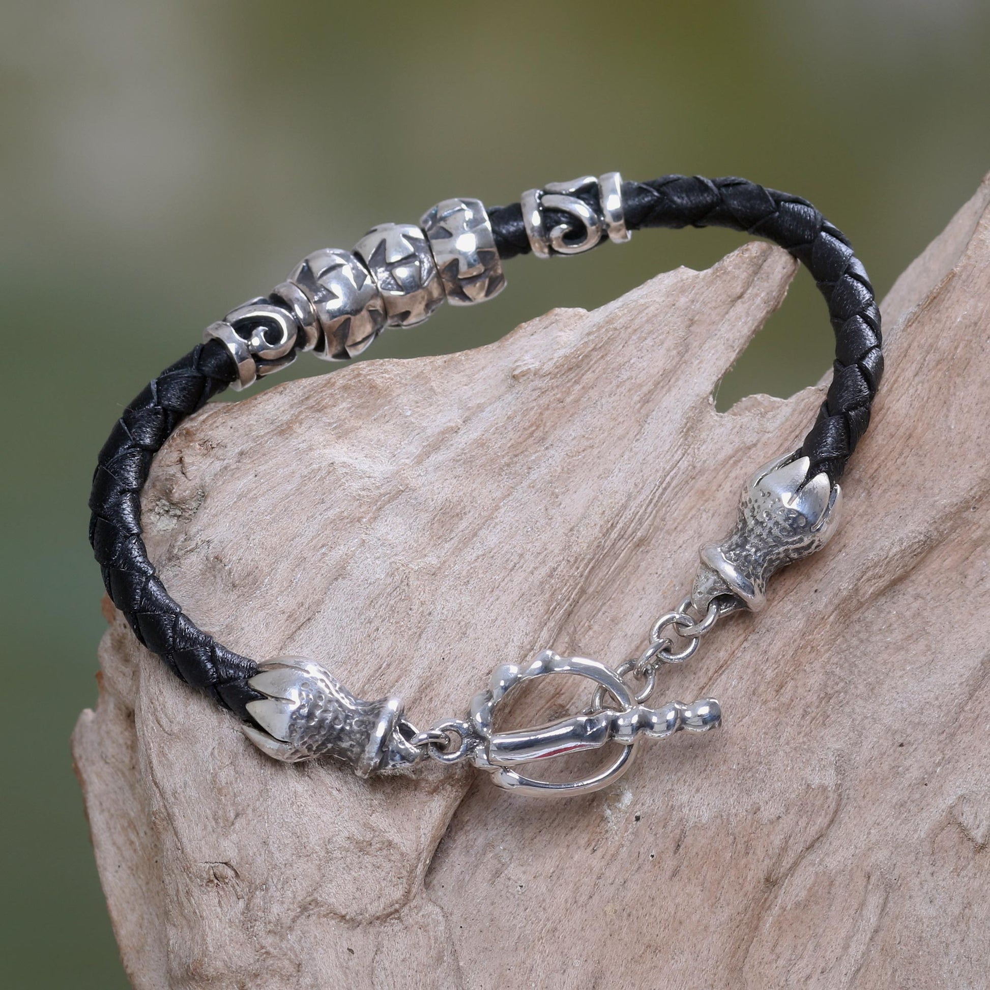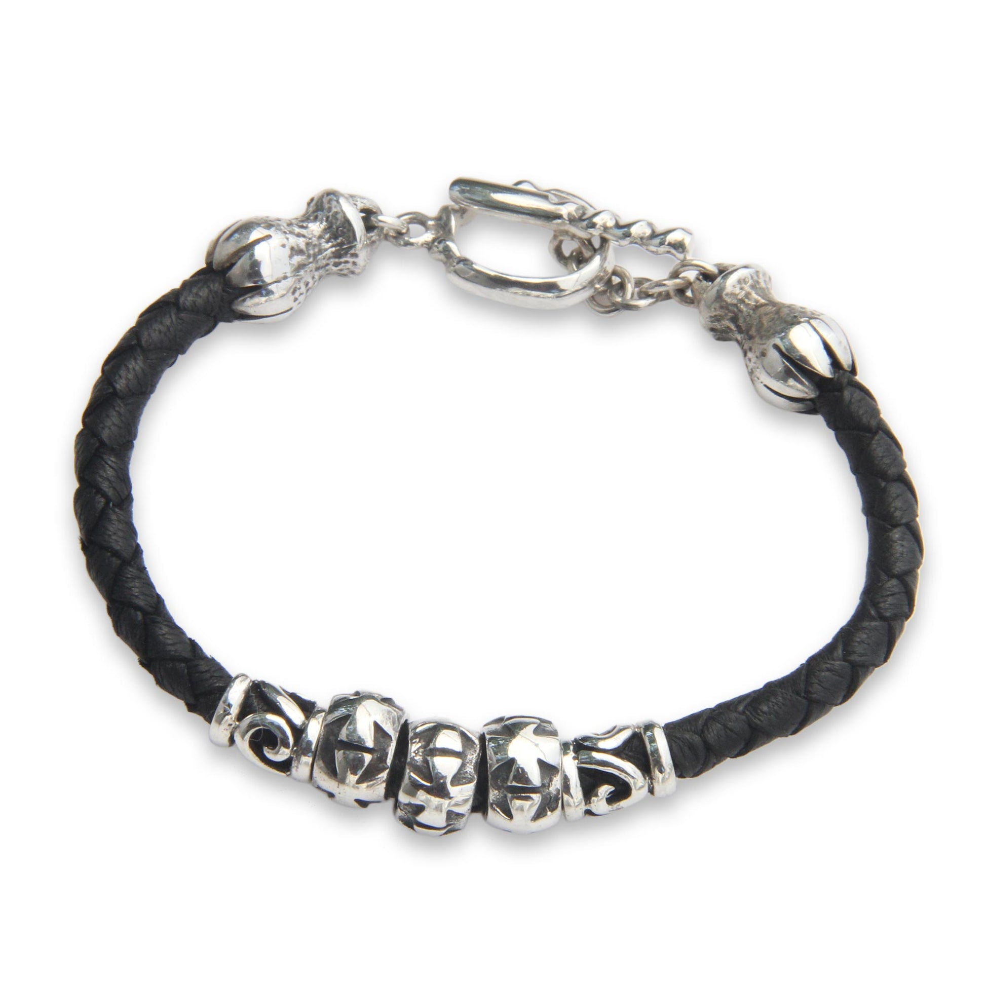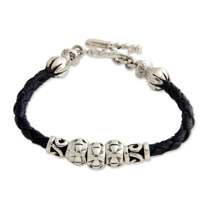 Warm and elegant, this bracelet is braided by hand from supple black leather. Three silver beads depict a trio of Maltese crosses to center a unique design by Henry Anthony Sanny.