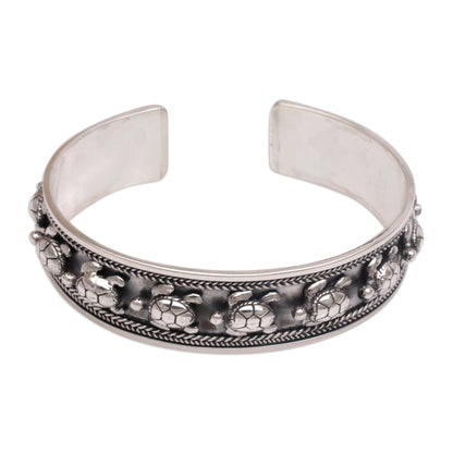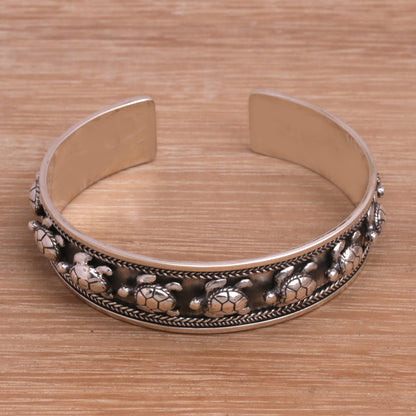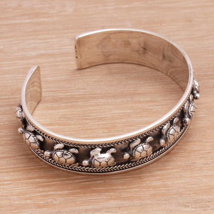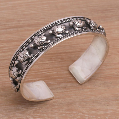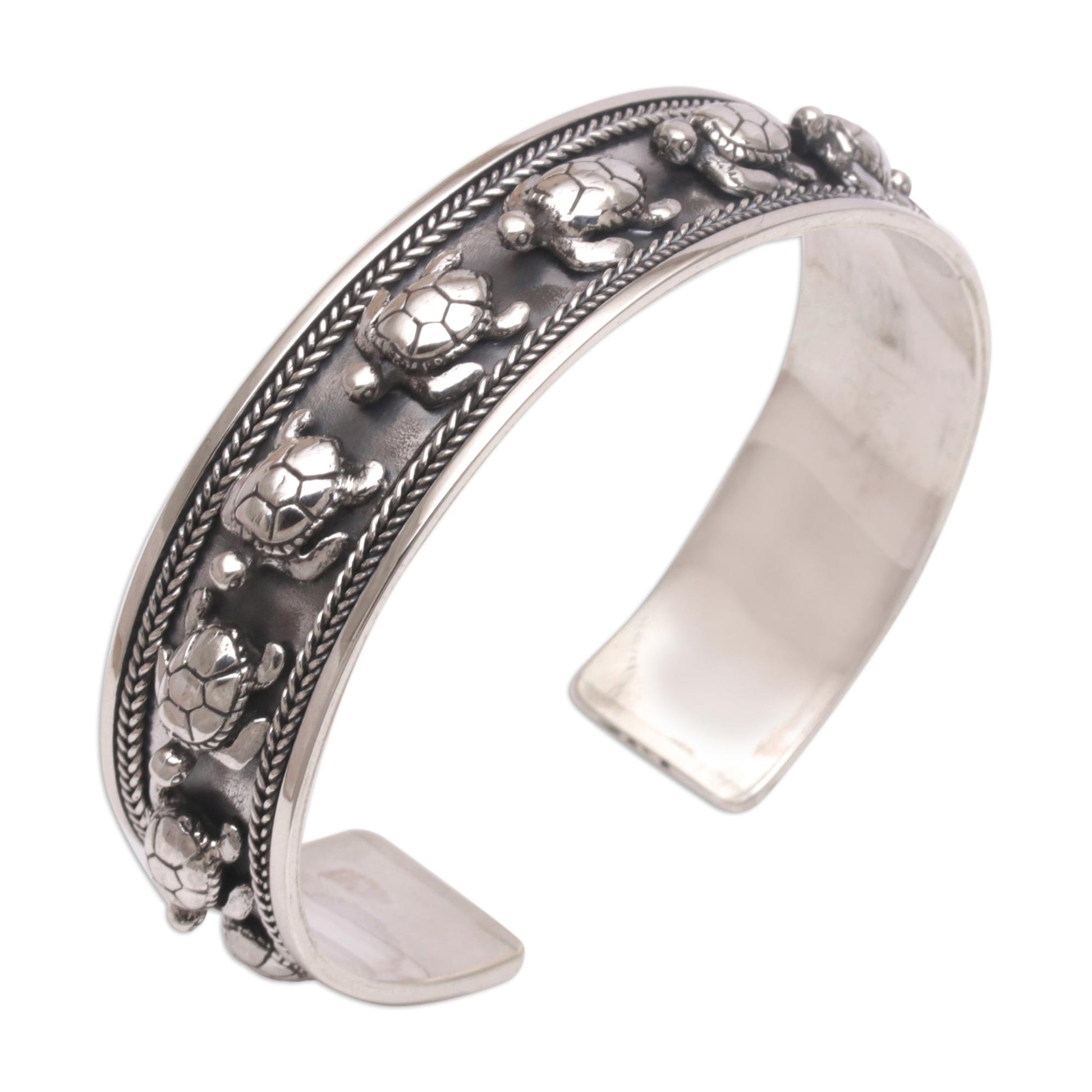 During the annual mating season, sea turtles can be seen on the beach by the thousands, searching for the perfect spot to lay their eggs and ensure their young are protected from predators. Here, this turtle parade is depicted in stunning sterling silver in a handcrafted cuff bracelet by Balinese artisan Cahya Krisna. Flanked on each side by a braided-motif, sea turtles march single file with intricately detailed shell patterns.
