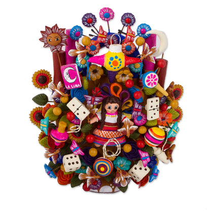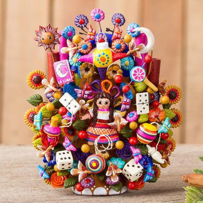 Javier Ramirez celebrates the variety of Mexican toys with this 'tree of life' sculpture. In the center, a young girl in traditional clothing is surrounded by figurines depicting flowers and birds alongside piñatas, spinning tops, dice, and yo-yos, among other toys. Each piece is diligently crafted from ceramic and painted by hand, assembled by steel wire.