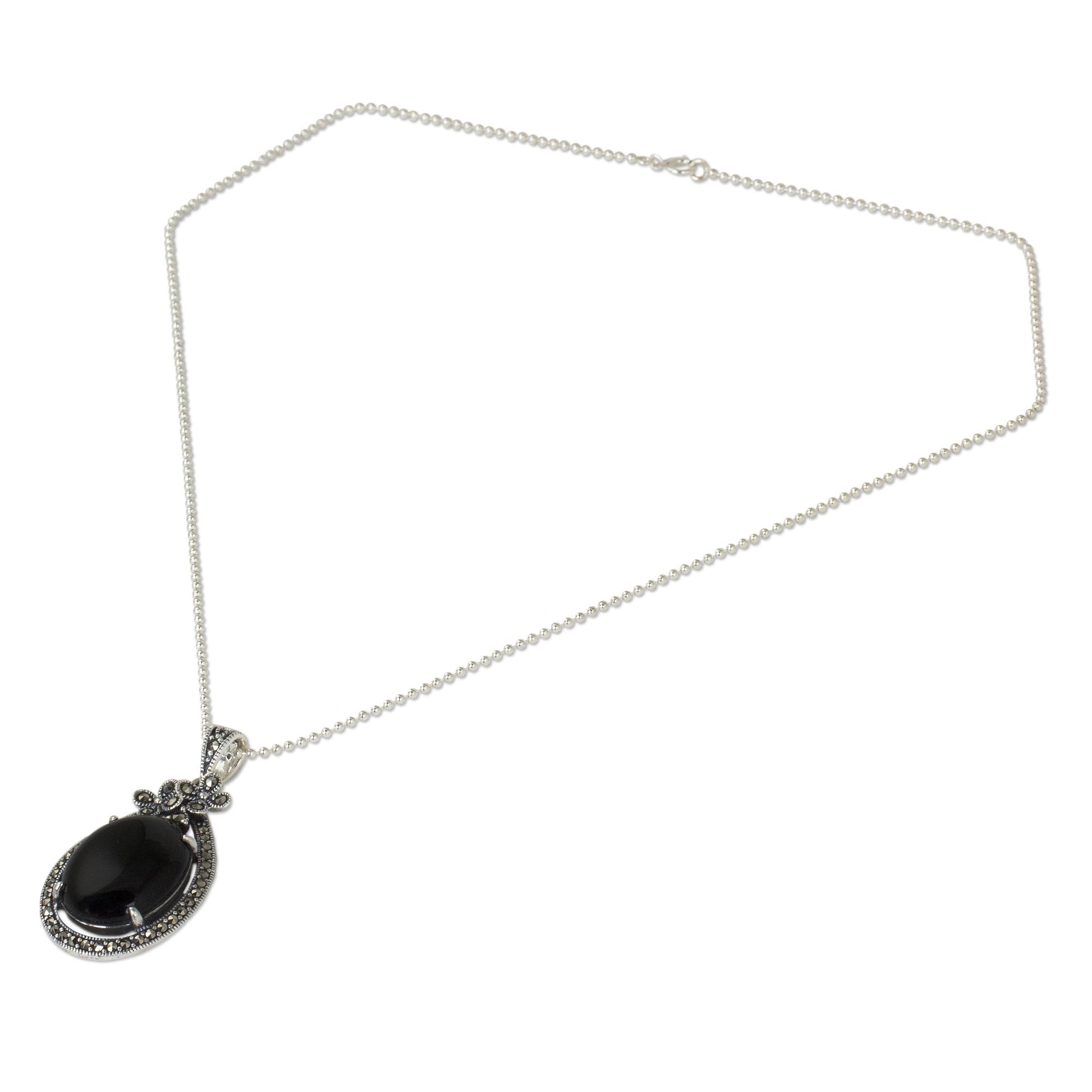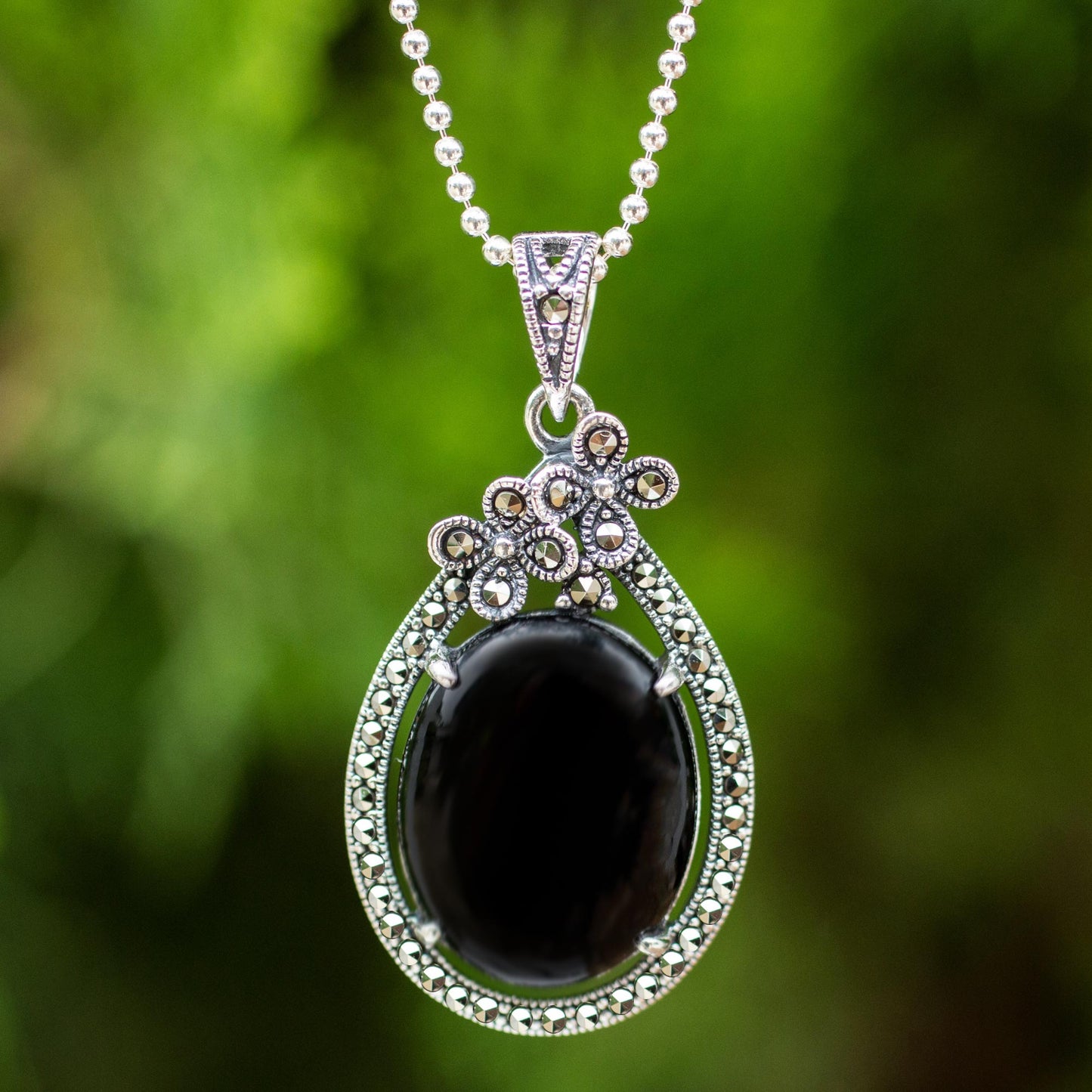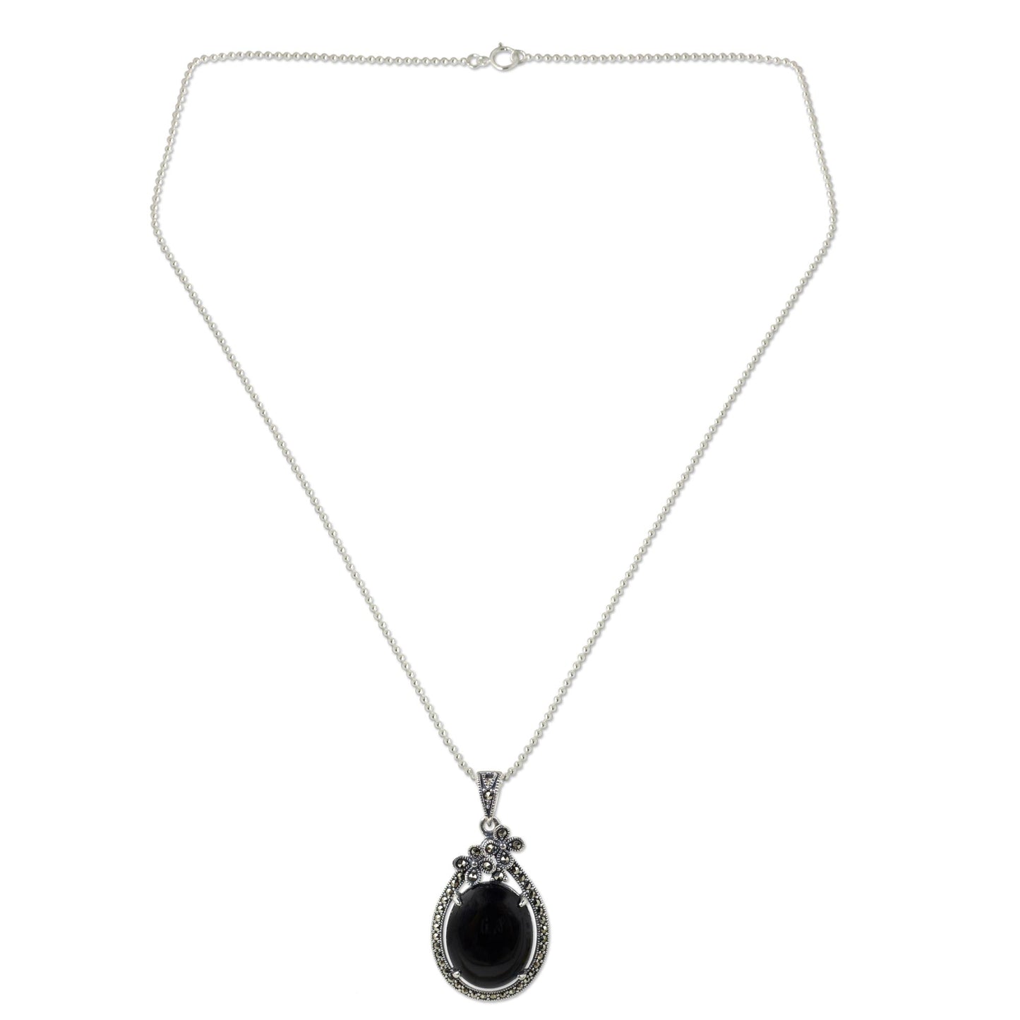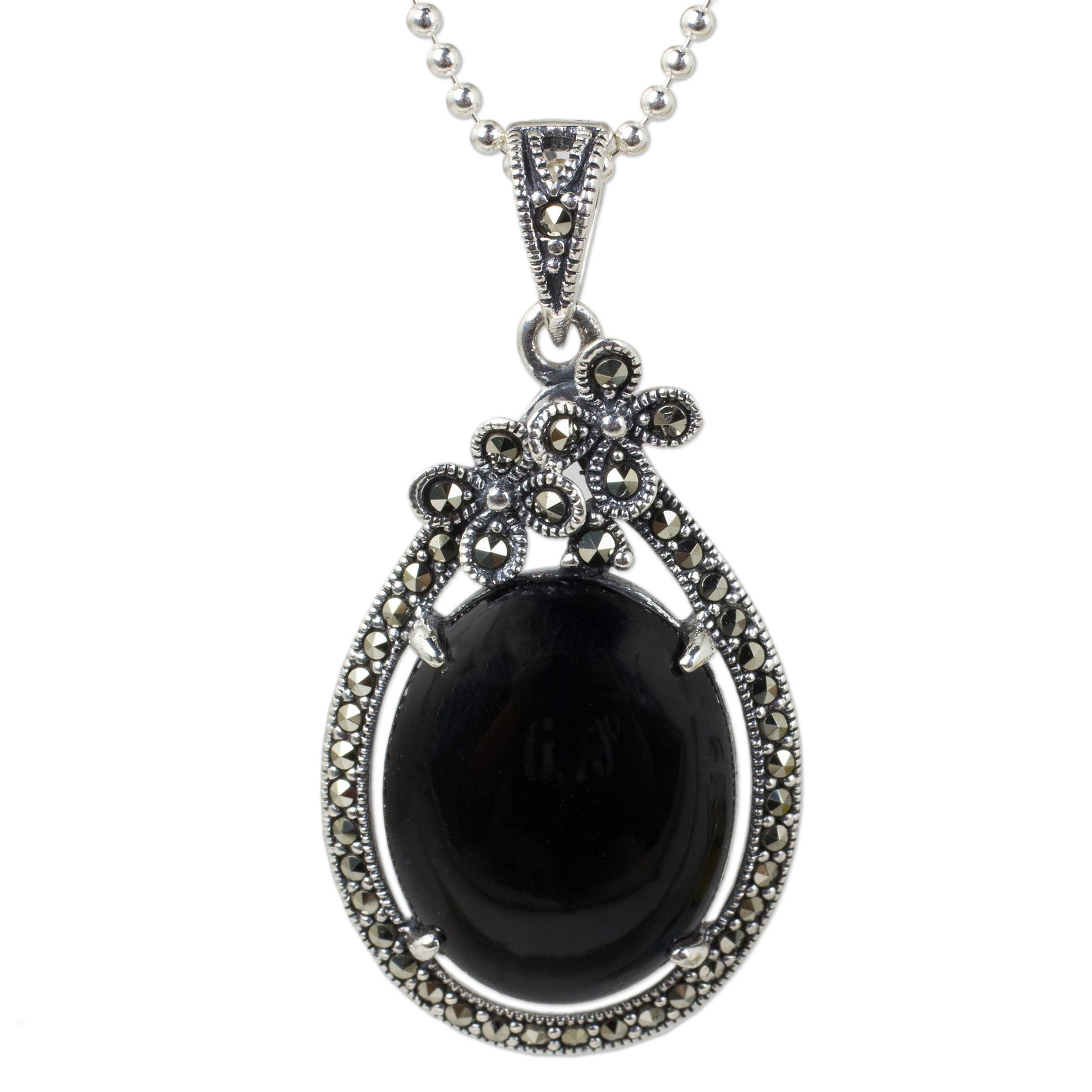 Marcasites surround the deep glow of onyx in a pendant crowned with shimmering daisies. Rich in Thai artistry, the feminine design of this sterling silver necklace is by Narinee.