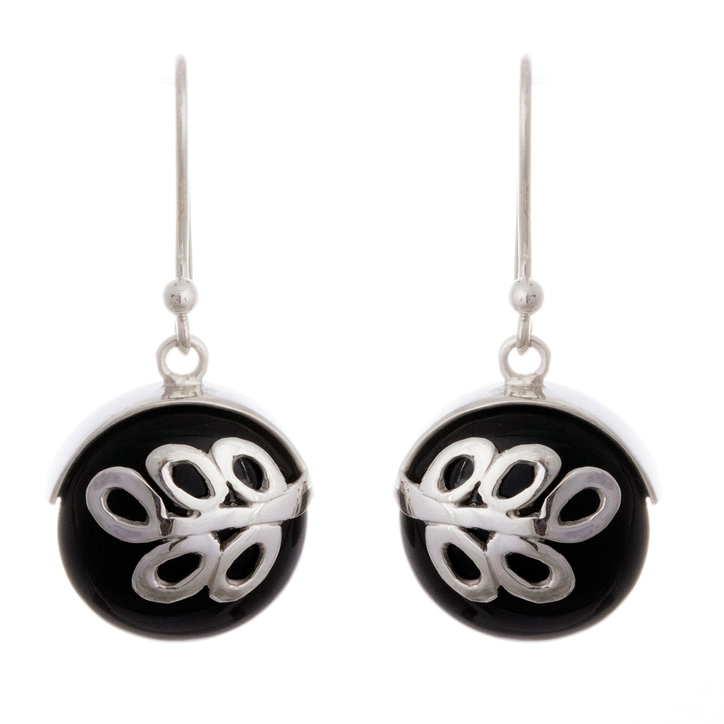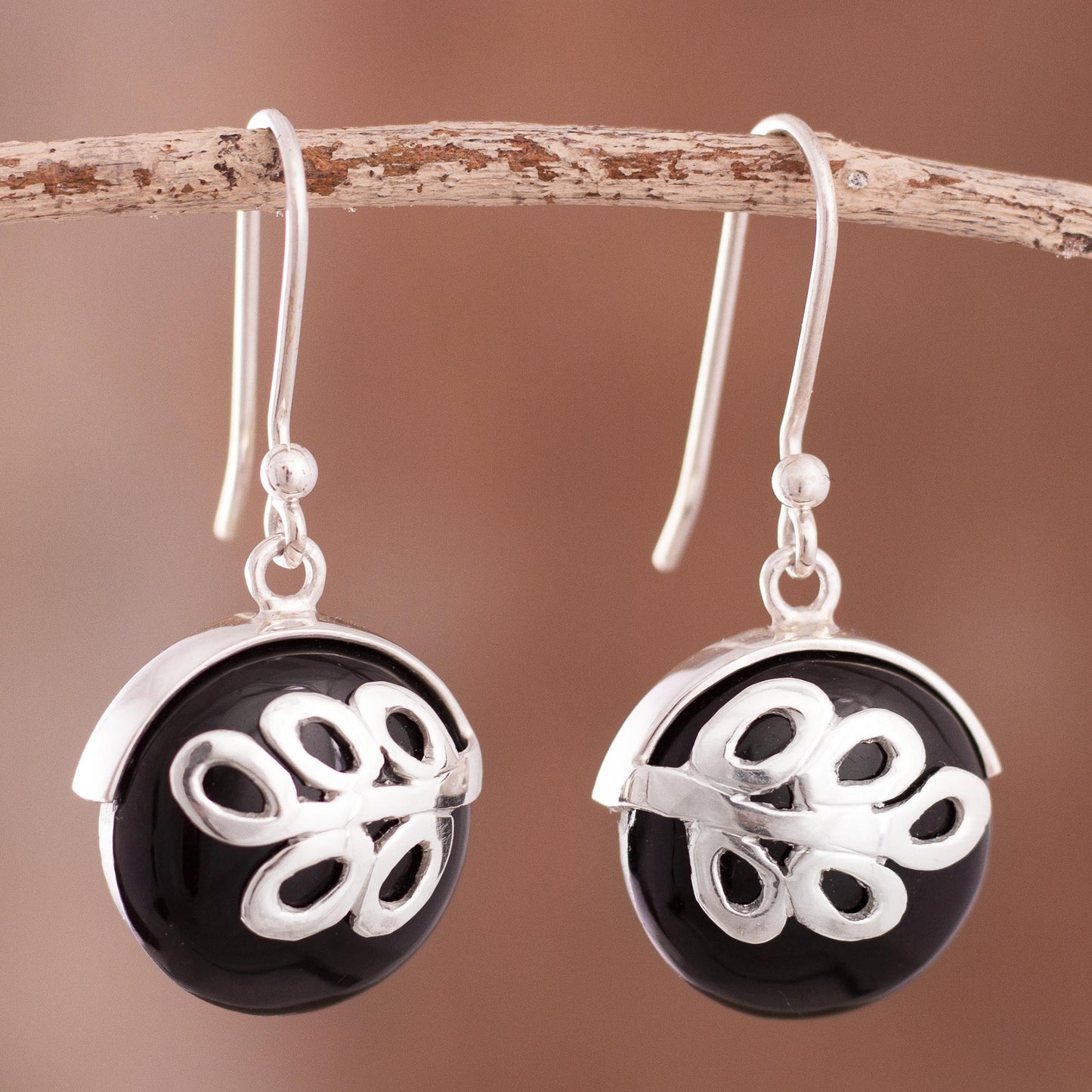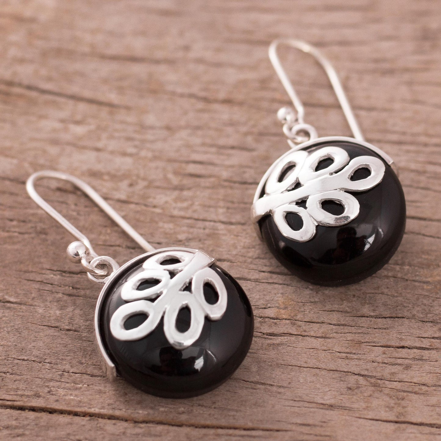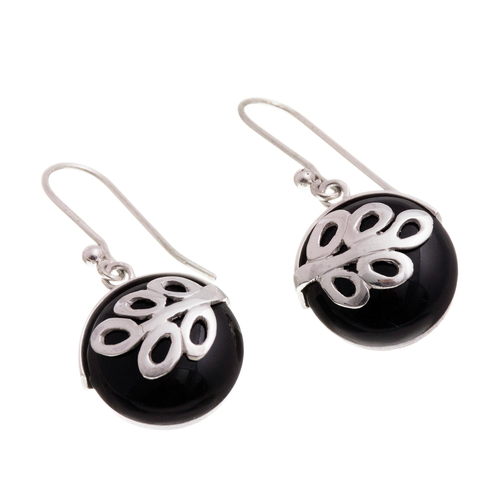 Sterling ferns embrace rounded disks of black obsidian. Andean designer Ana Cristina Llapa showcases the sleek gemstone in modern handcrafted earrings.