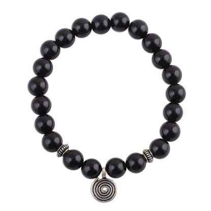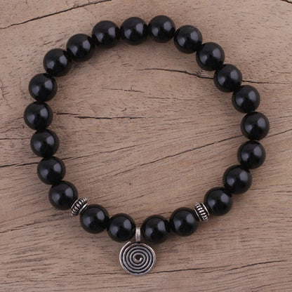 Midnight Swirl Onyx and Silver Beaded Stretch Bracelet from India