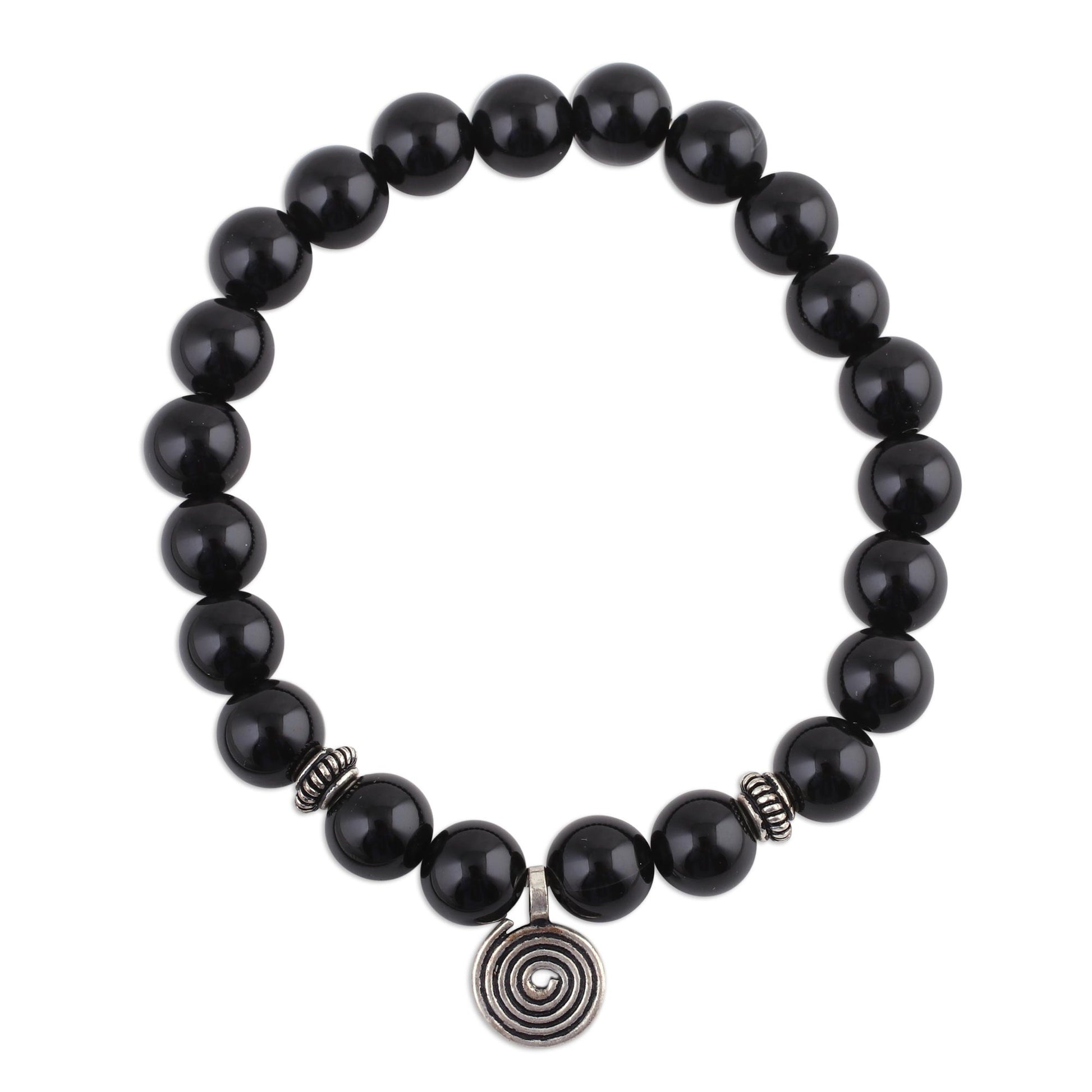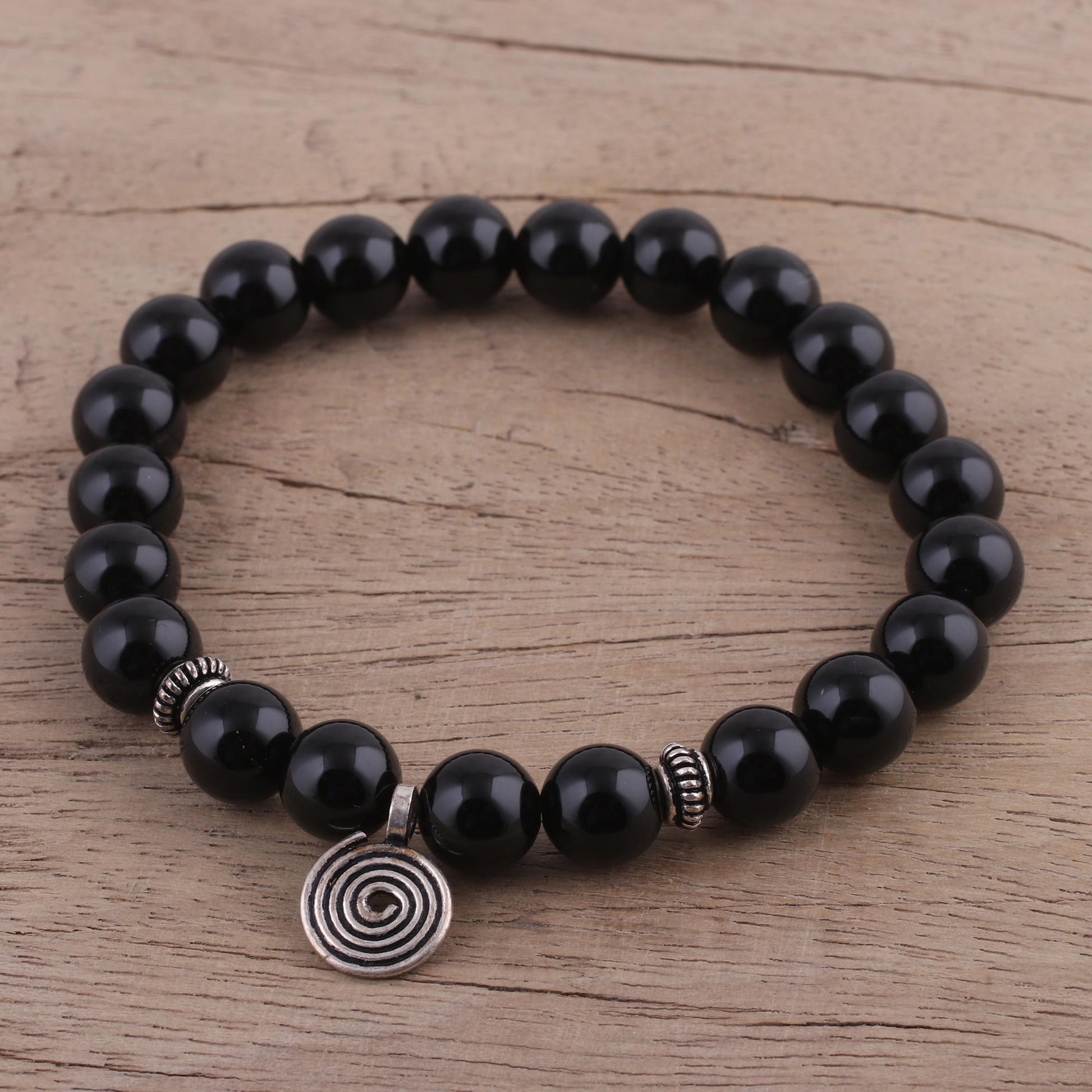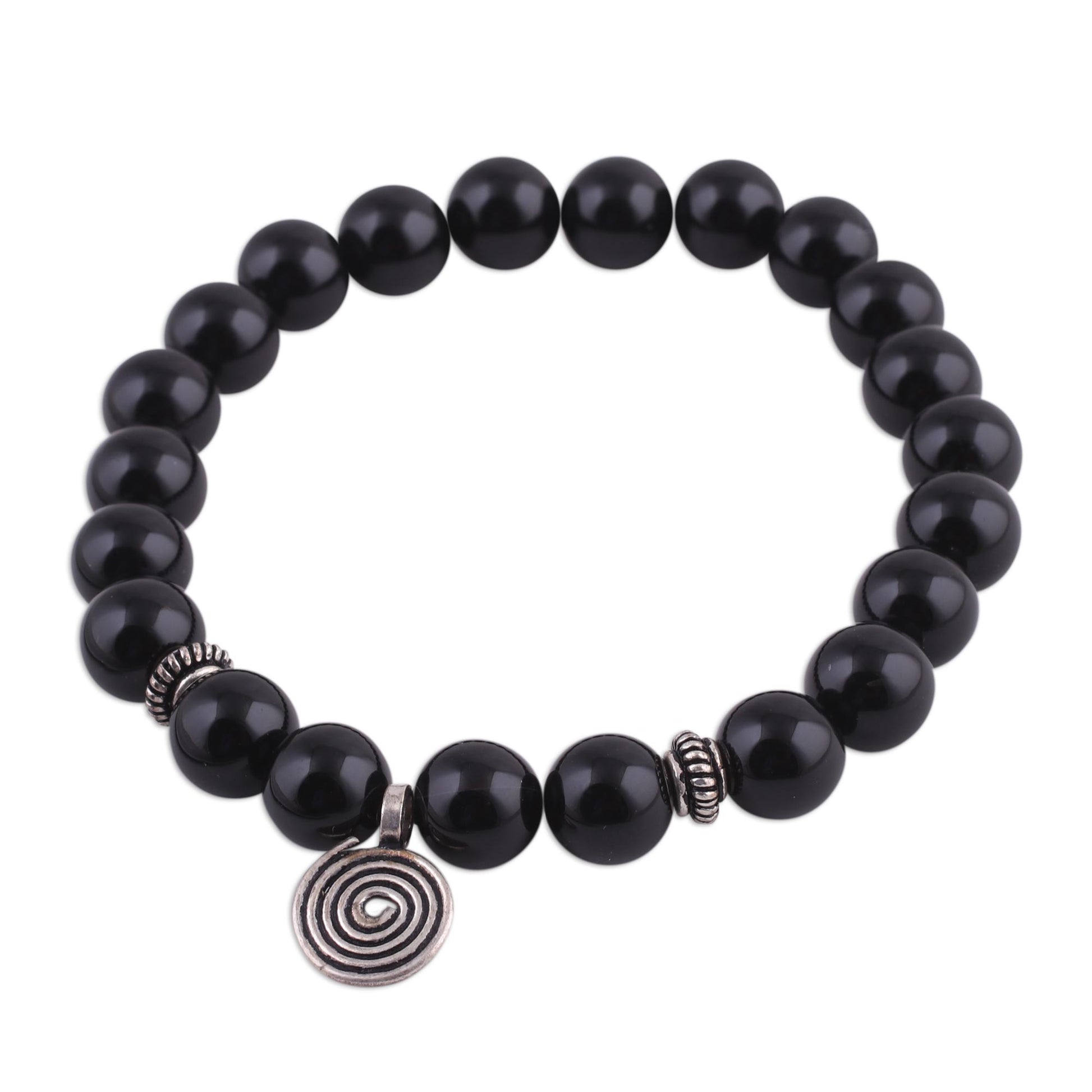 Punctuated by beads and a spiral charm of sterling silver, this stretch bracelet is beaded with black onyx gemstones that circle the wrist. India's Neetu Barathi designs the bracelet, inspired by the mystery of midnight.