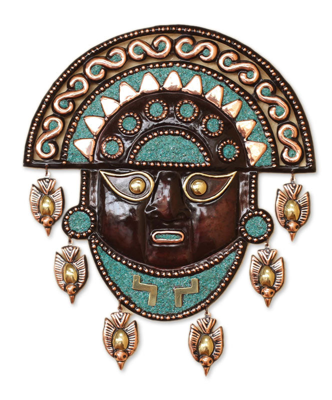 Depicted in a dramatic mask, an ancient Moche ruler wears a headdress honoring the sun god. Working in copper and bronze, Angel Franco commemorates the deities and daily life of ancient Andean peoples.