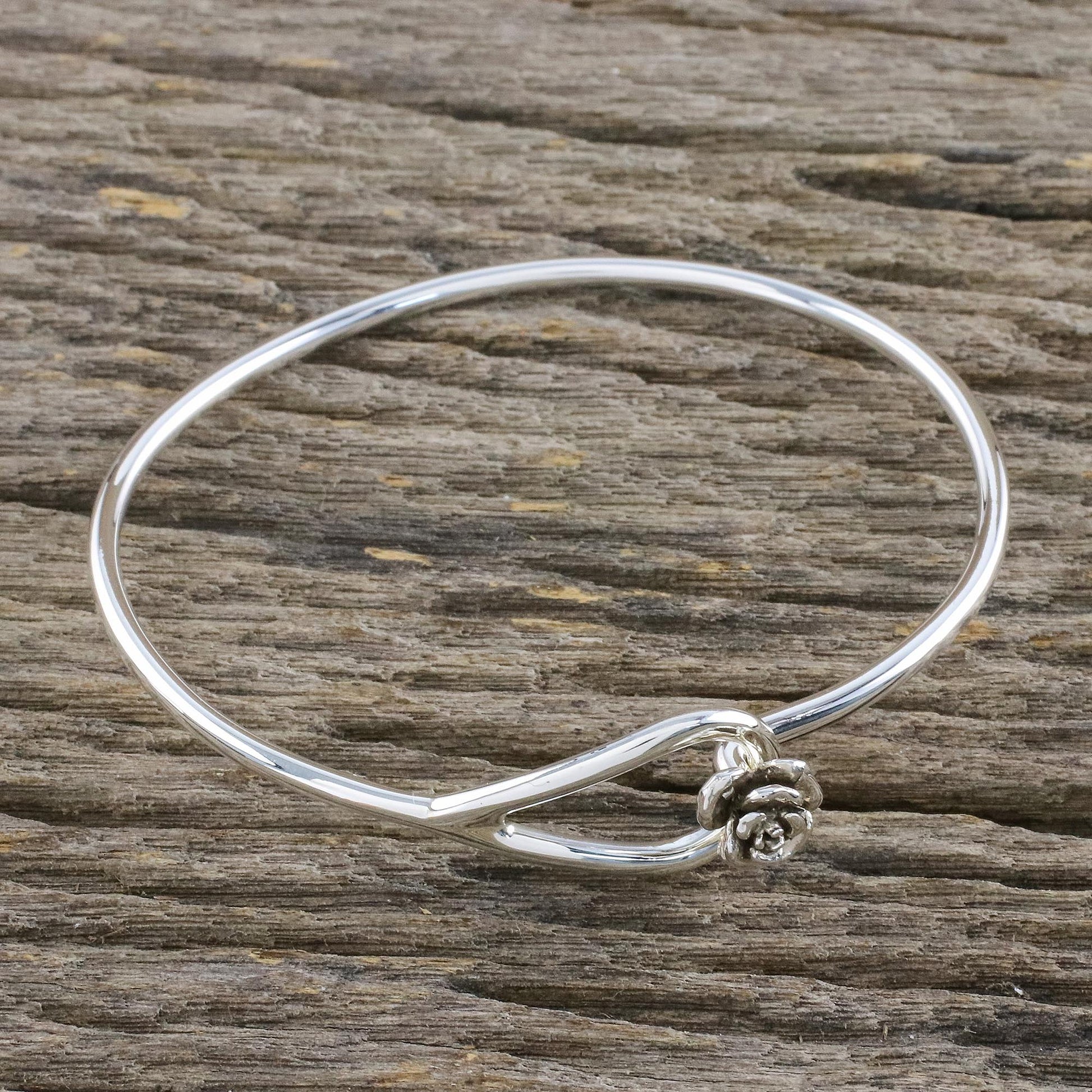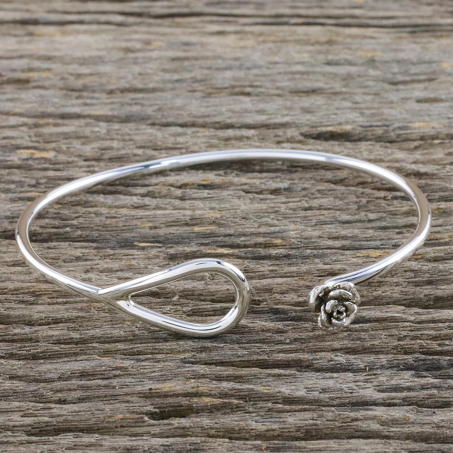 Artisan Aoy of Thailand hand crafts this sterling silver bangle bracelet. Beautiful in its simplicity, the bracelet features a small sterling silver rose that hooks onto a loop in the sterling silver bangle as a closure. About her work, the artisan says: “At our workshop, we still work with our hands to craft our jewelry collections, because we believe it is our duty to preserve this ancient art form.”
