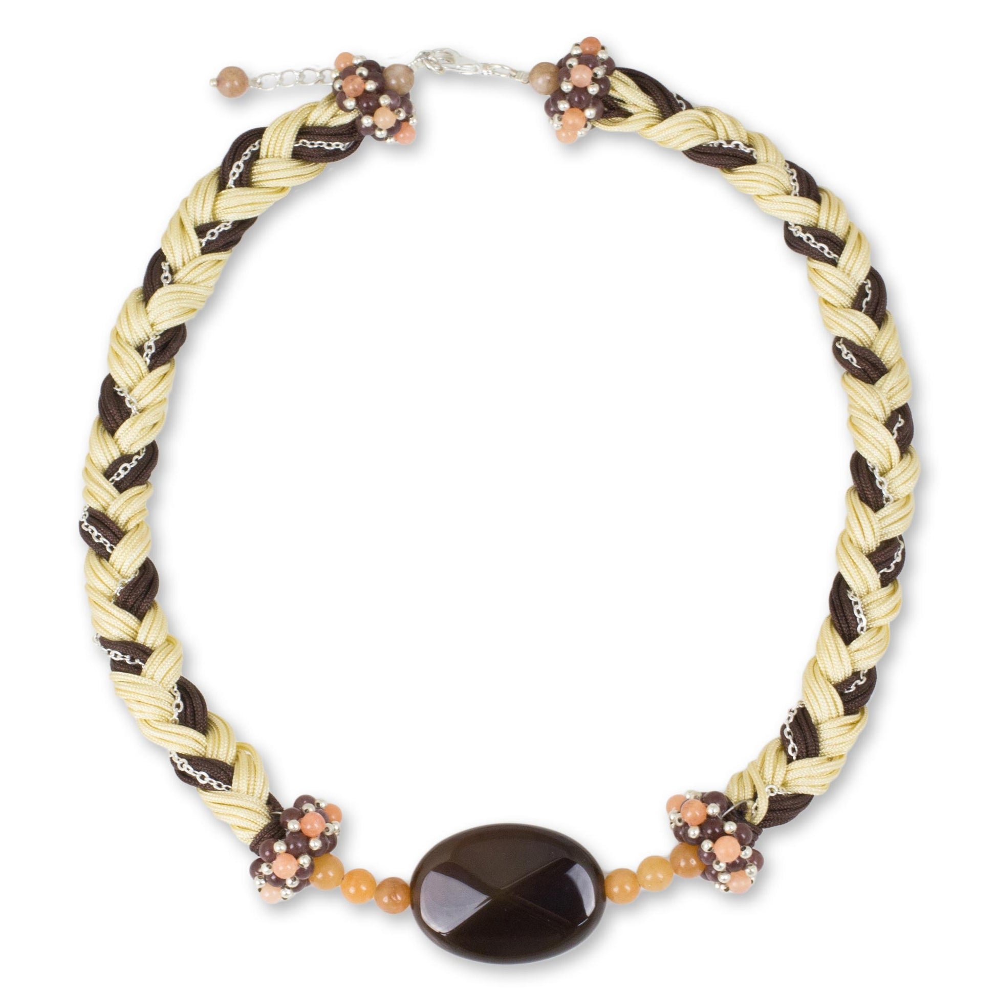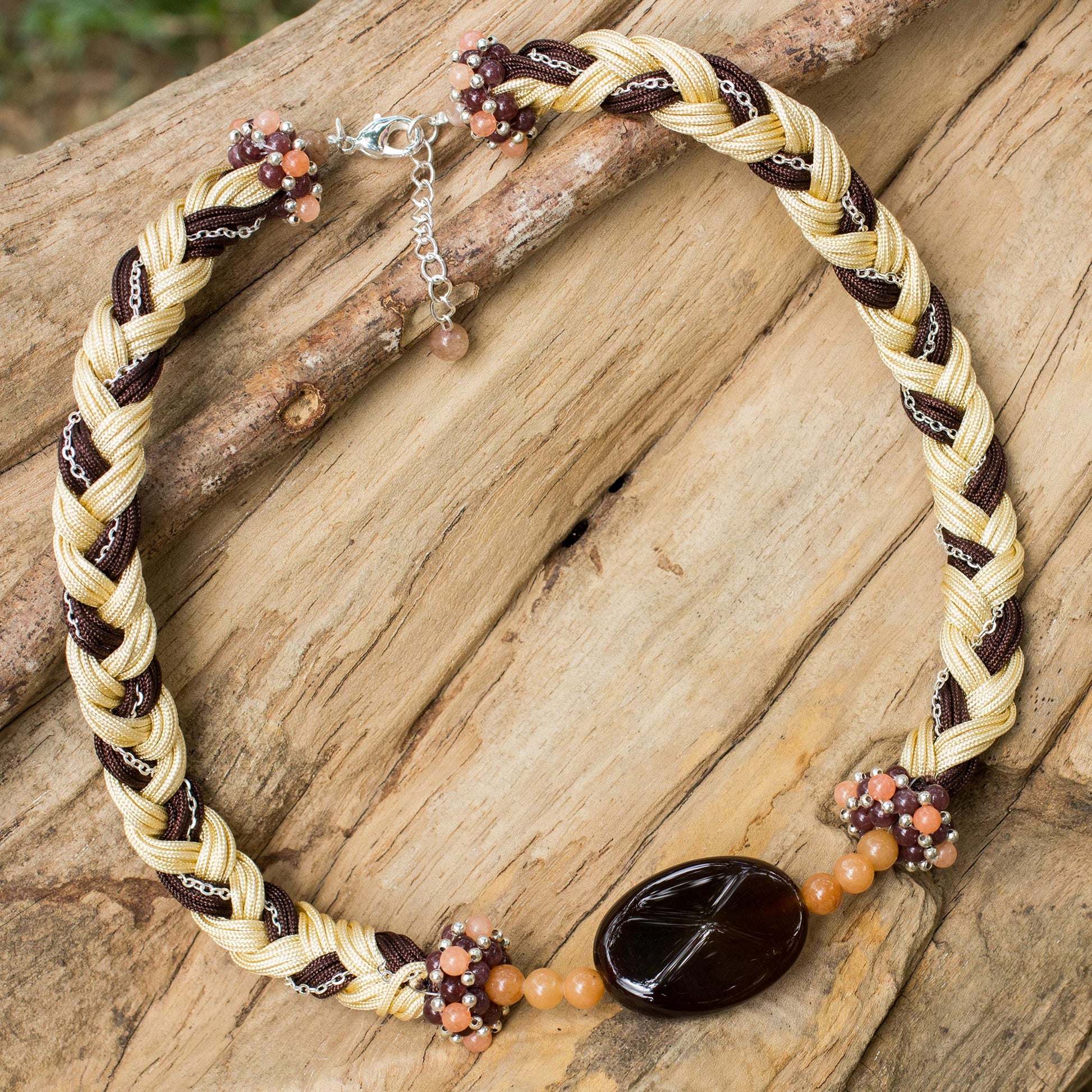 In a unique interpretation of bohemian style, Thai artisan Nareerat presents this intriguing necklace. She braids nylon cords in cream and brown, incorporating a delicate silver-plated cable chain in the braid. Centering the braided necklace are a dark brown polished chalcedony pendant, dyed quartz beads in shades of peach and pale orange, and tiny silver-plated brass beads.