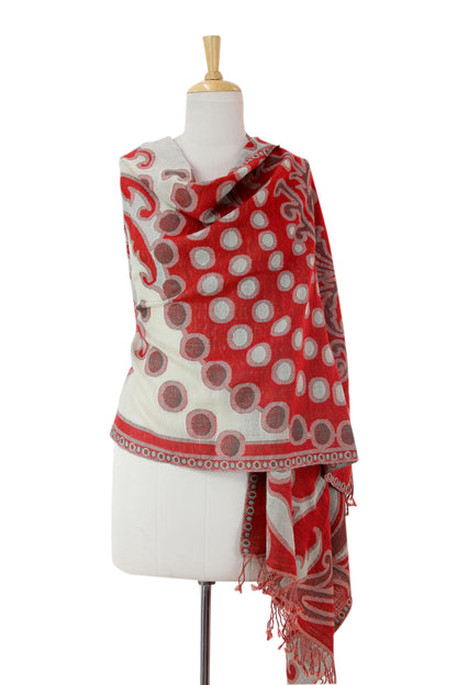 Inspired by ancient jamawar art, this shawl is wonderfully contemporary. Extravagant motifs mingle with circles in red, green and beige. From Sandeep Malhotra, the lightweight wrap is a modern interpretation of the intricate jamawar patterns that were once created with laborious needlework.