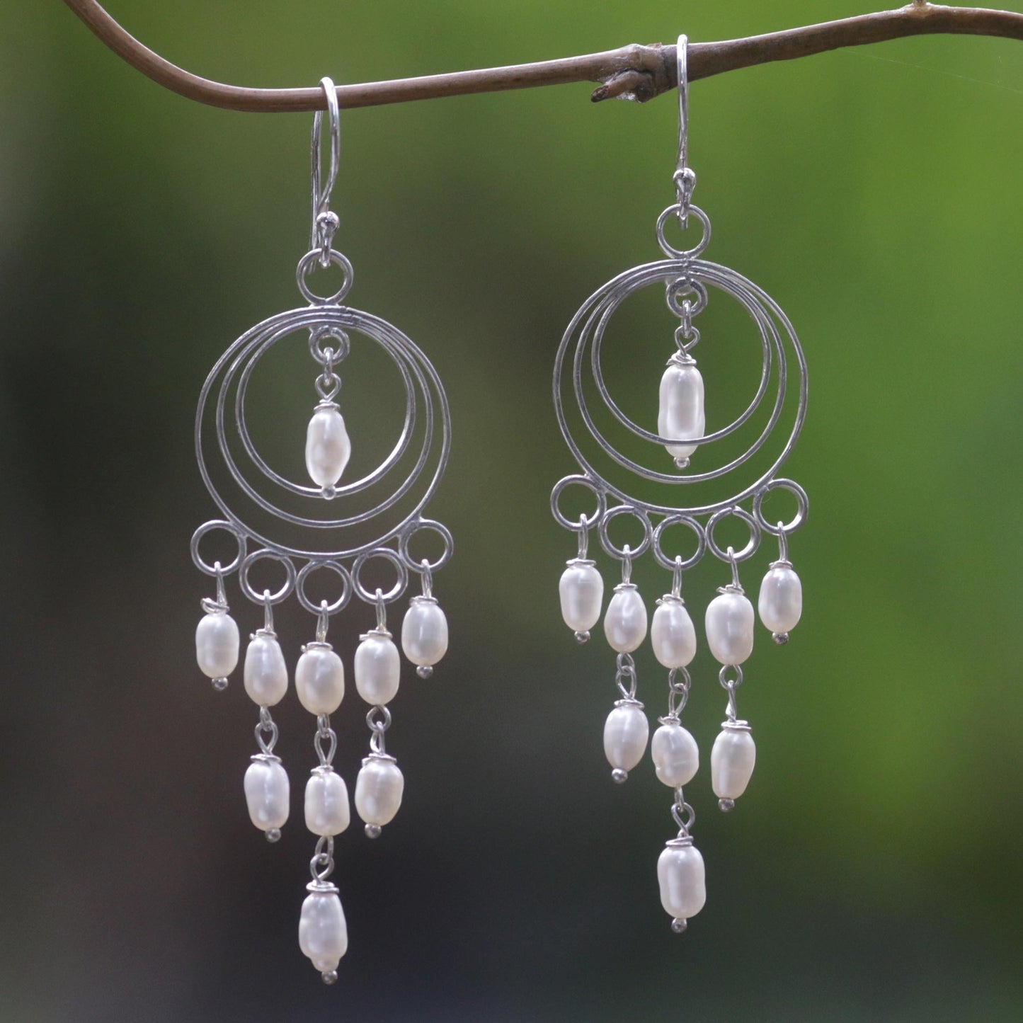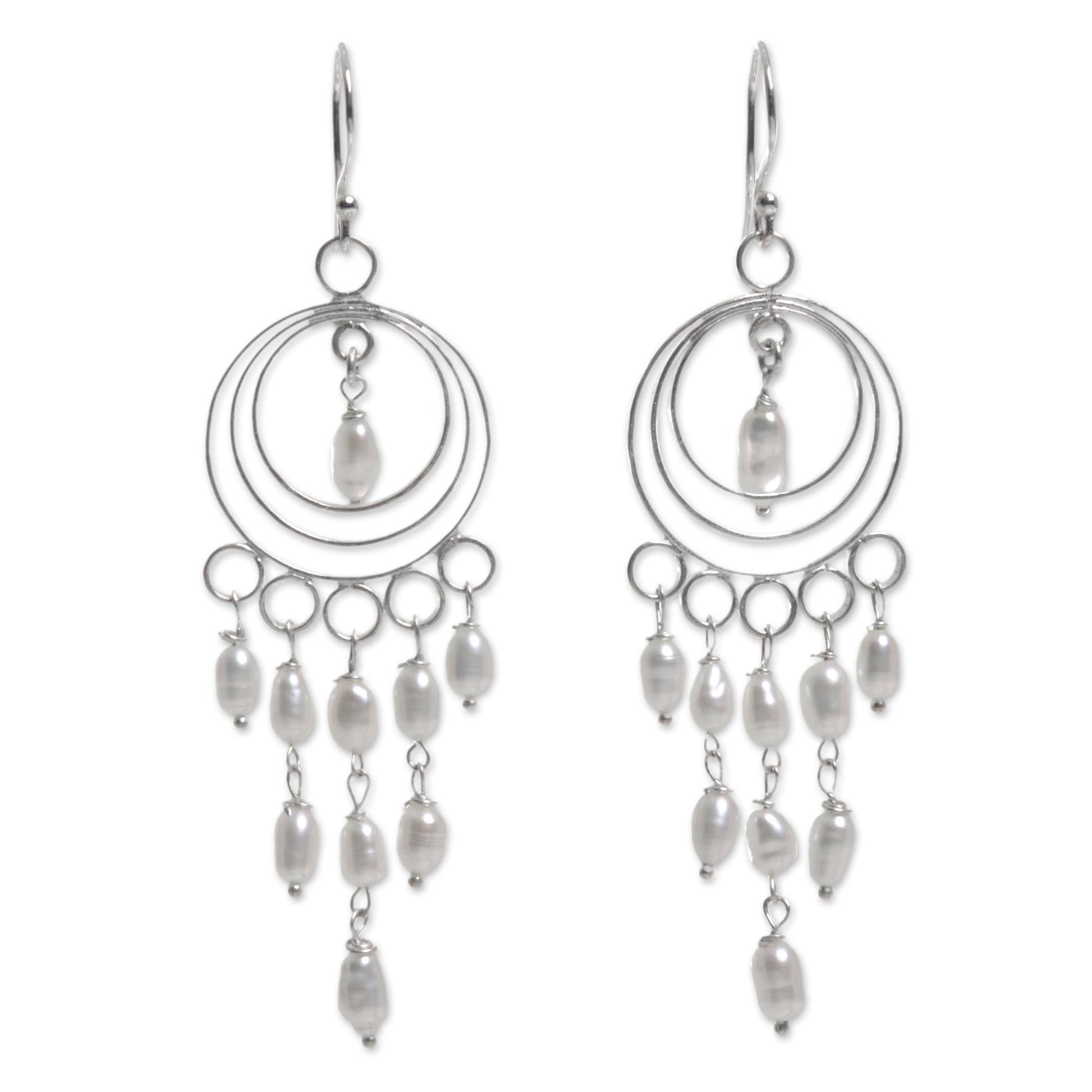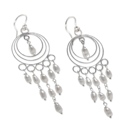 Cultured freshwater pearls hang from circular shapes in this pair of chandelier earrings by Made Sugi. Handcrafted from sterling silver, these Indonesian earrings are as decadent as they are elegant.