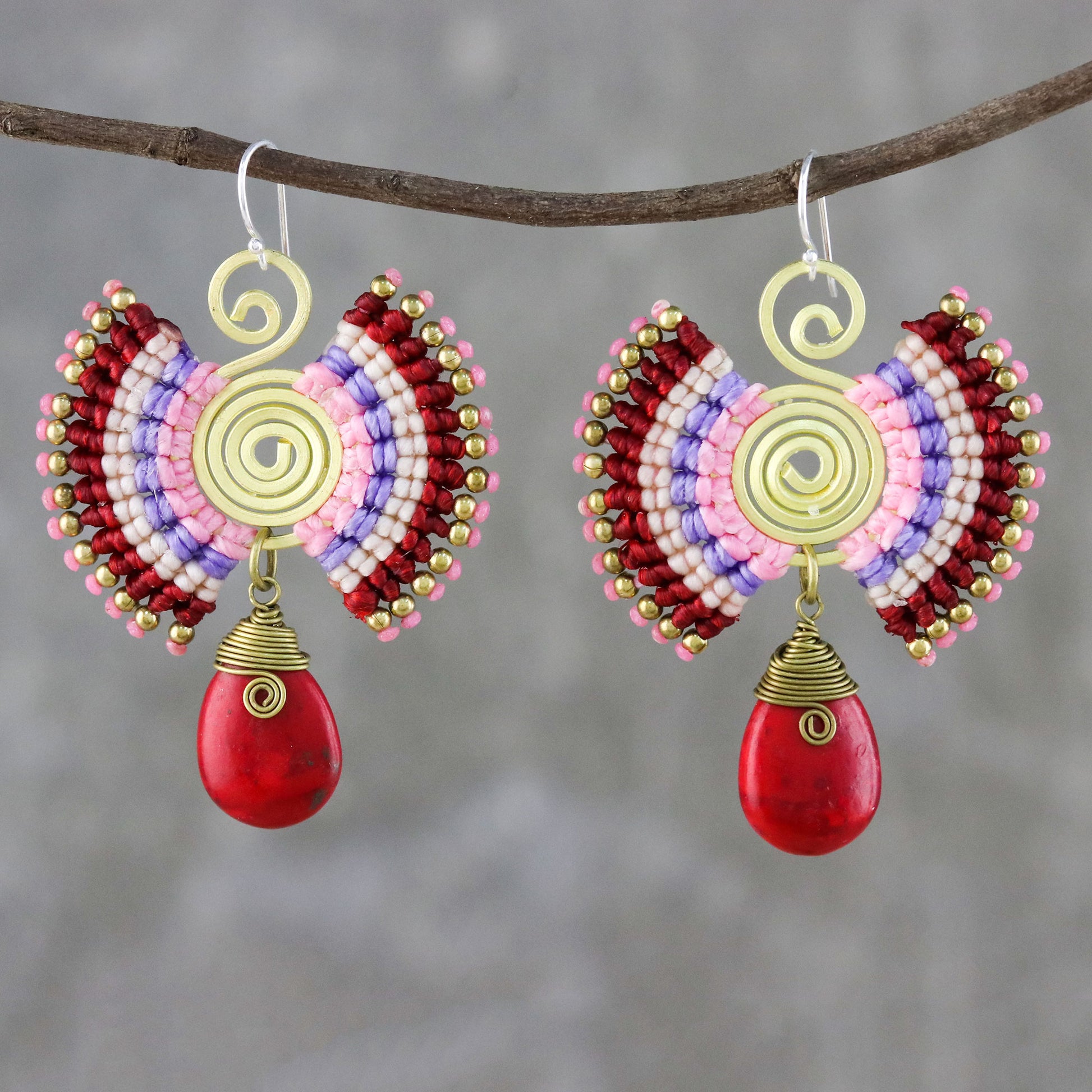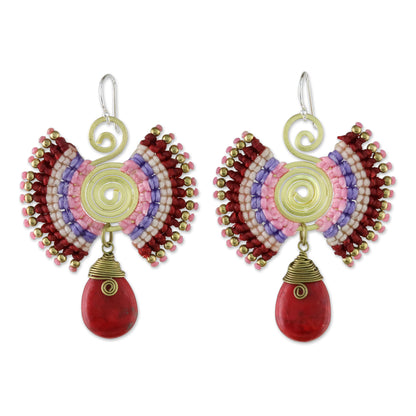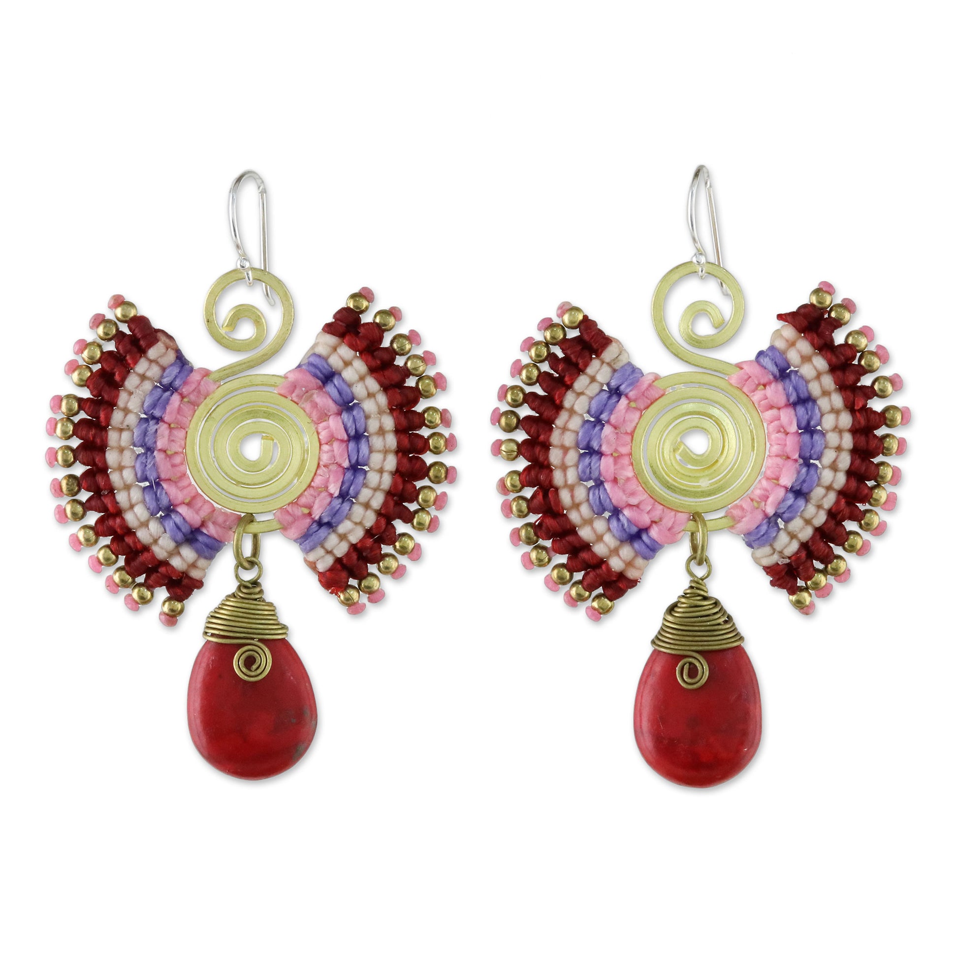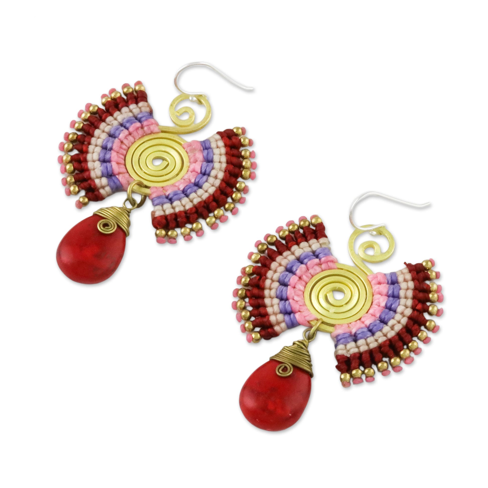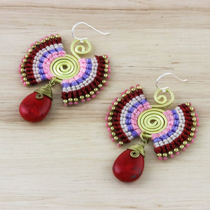 Handcrafted with polyester cord in pink, purple, and red that flanks spirals of brass, these dangle earrings evoke the beauty of a moonlit forest. Thai artisan Nareerat designs the earrings, complete with petite beads of brass at the ends and teardrops of passionate red calcite that dangle below. Each earring dangles from a sterling silver hook.