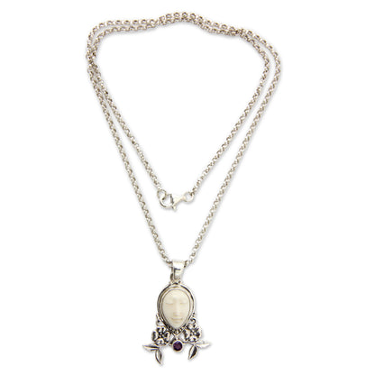 Appearing in white, Mother Earth rests on a bed of sterling silver jasmines. They are bathed by an amethyst dewdrop in the exclusive design by Buana. The necklace is crafted by hand featuring a cow bone pendant.