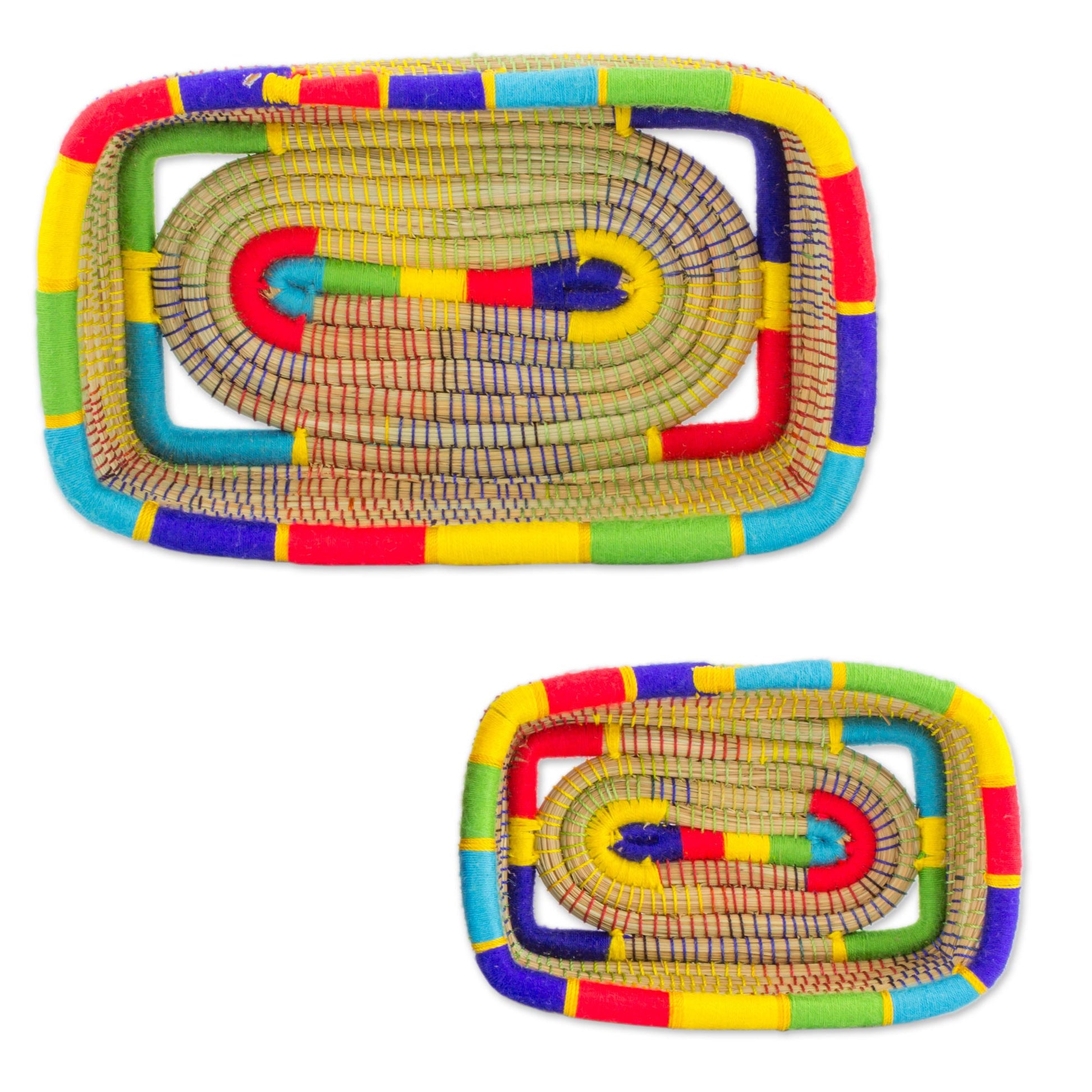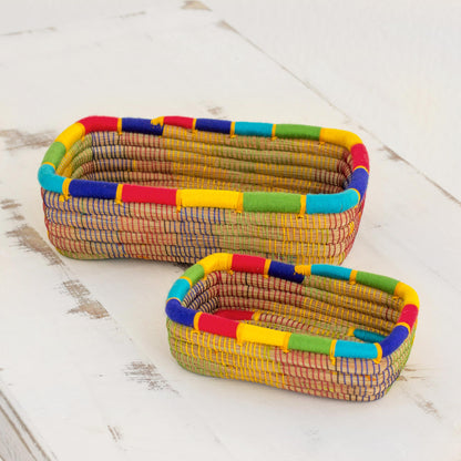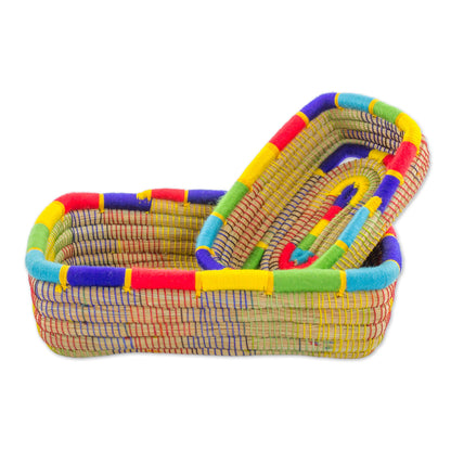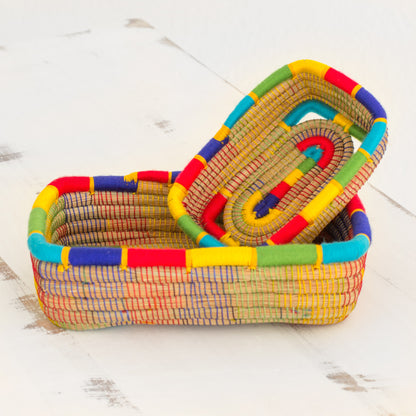 Multicolored Managua Two Rainbow Trim Nicaraguan Handwoven Pine Needle Baskets