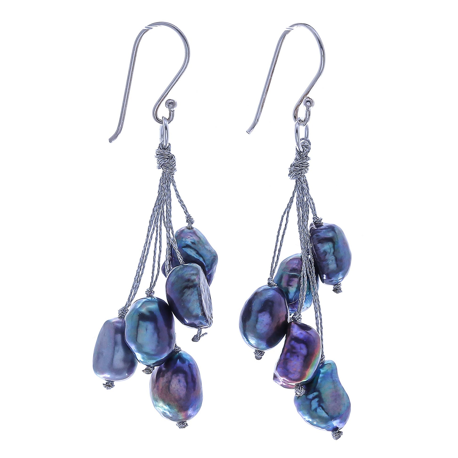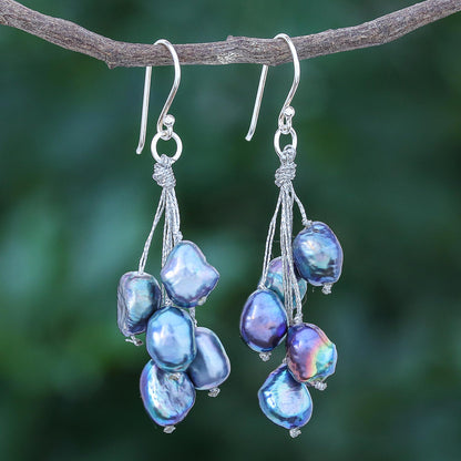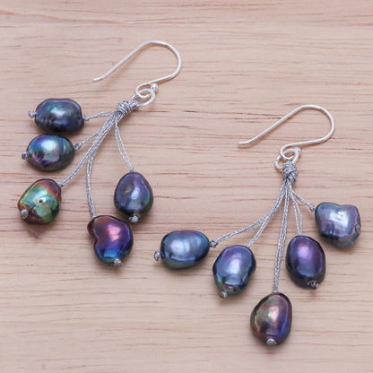 Drape yourself in glowing pearls with these exquisite dangle earrings designed and crafted by Thailand's Matta. The artisan hand threads peacock blue cultured freshwater pearls with multiple strands of metallic nylon cord, while sterling silver hooks finish the pretty pair in style.